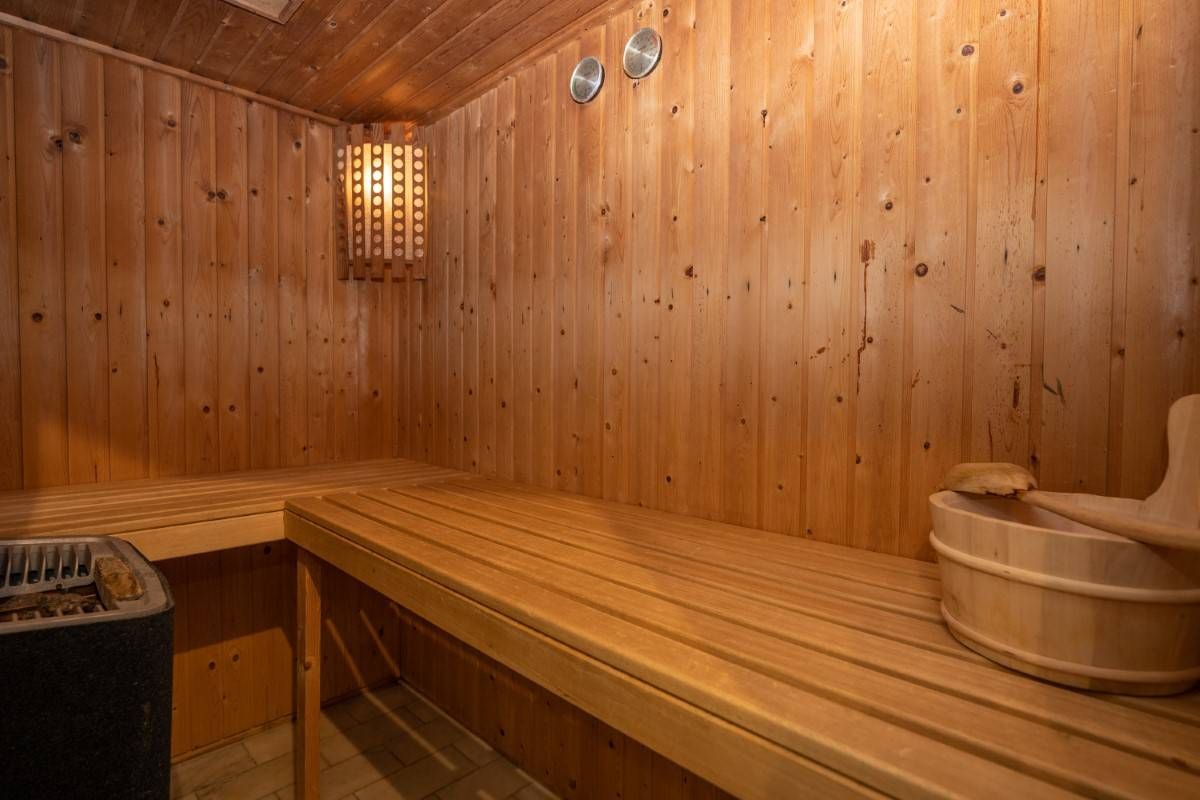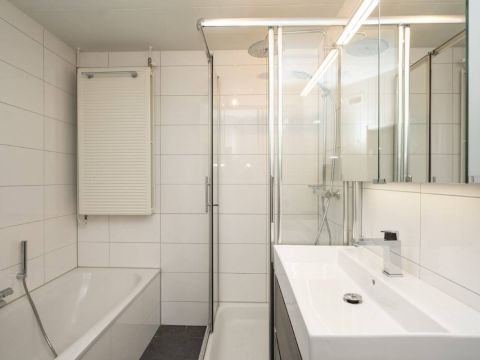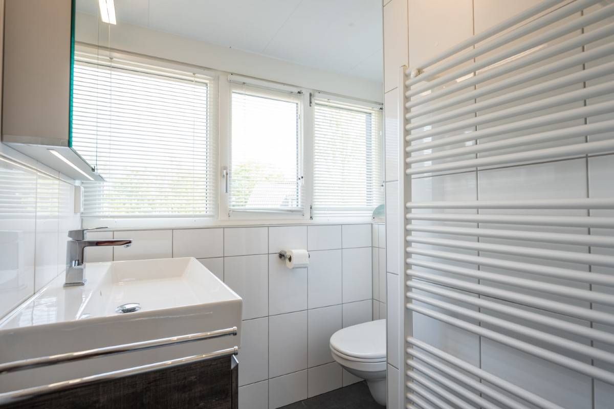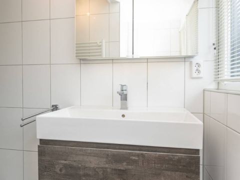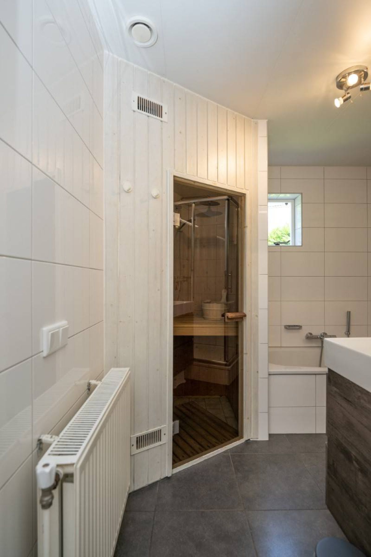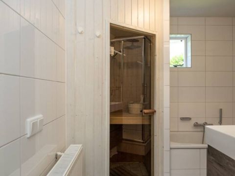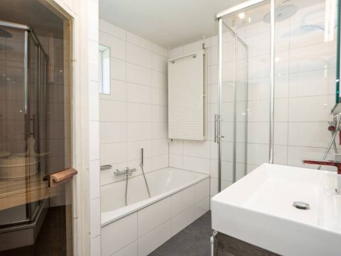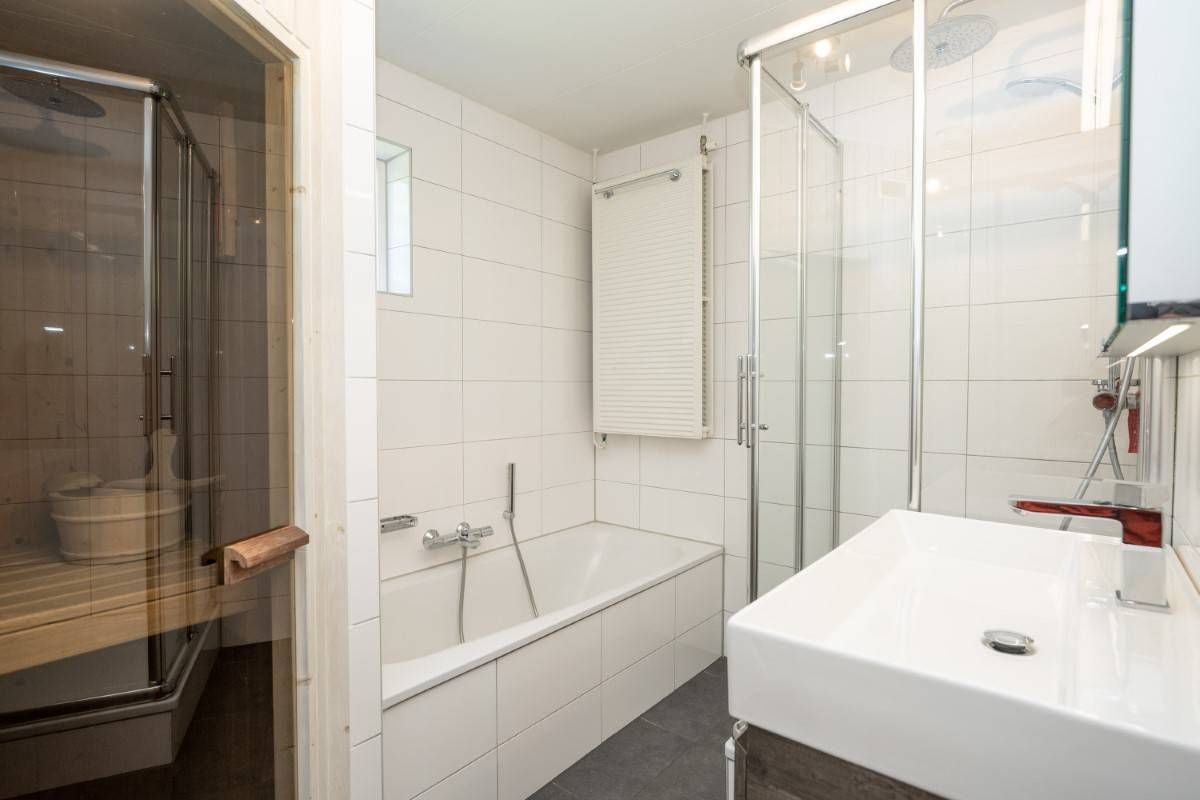 De royale en moderne badkamer is voorzien van ligbad, douchecabine, wastafelmeubel én heerlijke sauna!