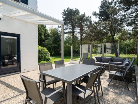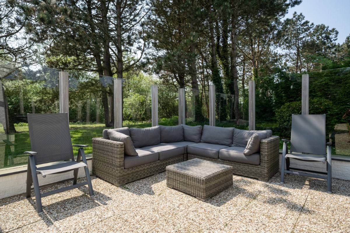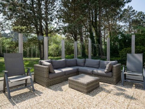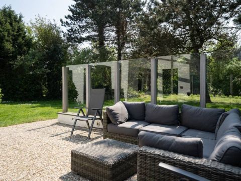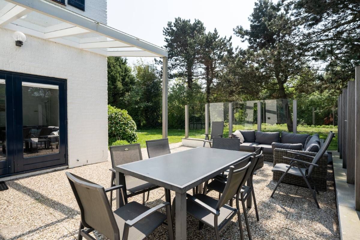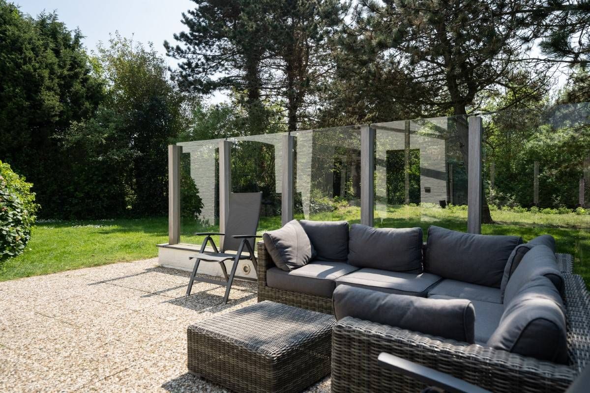 Op het royale (beschutte) terras aan de achterzijde is het heerlijk genieten van de zon. Maar wordt het u te warm dan zijn er ook diverse schaduwplekken te vinden. Het terras is grotendeels omringd door een glazen winscherm en is voorzien van verlichting.
