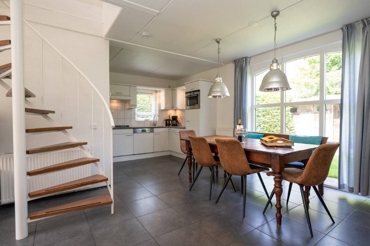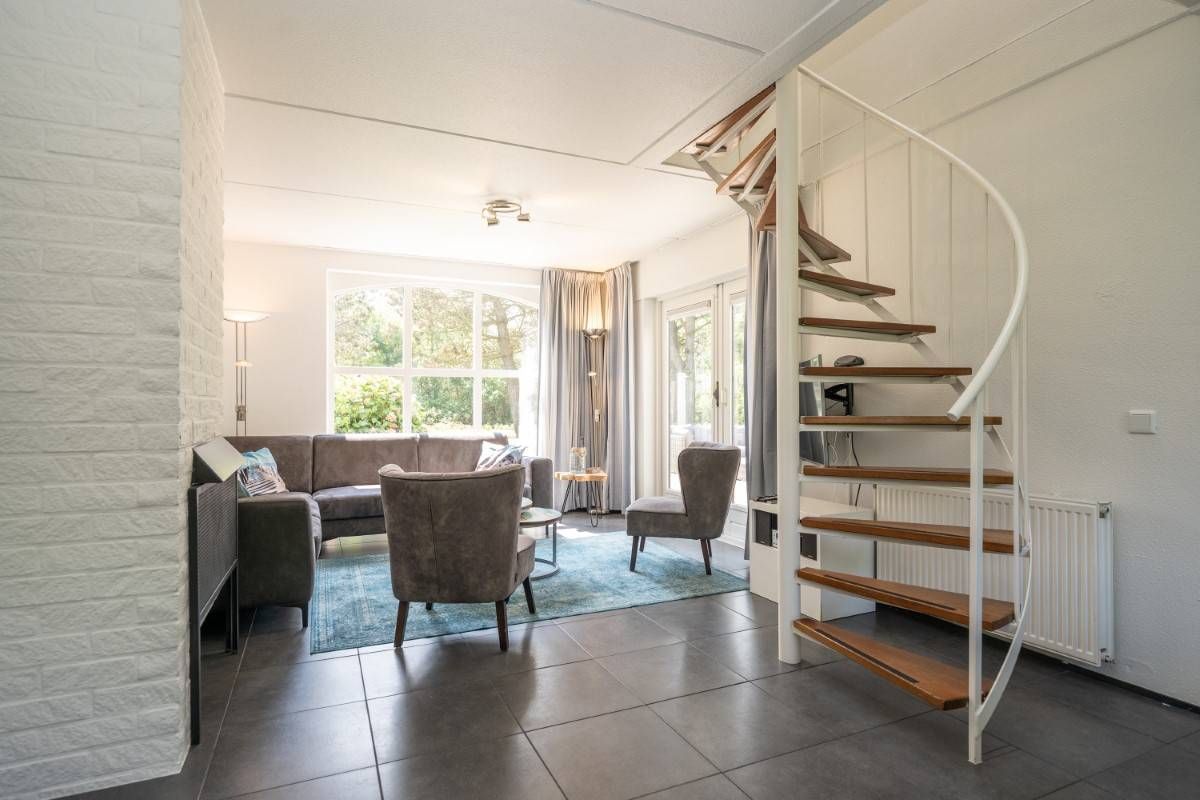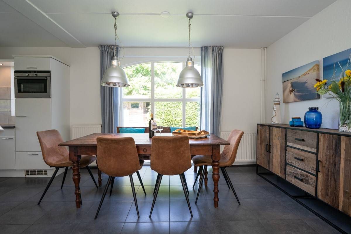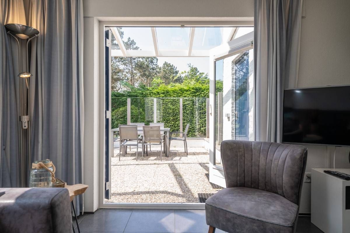 De tuingerichte woonkamer heeft een mooie lichtinval, is smaakvol ingericht en voorzien van een openhaard. Middels de openslaande deuren bereikt u het beschutte terras waar u ook heerlijk onder de luifel kunt zitten.