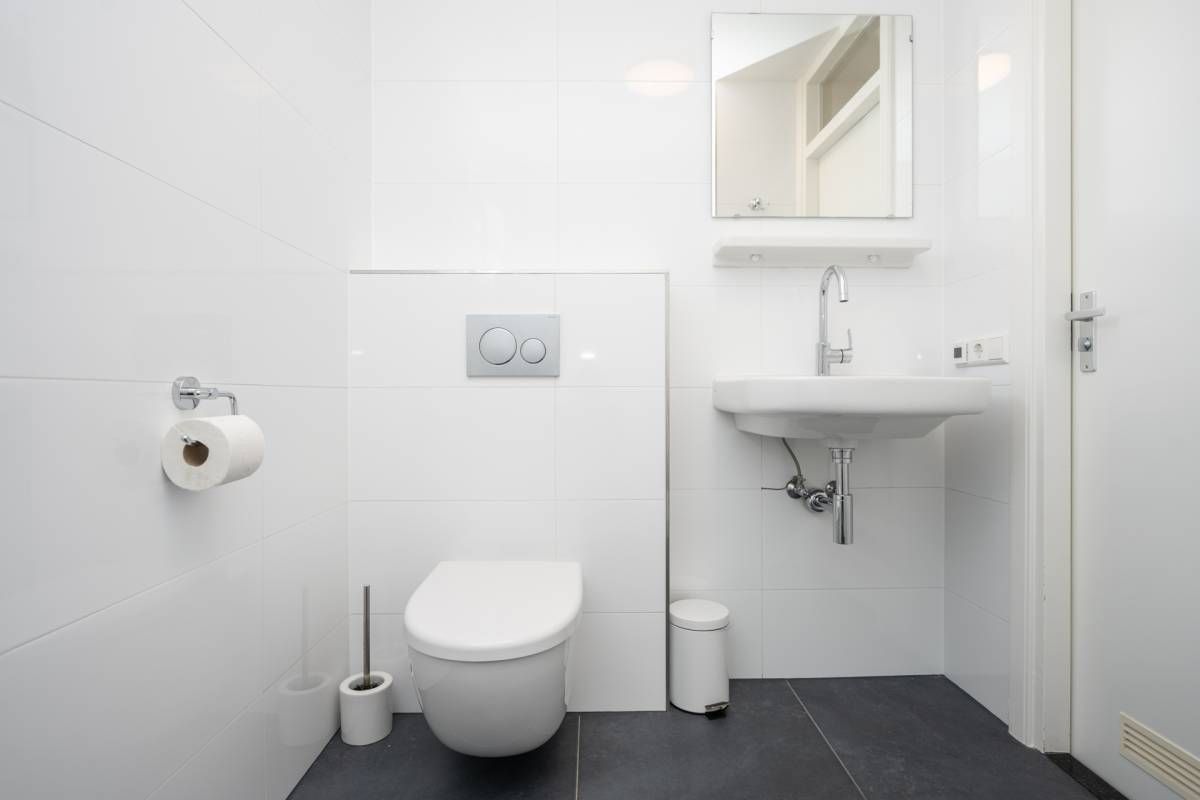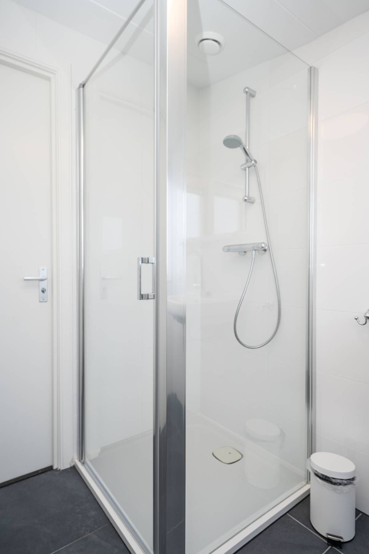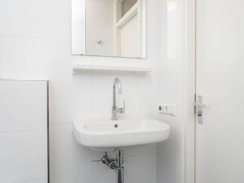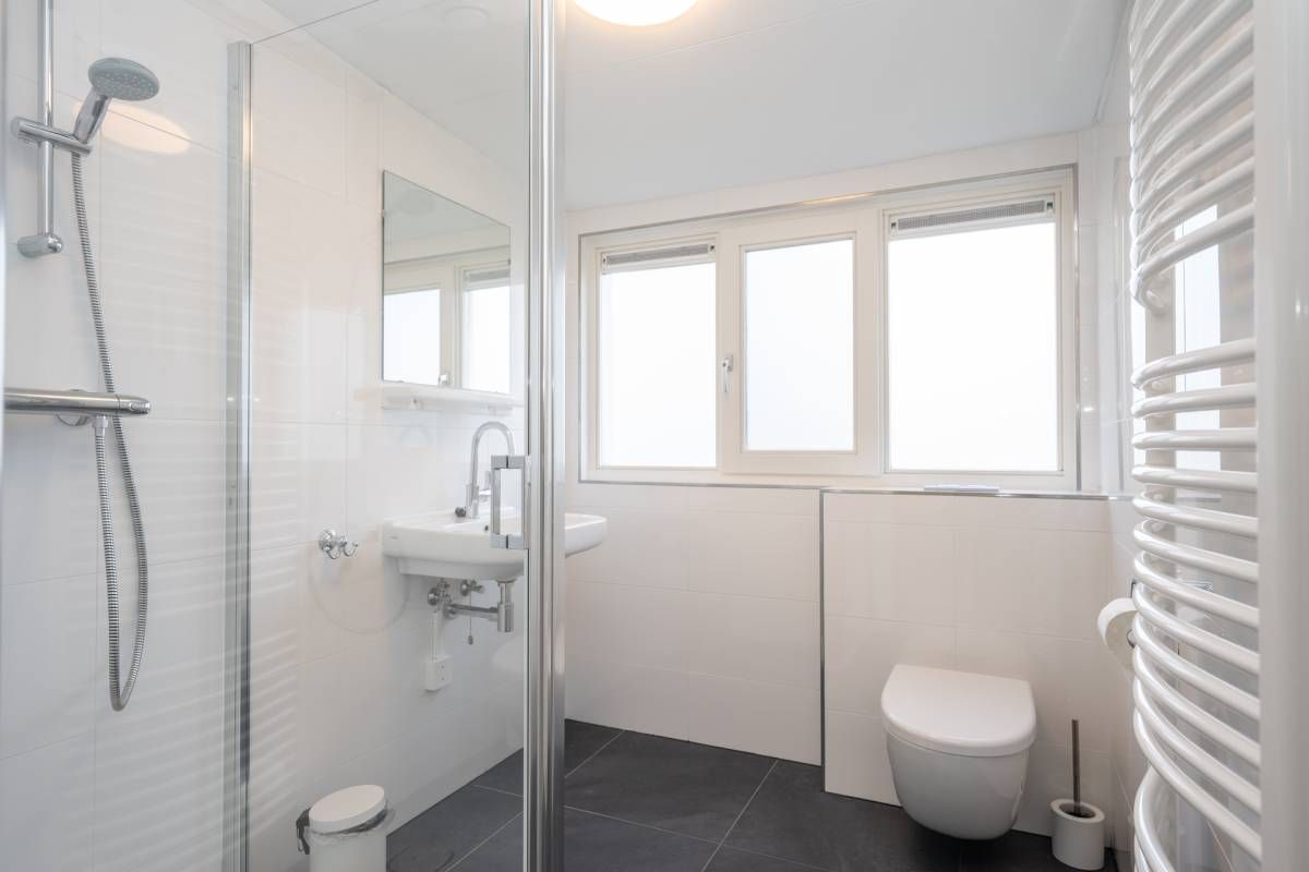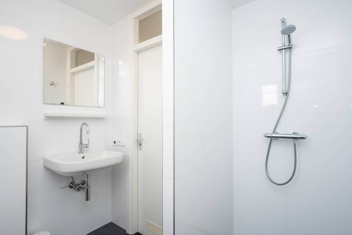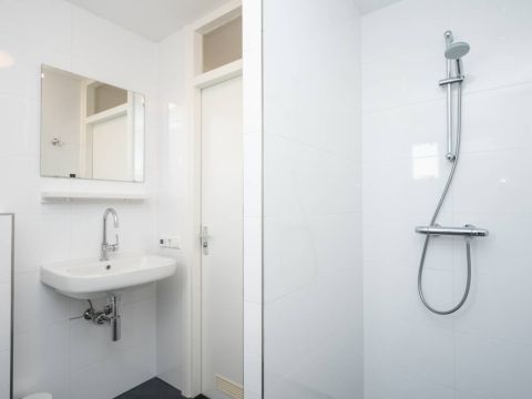 De badkamer is netjes uitgevoerd en beschikt over een inloopdouche, wastafel en toilet.
