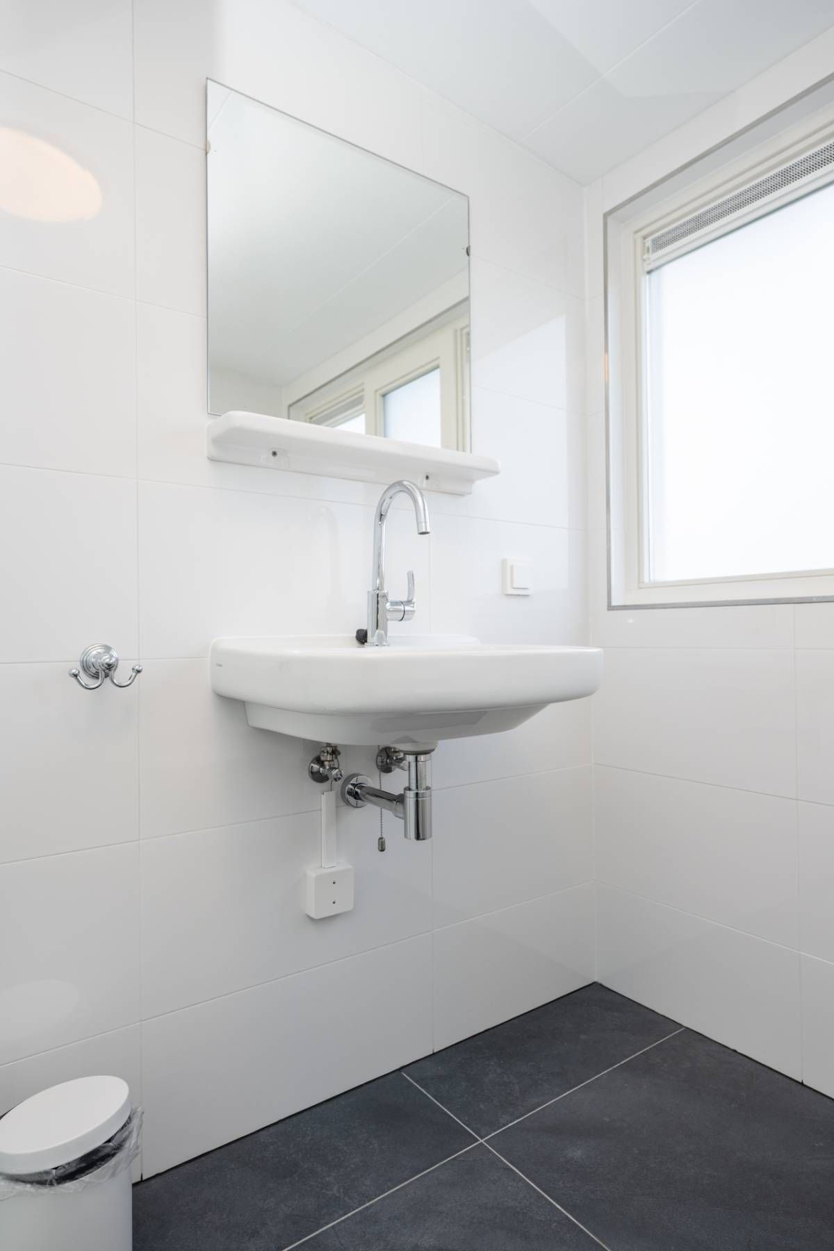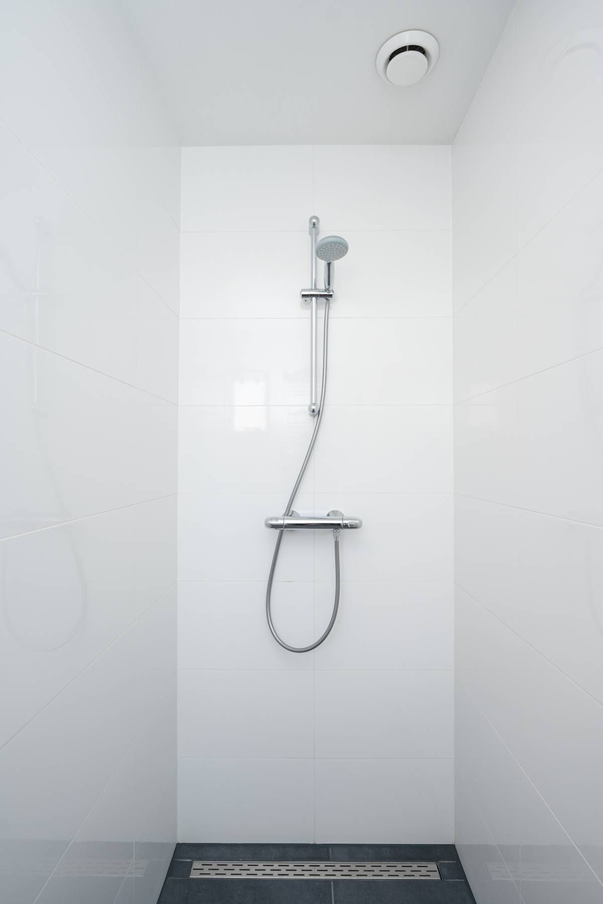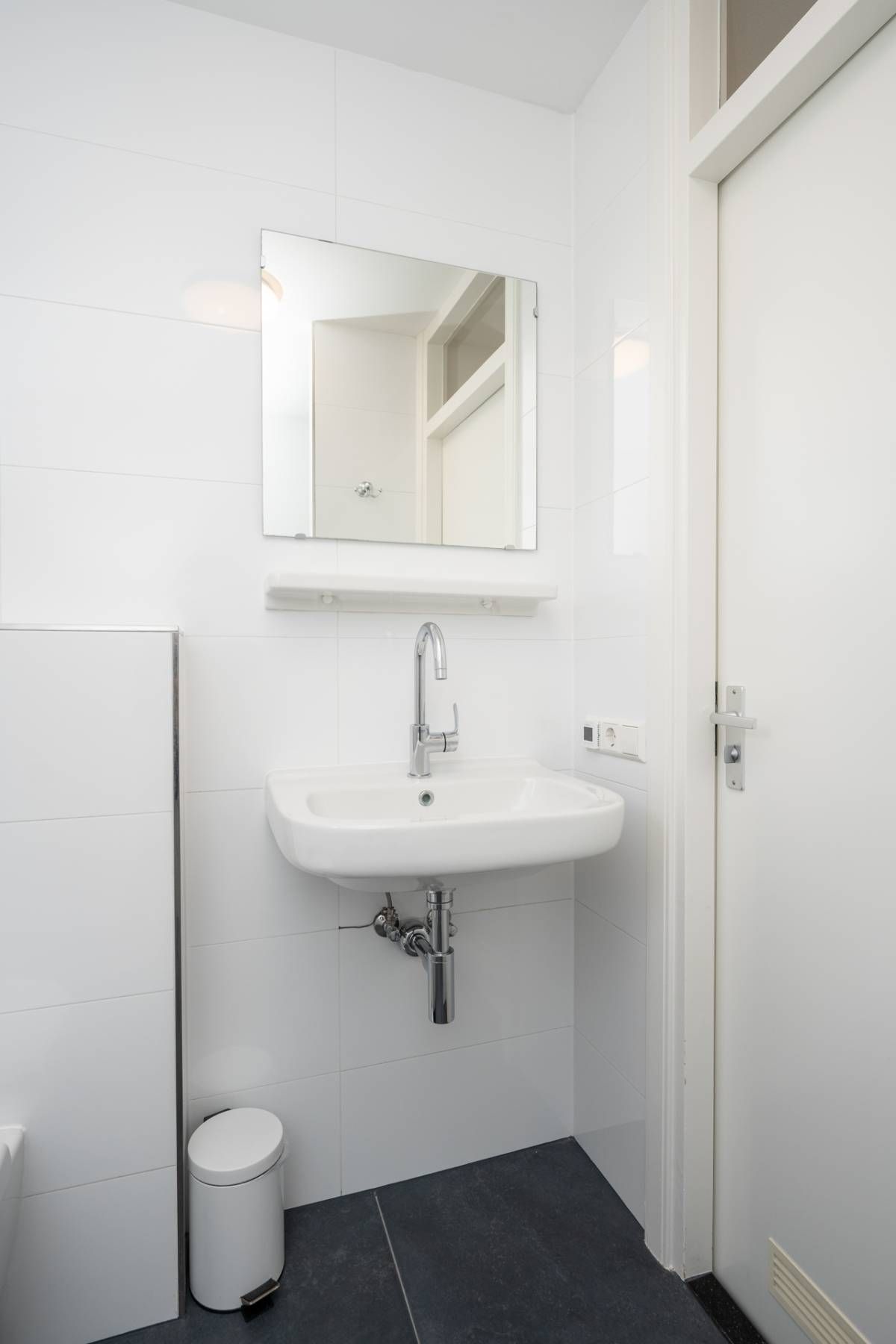 De badkamer is netjes uitgevoerd en beschikt over een inloopdouche, wastafel en toilet.