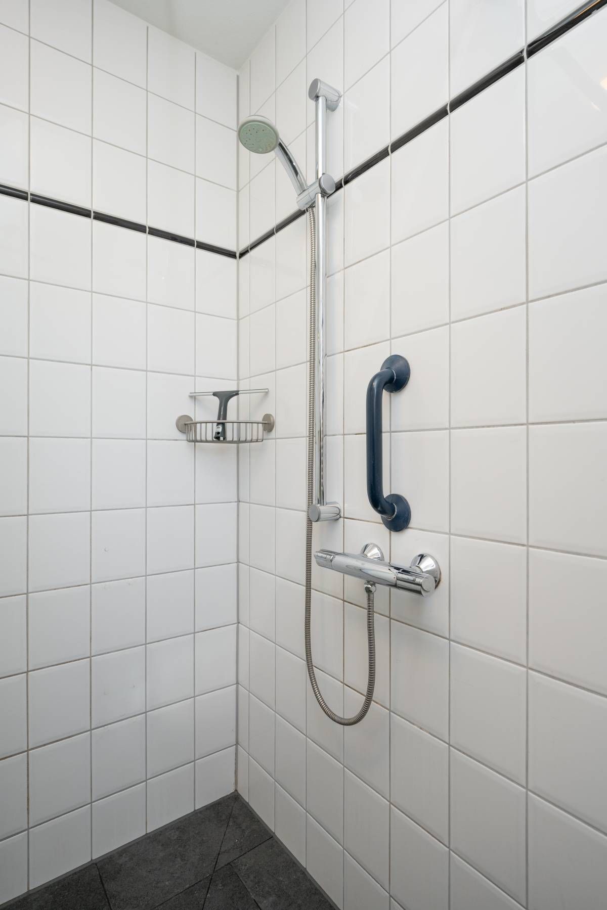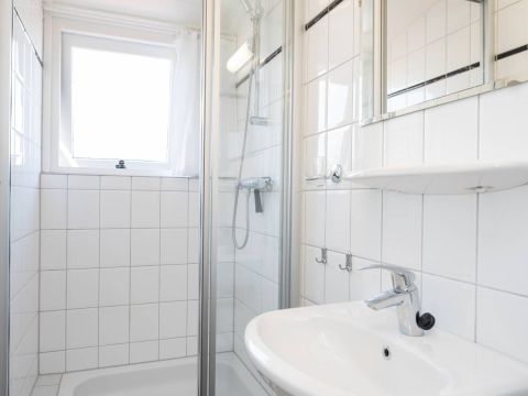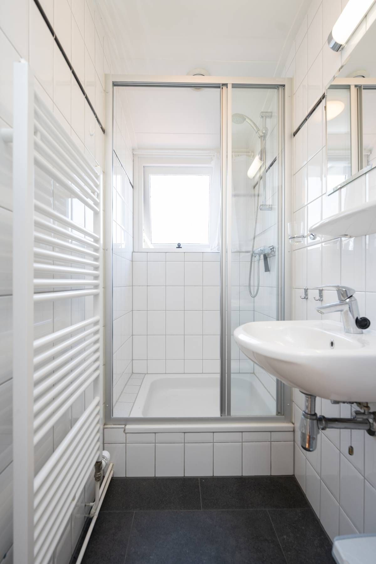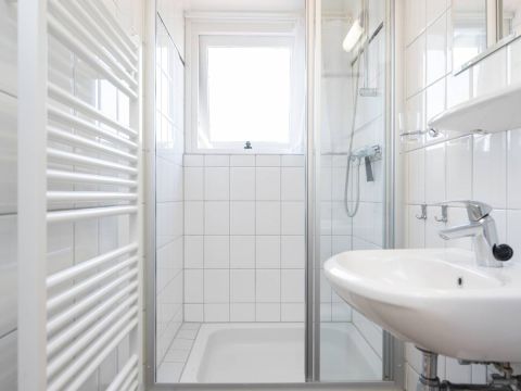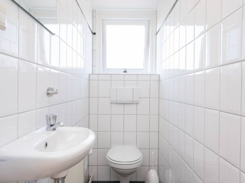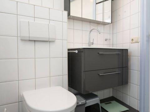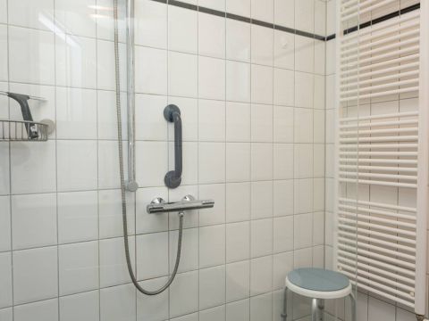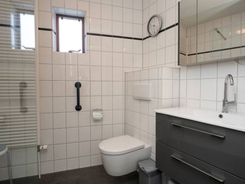 De nette badkamer op de begane grond is tevens geschikt voor mindervalide en is voorzien van een wastafelmeubel, toilet, douche en design radiator.