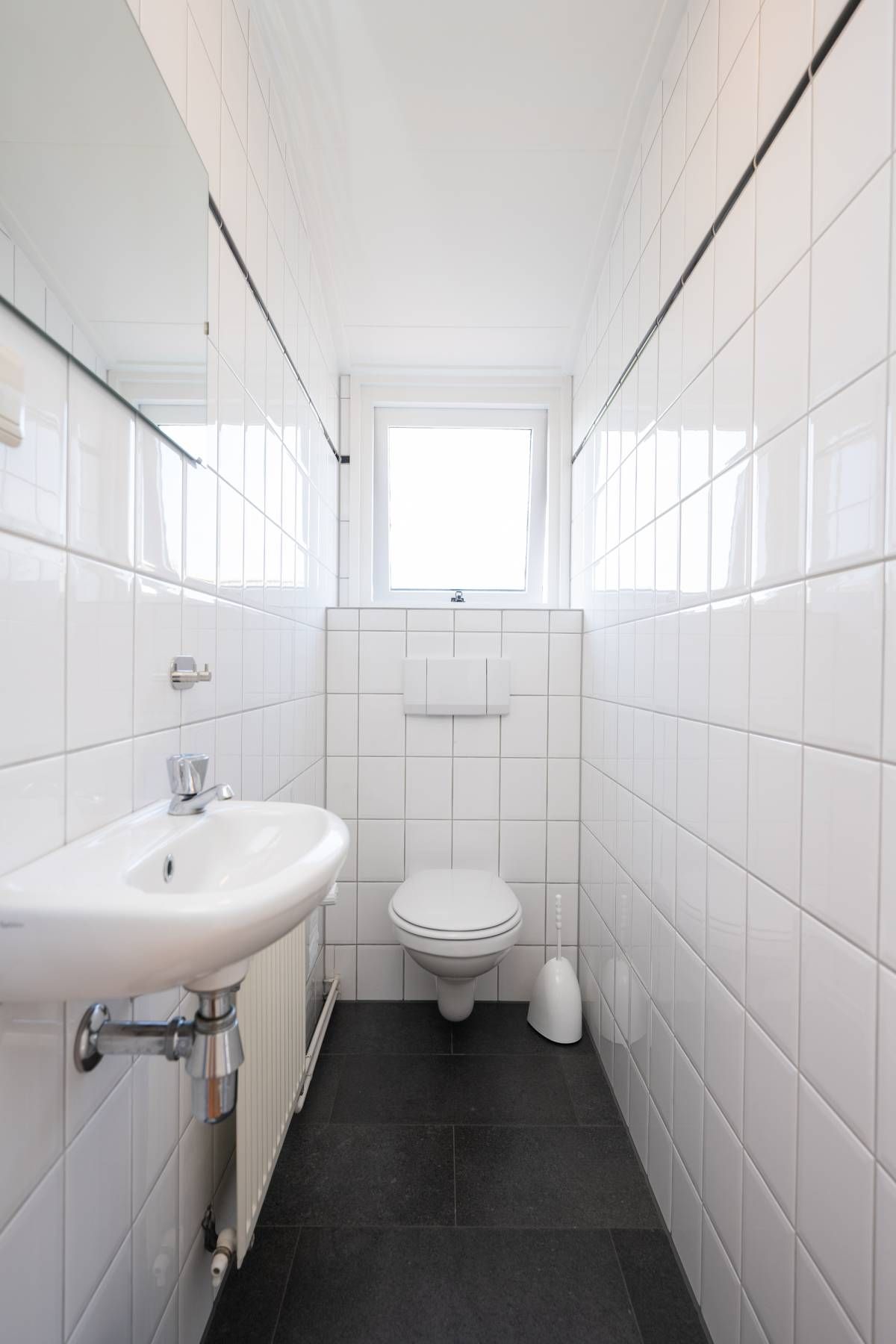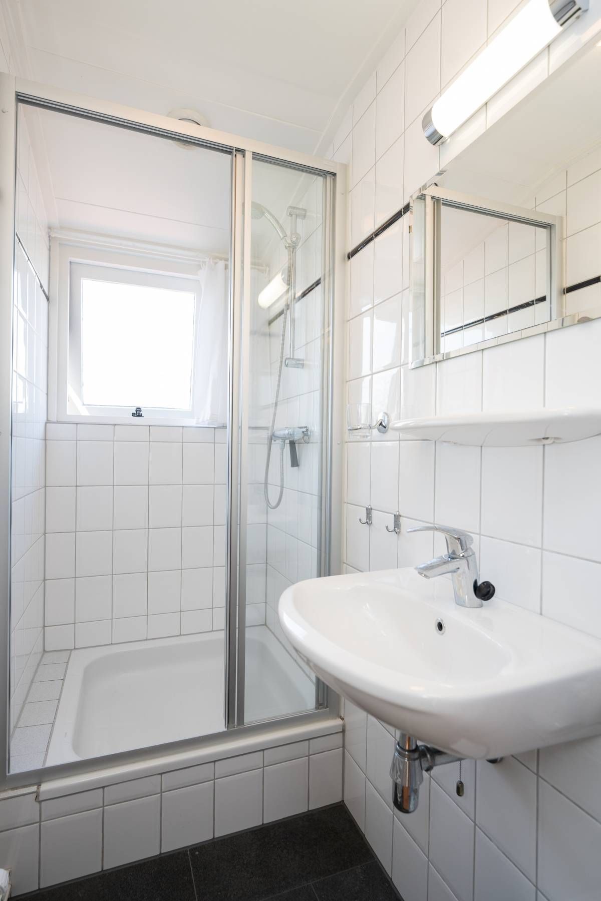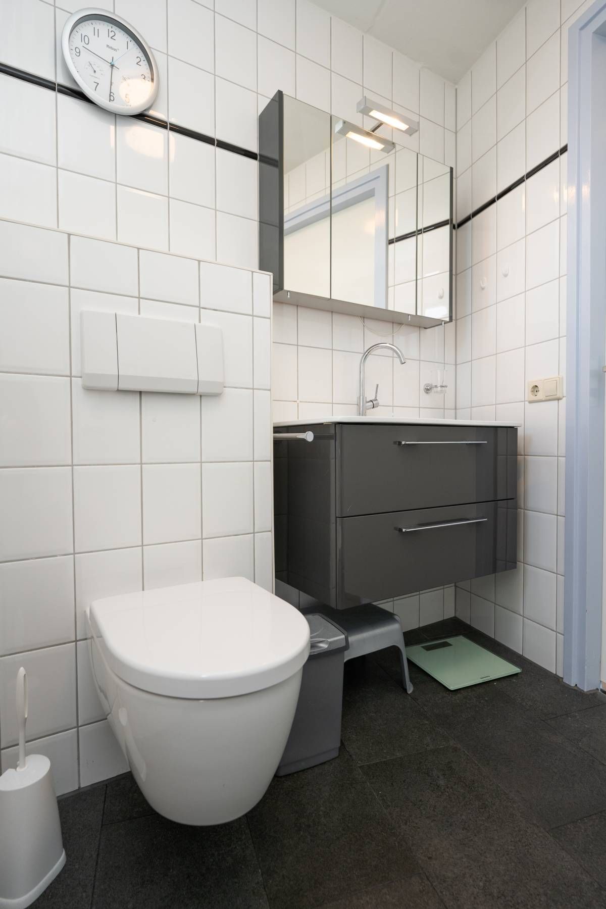 De nette badkamer op de begane grond is tevens geschikt voor mindervalide en is voorzien van een wastafelmeubel, toilet, douche en design radiator.