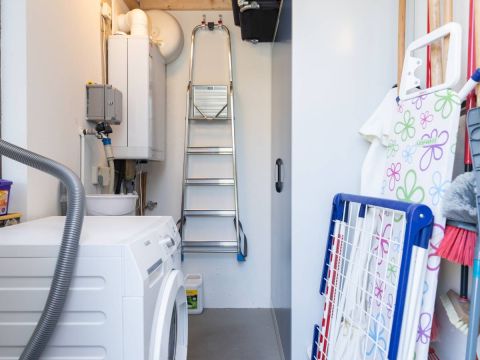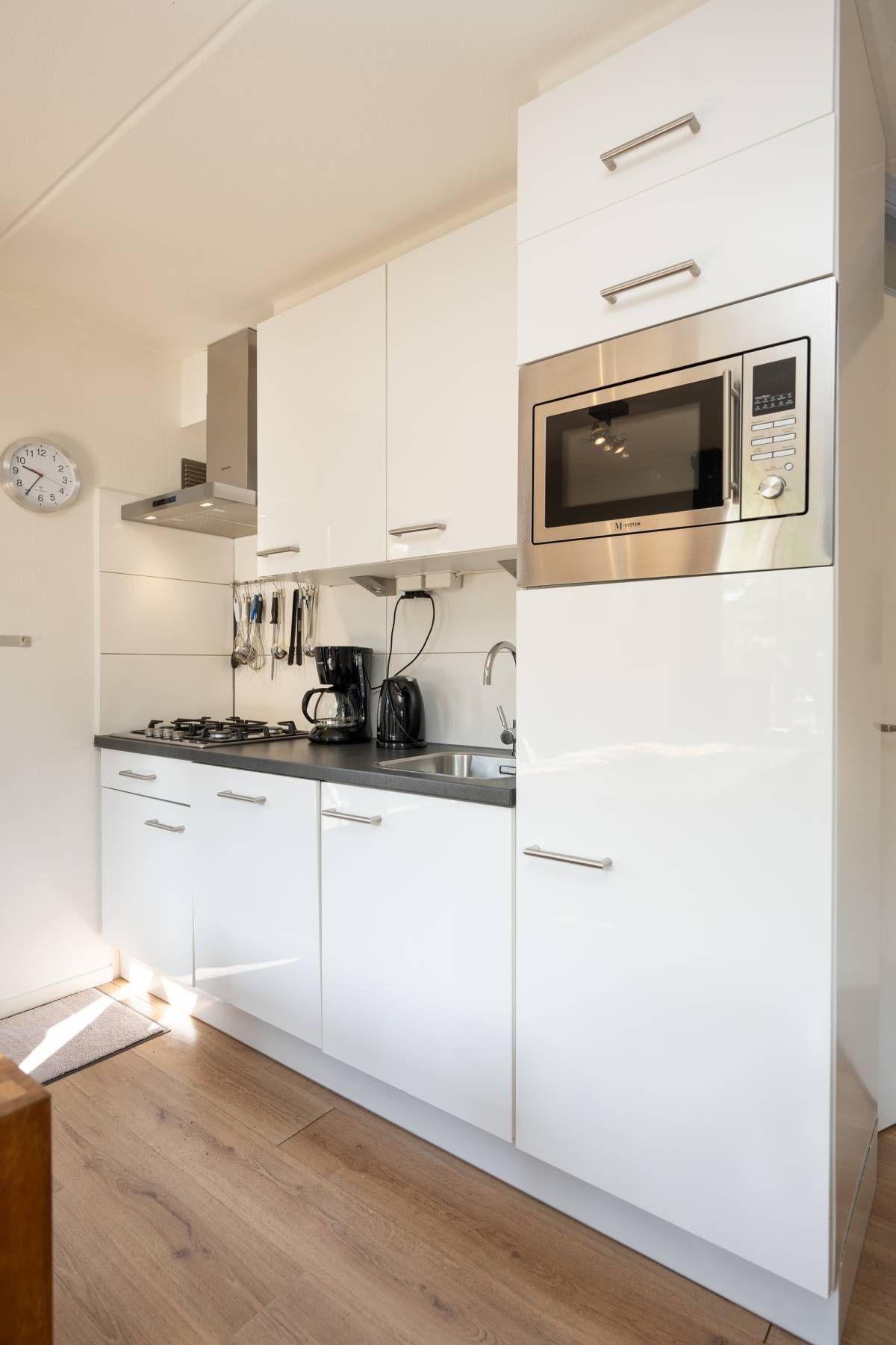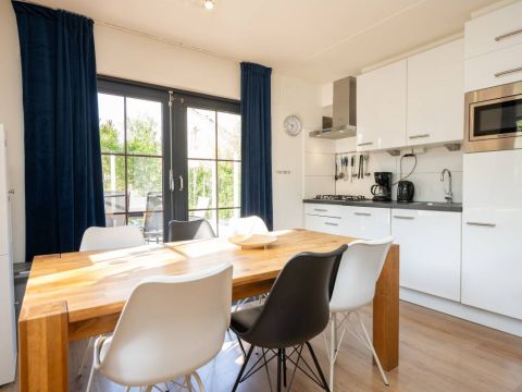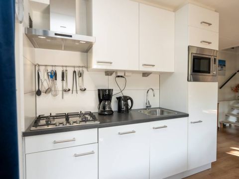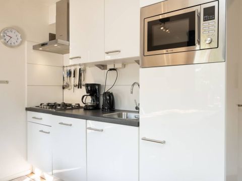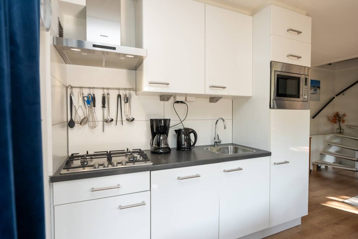 De keurige open keuken is van alle gemakken voorzien. Denk aan een combimagnetron, een gasfornuis met bijpassende afzuigkap, een koelkast, een vaatwasser én voldoende opbergruimte. Alles wat je nodig hebt om met plezier te koken en te genieten!