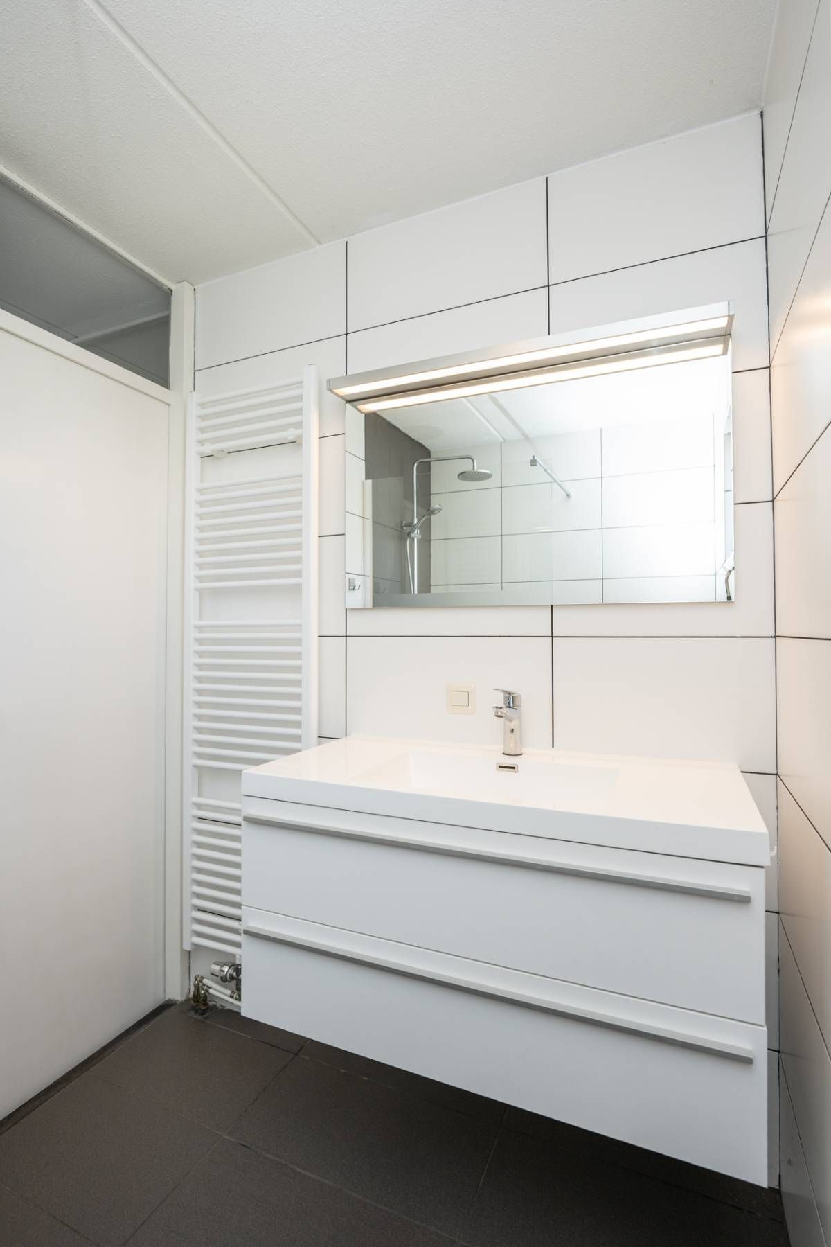 De stijlvolle badkamer op de begane grond heeft een comfortabele inloopdouche met stortdouche, een modern wastafelmeubel en een designradiator. Een nette, praktische ruimte.