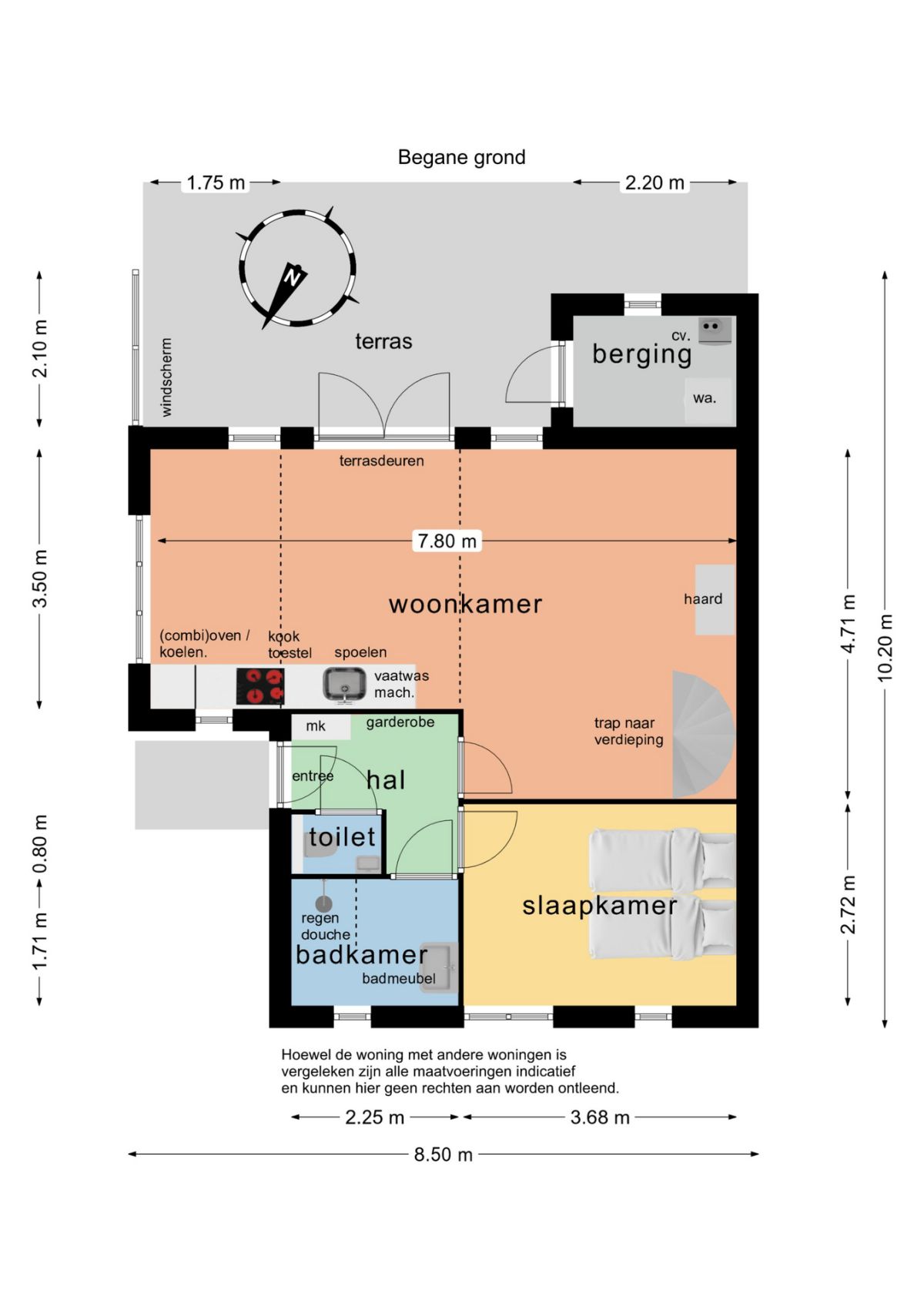 Via de entree komt je in de hal, die toegang biedt tot de woonkamer, een van de slaapkamers en de badkamer.