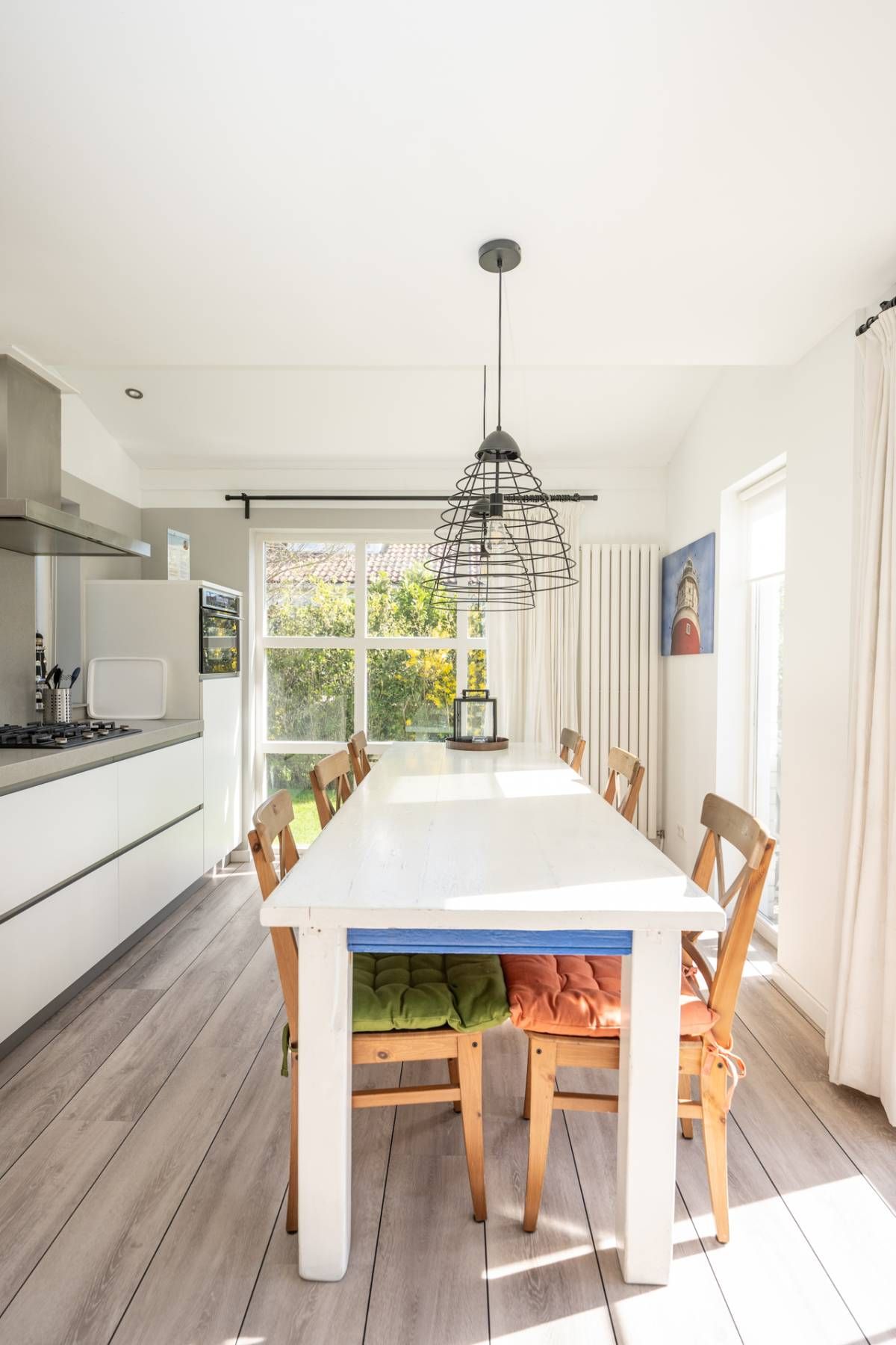 Dankzij de grote raampartijen stroomt het daglicht rijkelijk naar binnen en heb je steeds een prachtig uitzicht op de groene tuin.