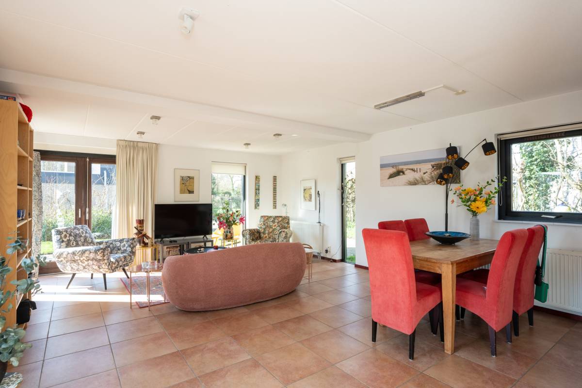 De woning verwelkomt u met een lichte en sfeervolle woonkamer, waarin grote ramen een prachtig uitzicht bieden op de tuin.