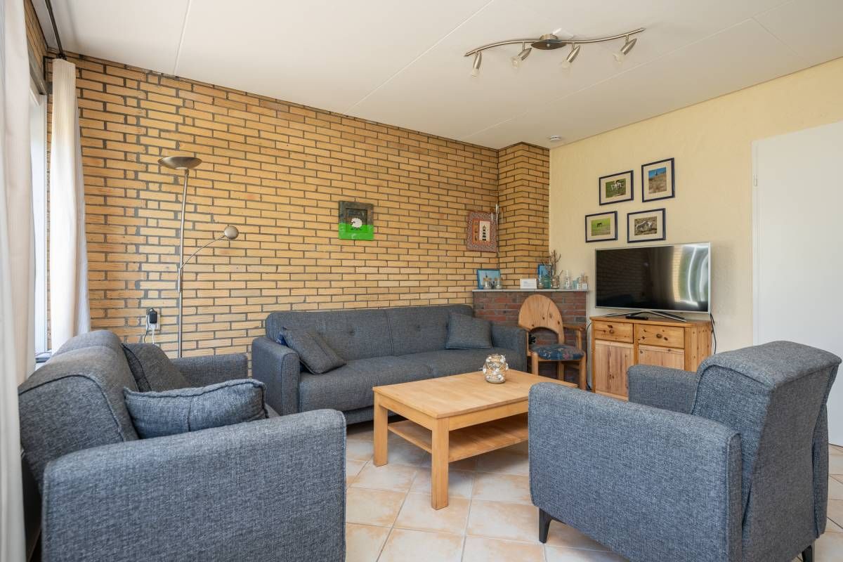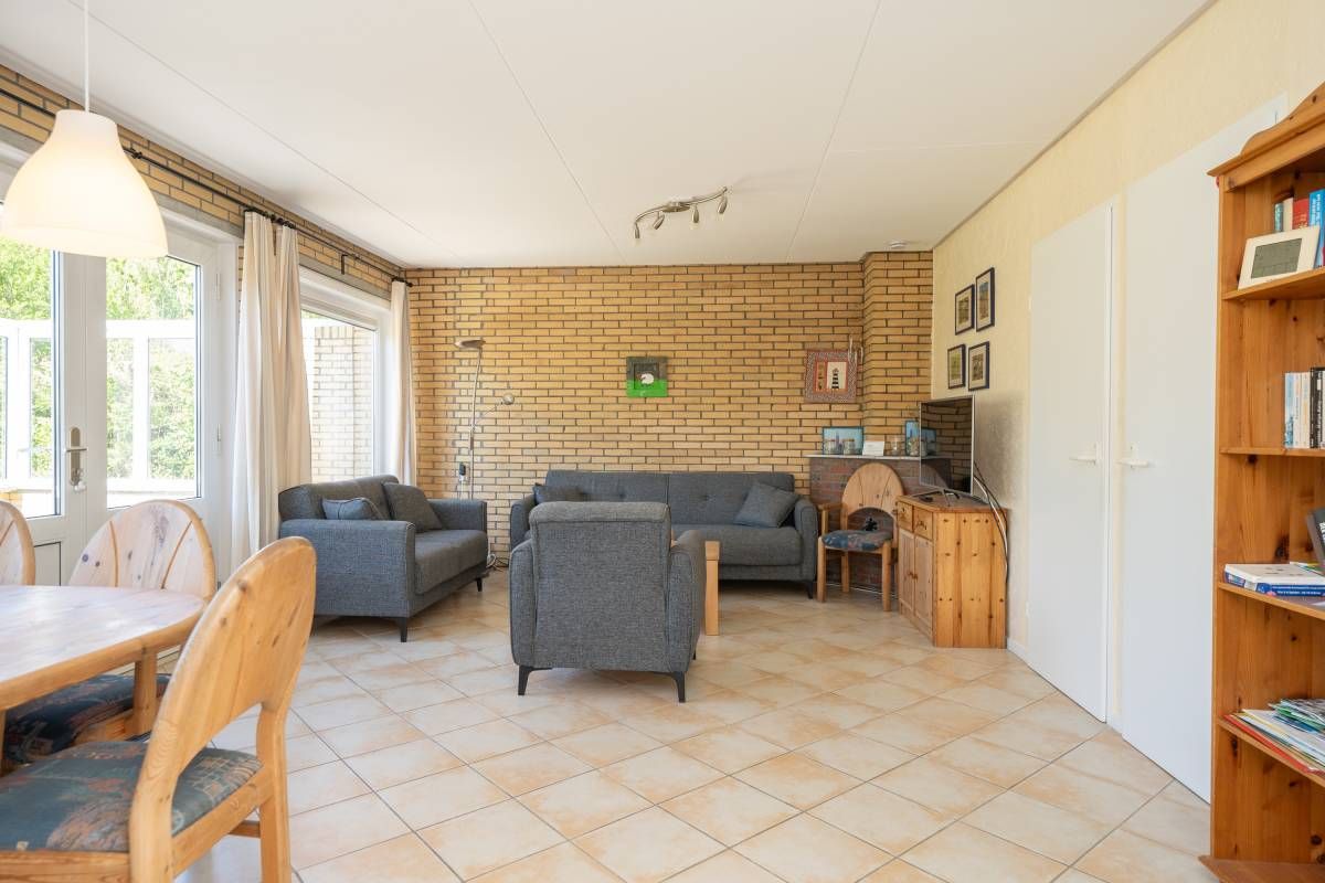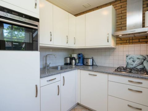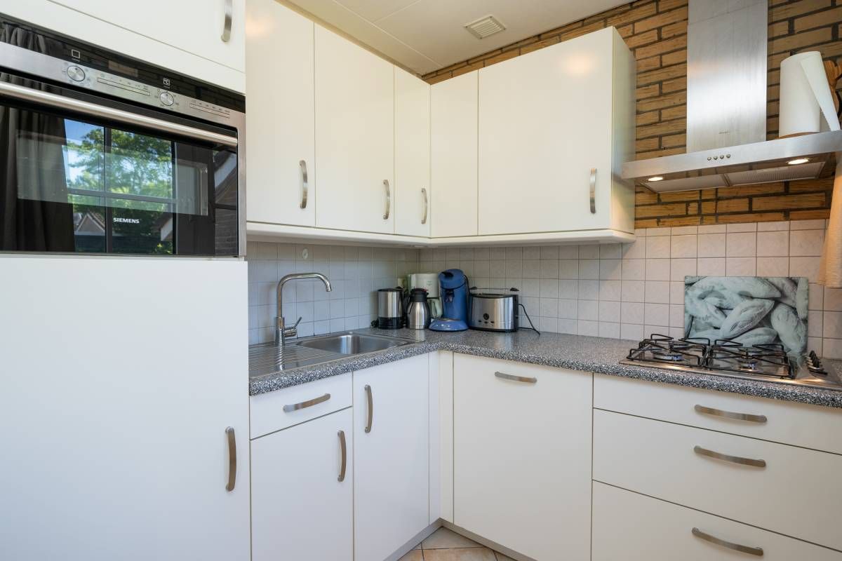 De ruime woonkamer heeft in de hoek een schouw met rookkanaal. De witte open keuken biedt voldoende opbergruimte en is voorzien van een 4-pits gasfornuis, afzuigkap, koel/vries combinatie en Siemenscombi magnetron.