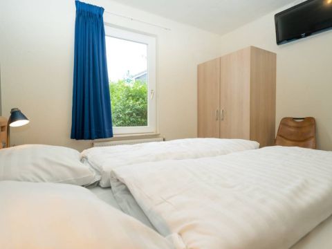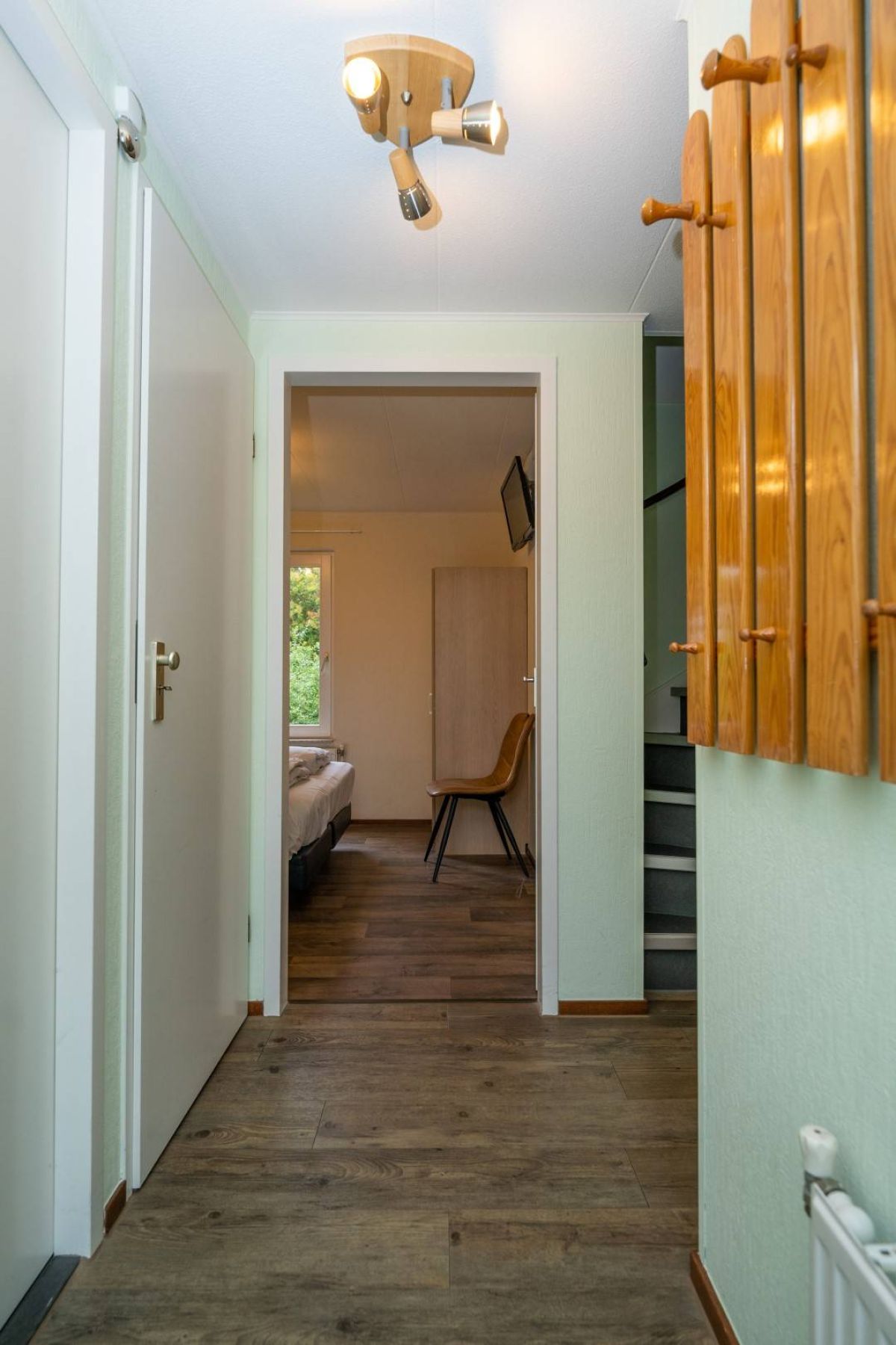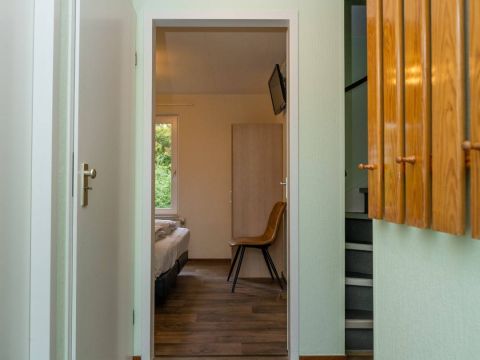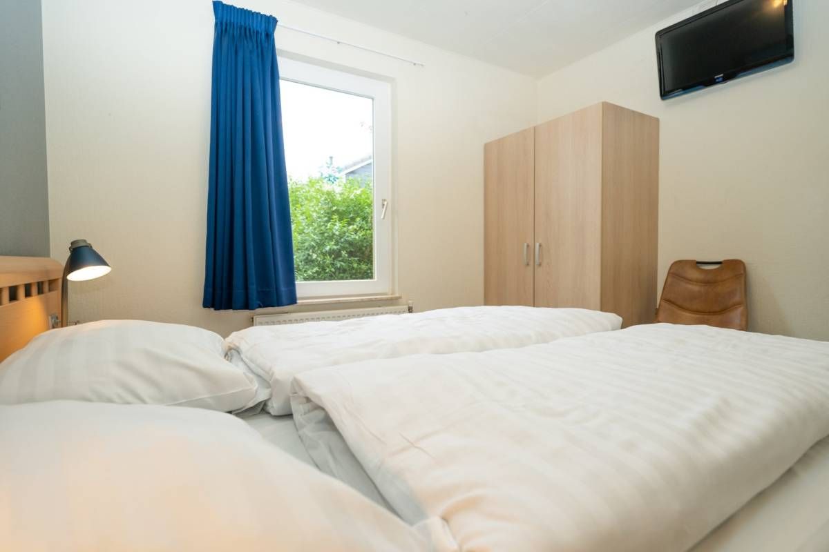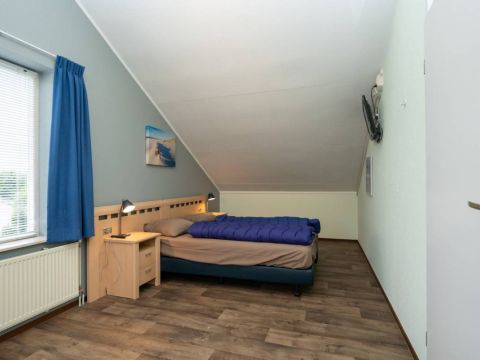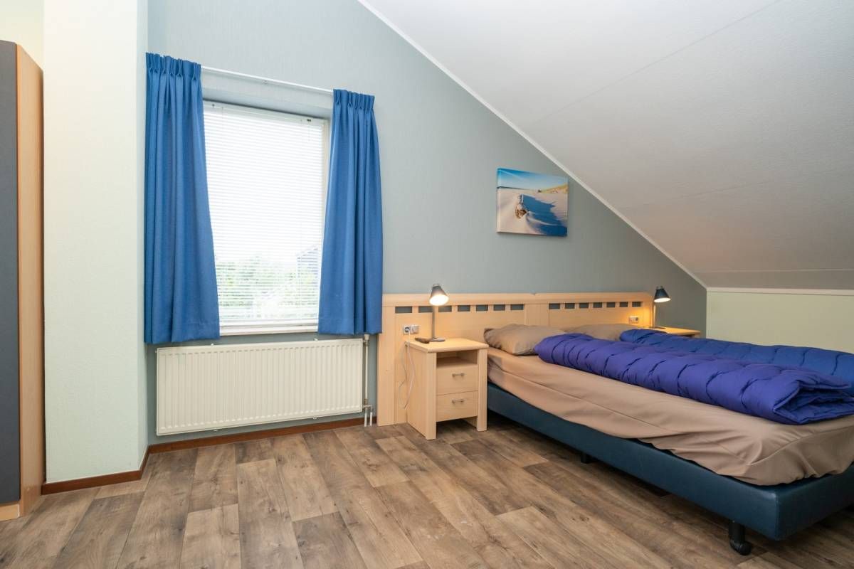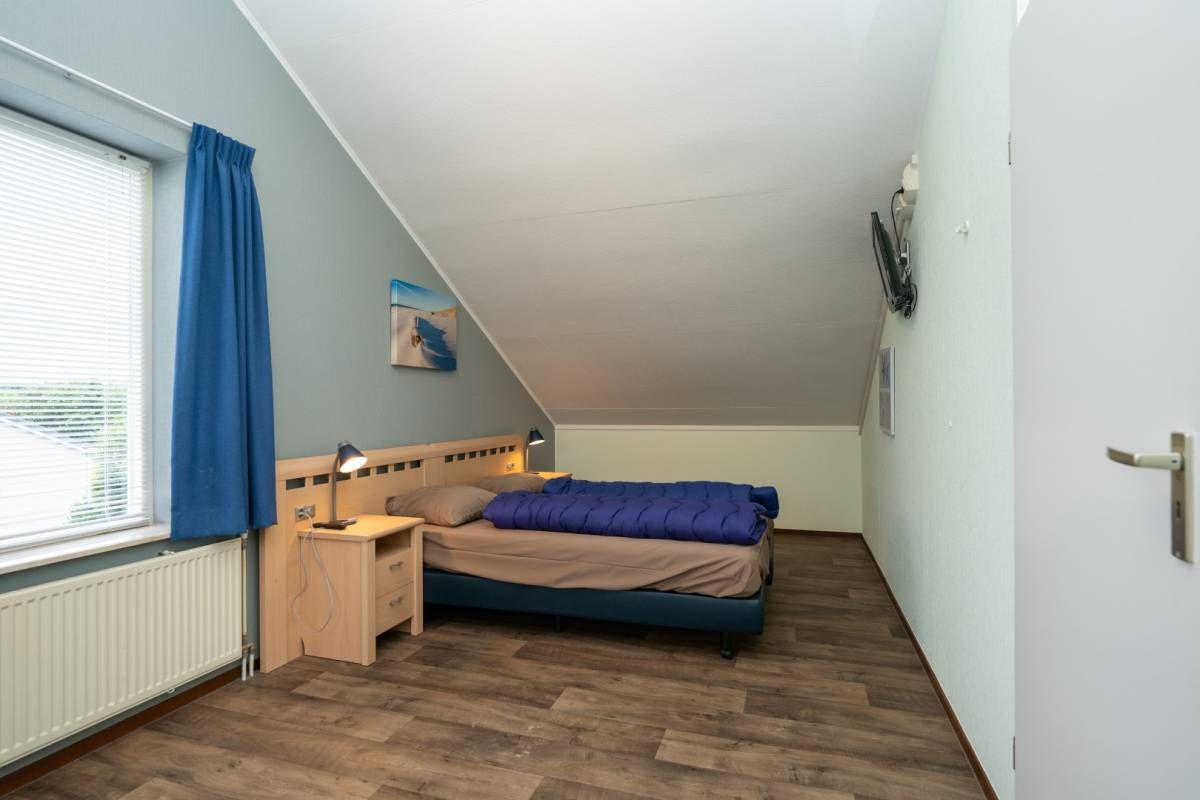 Op de begane grond bevindt zich een fijne slaapkamer met een tweepersoonsbed en voldoende kastruimte.