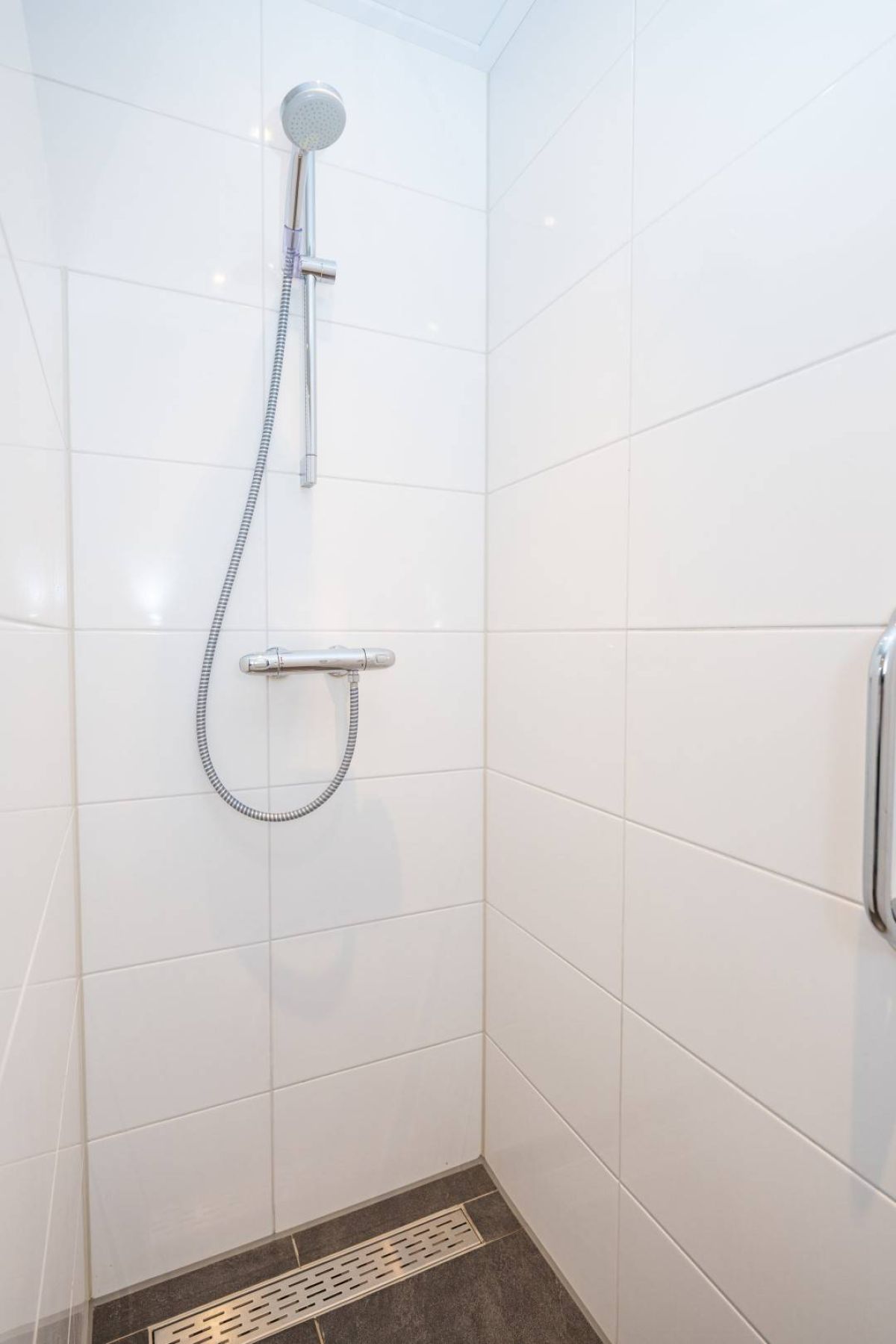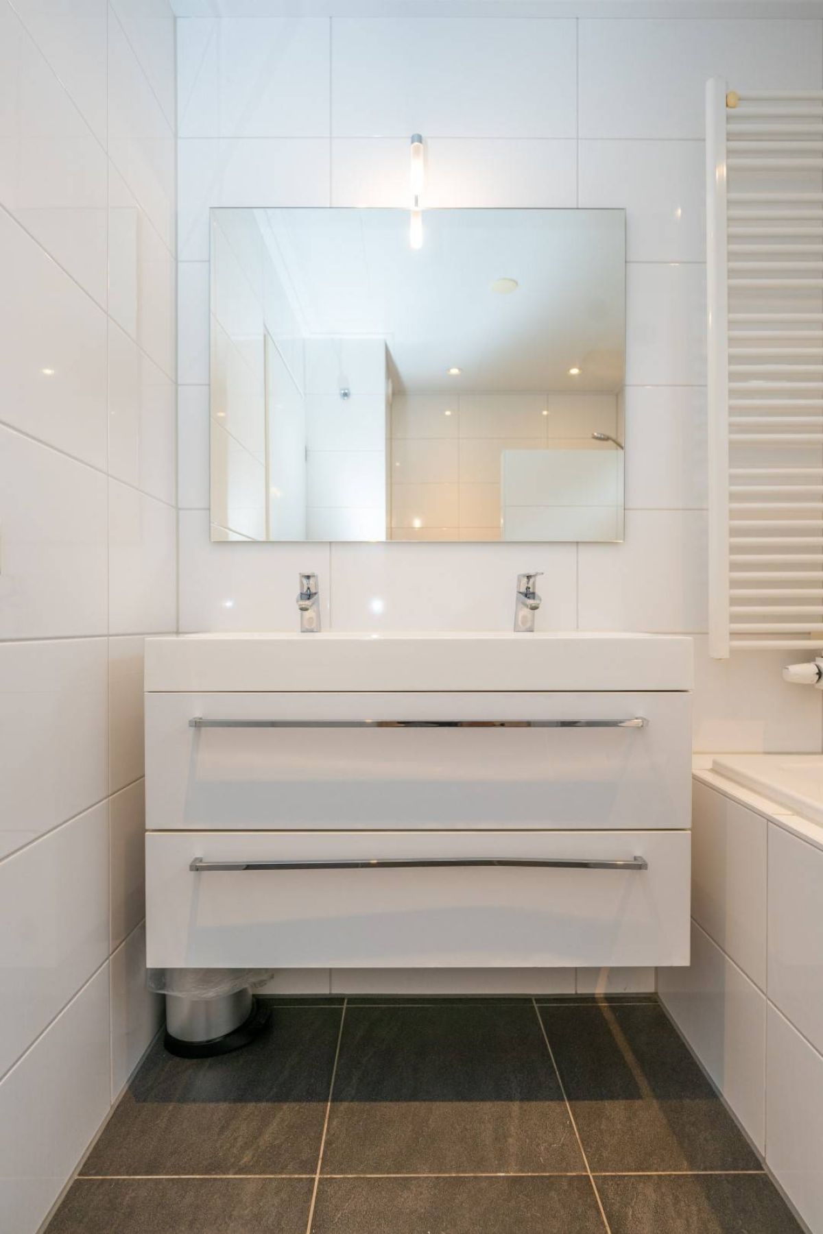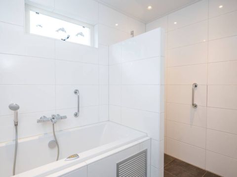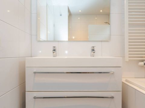 Vanuit de hal tevens toegang tot de moderne badkamer welke is voorzien van inloopdouche, ligbad (met whirlpool), wastafelmeubel (met lades) en een designradiator.