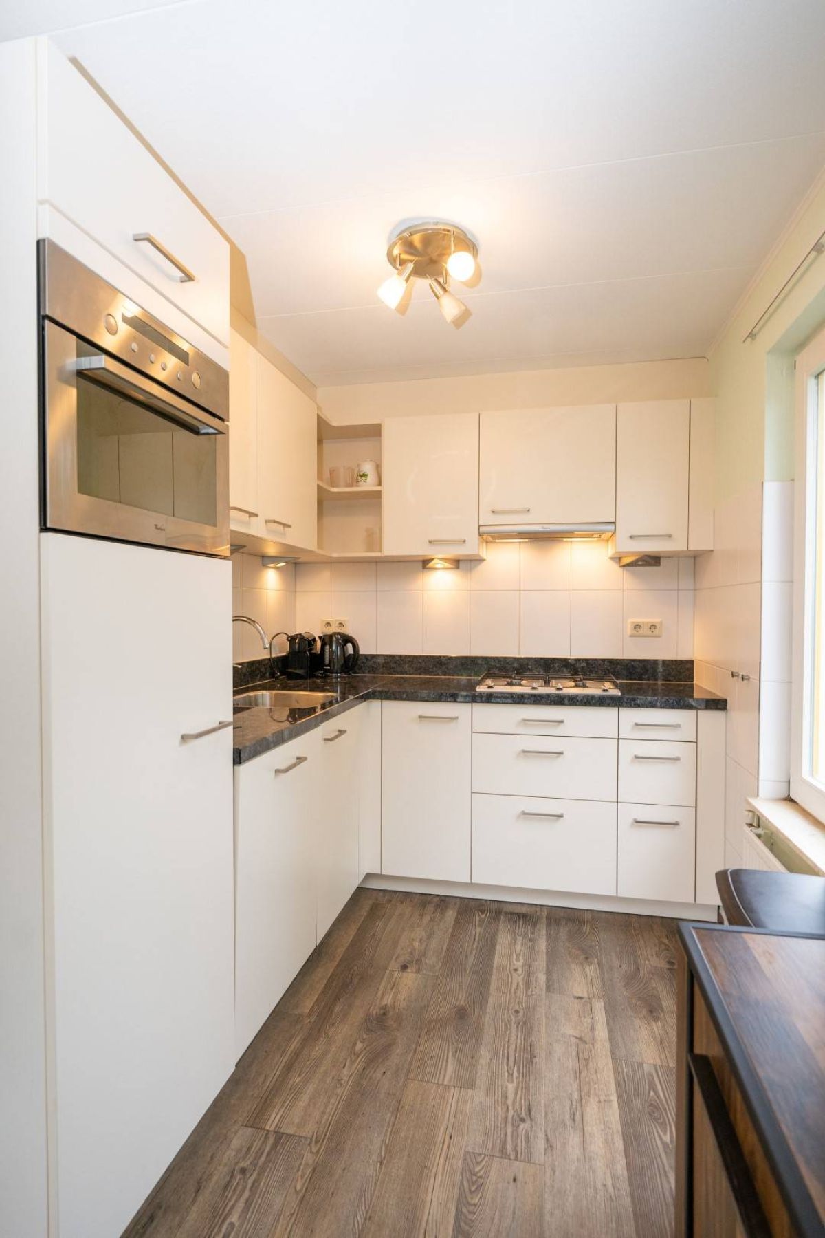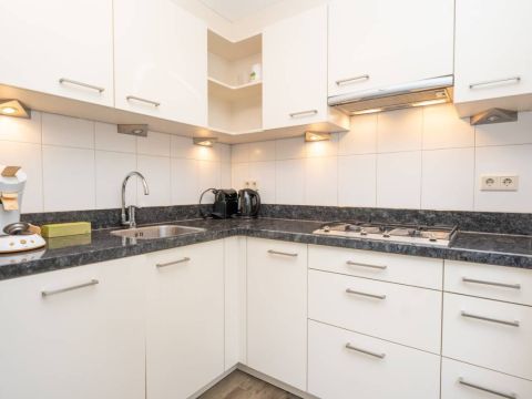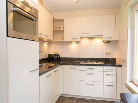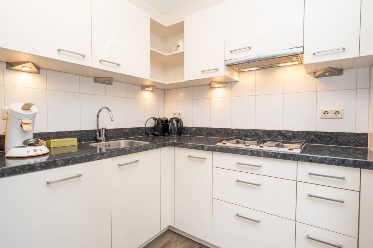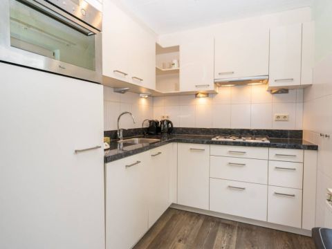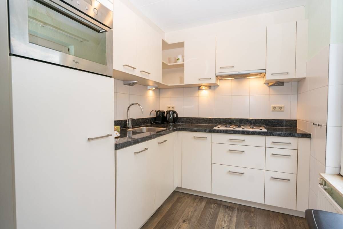 Aansluitend aan de kamer de nette halfopen keuken. Deze is geplaats in een L-opstelling, waarbij u voldoende kast- en werkruimte tot uw beschikking heeft. Daarnaast is de keuken voorzien van alle nodige inbouwapparatuur.