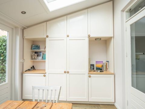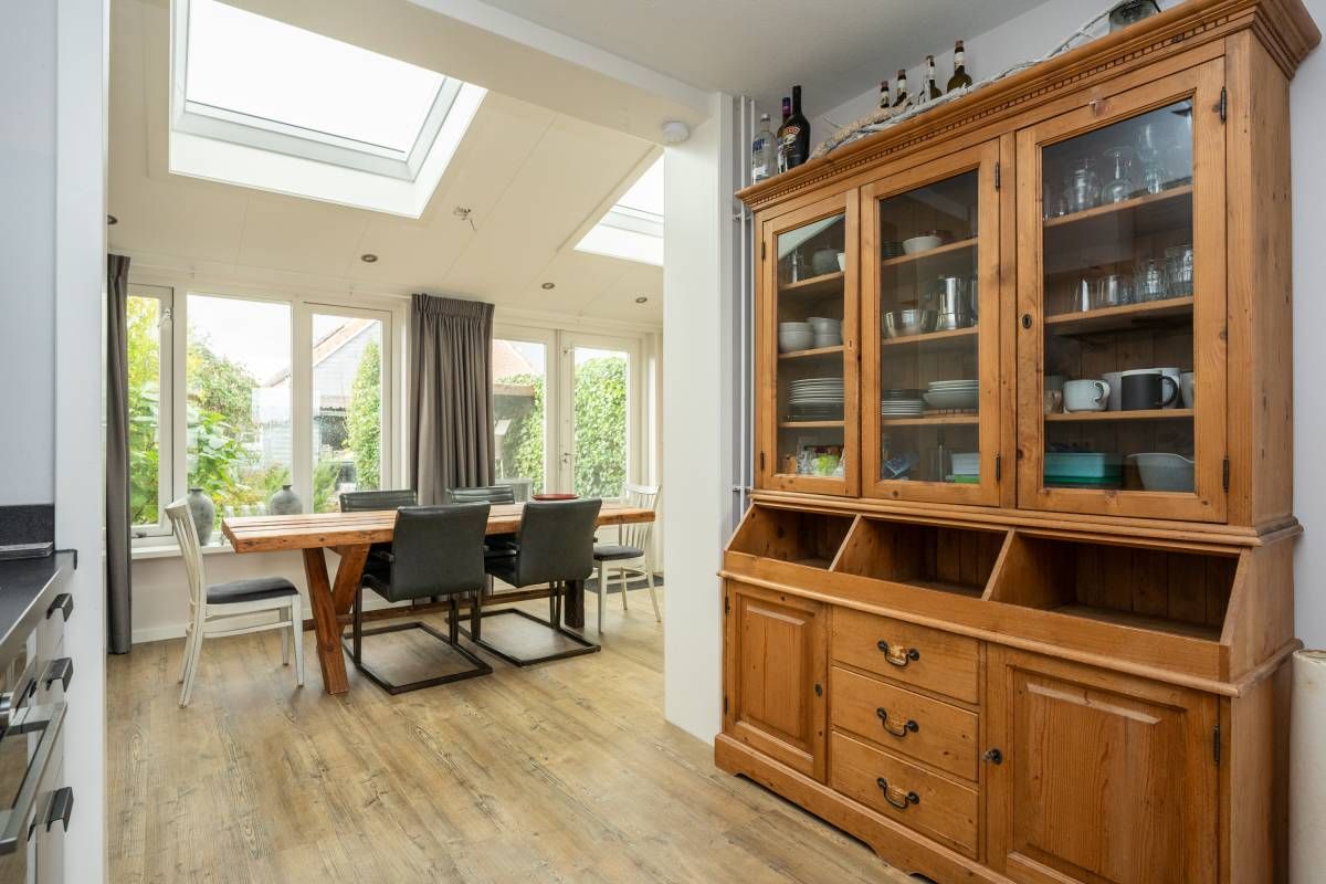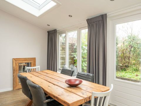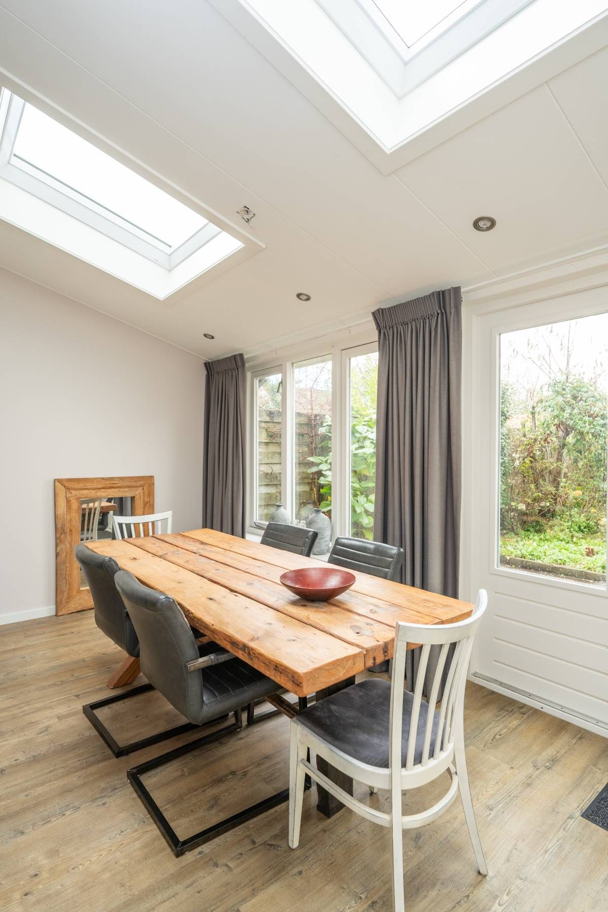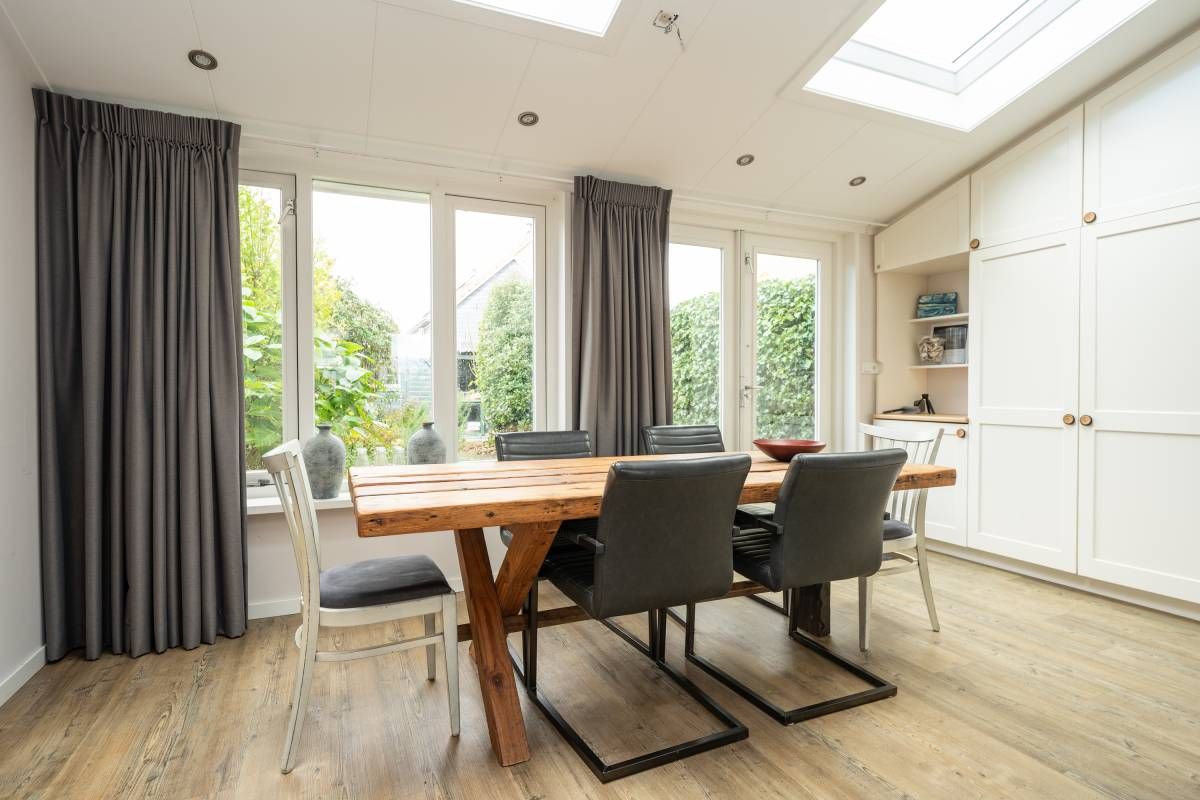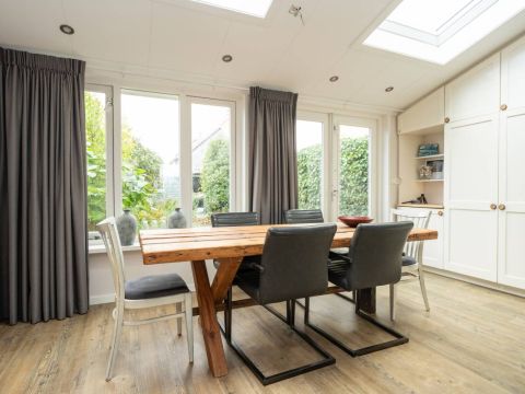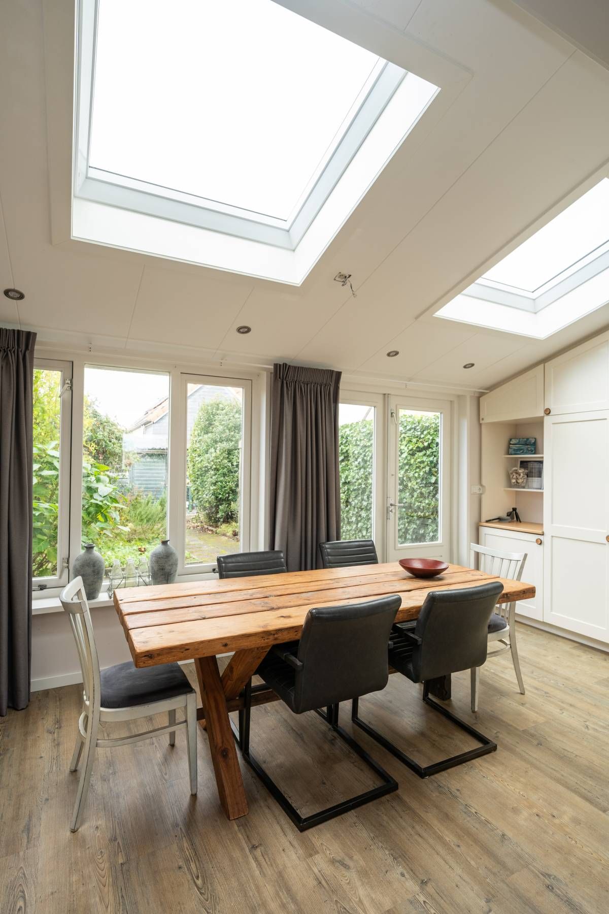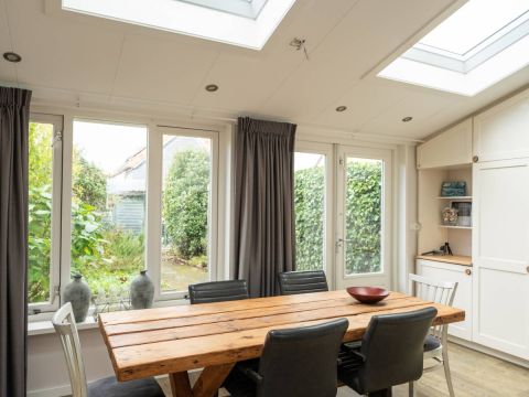 De serre biedt prachtig licht door de grote dakramen en raampartijen. Via de openslaande deuren bereik je de tuin.