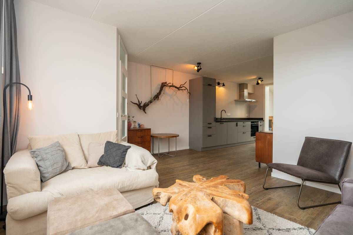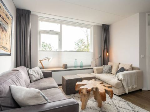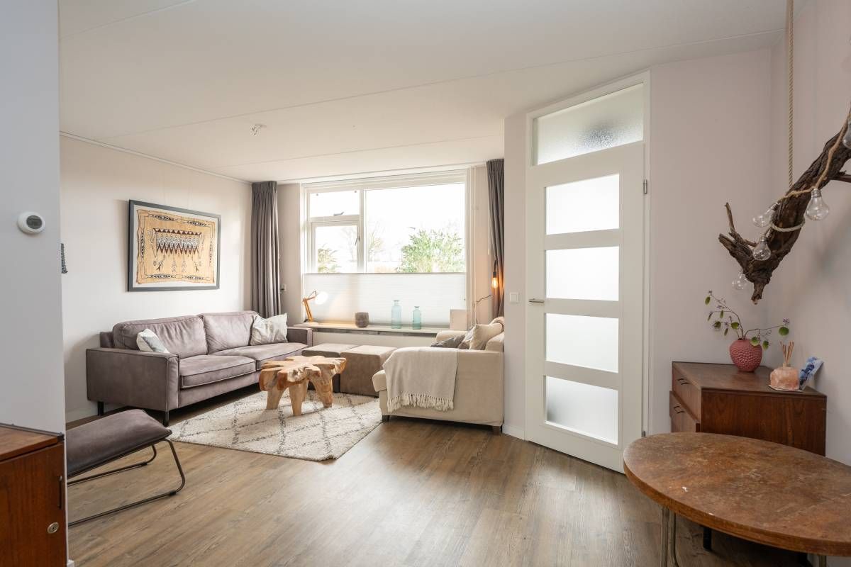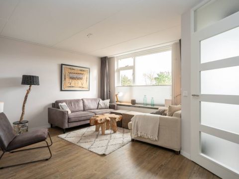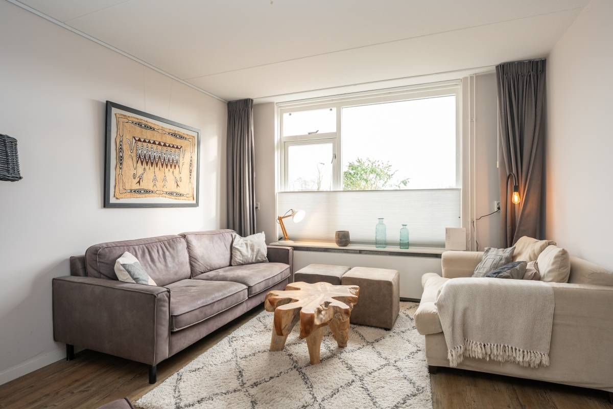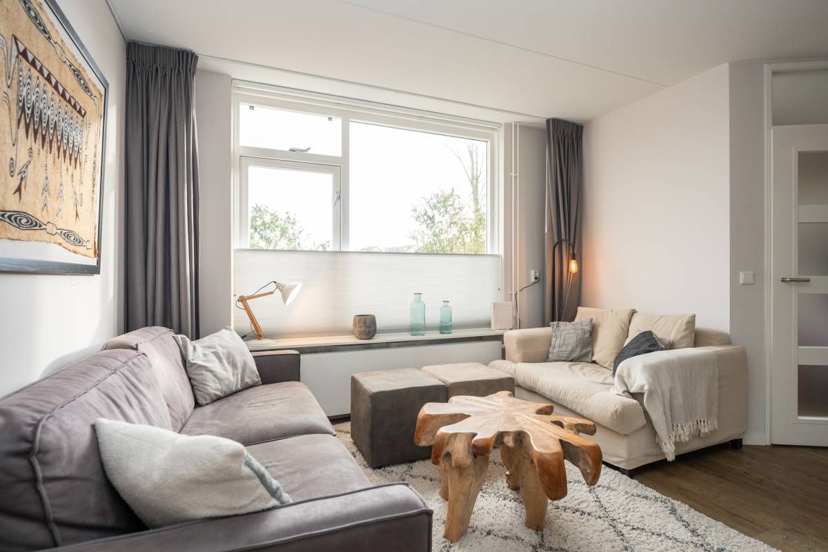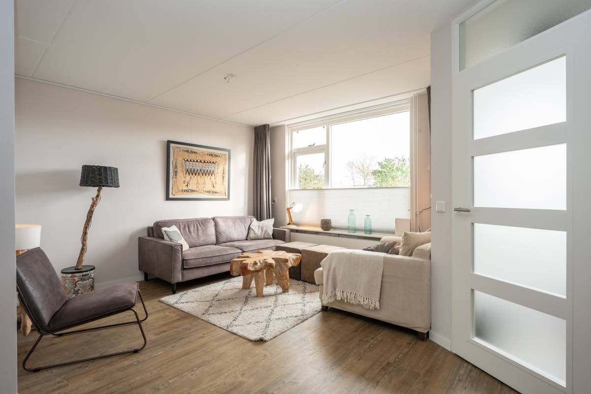 De serene woonkamer straalt rust en comfort uit en biedt een fraai en vrij uitzicht over het veld.