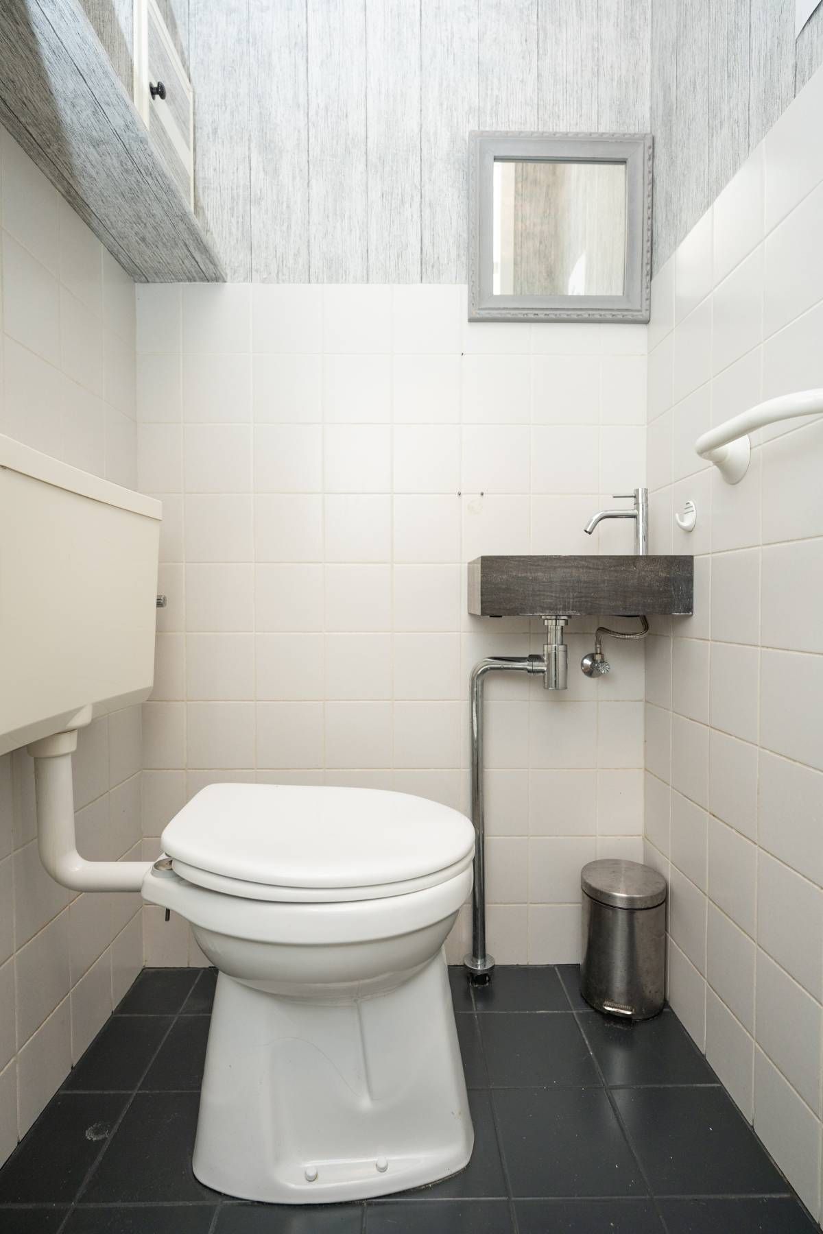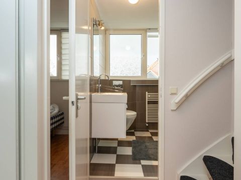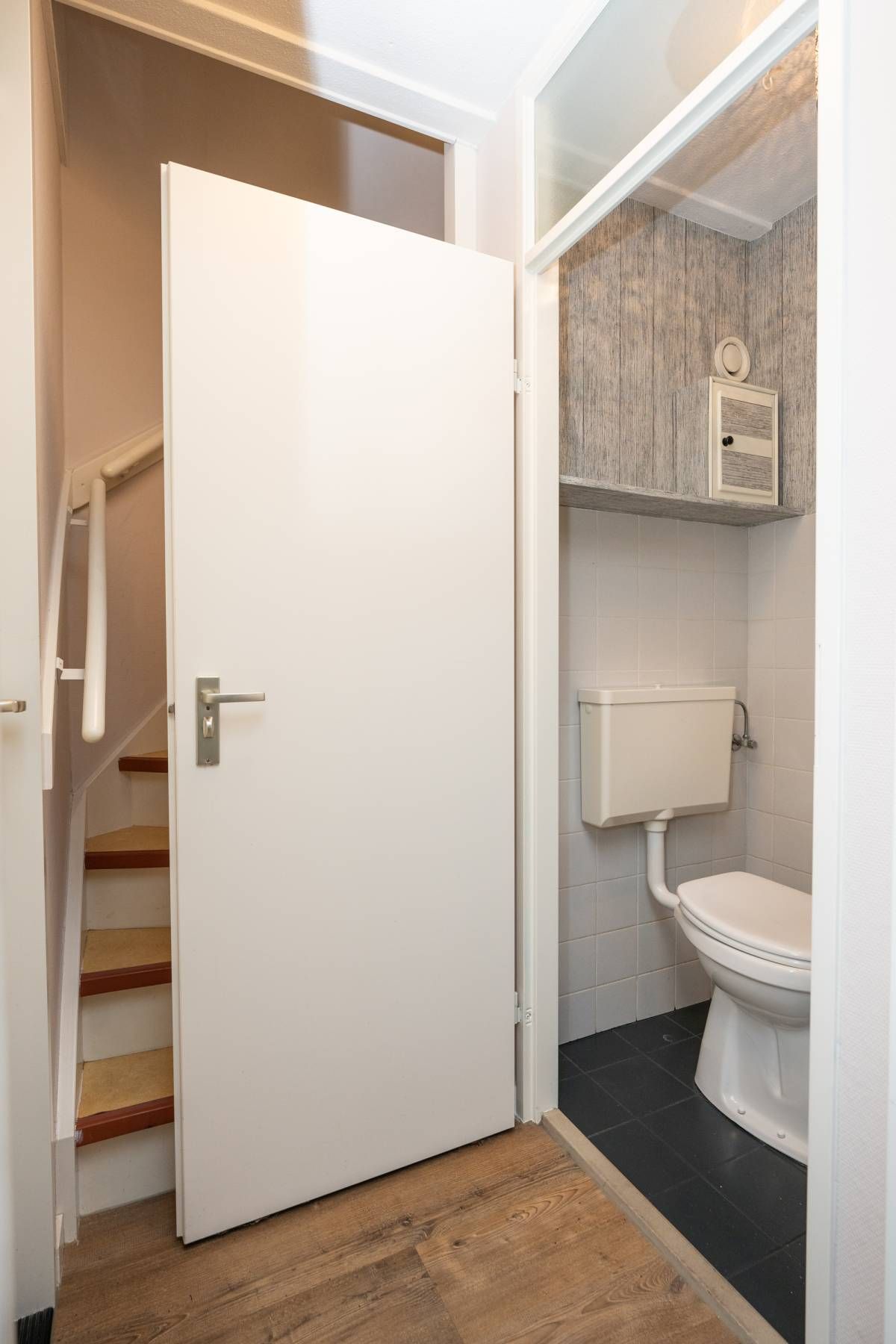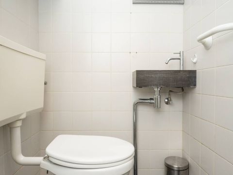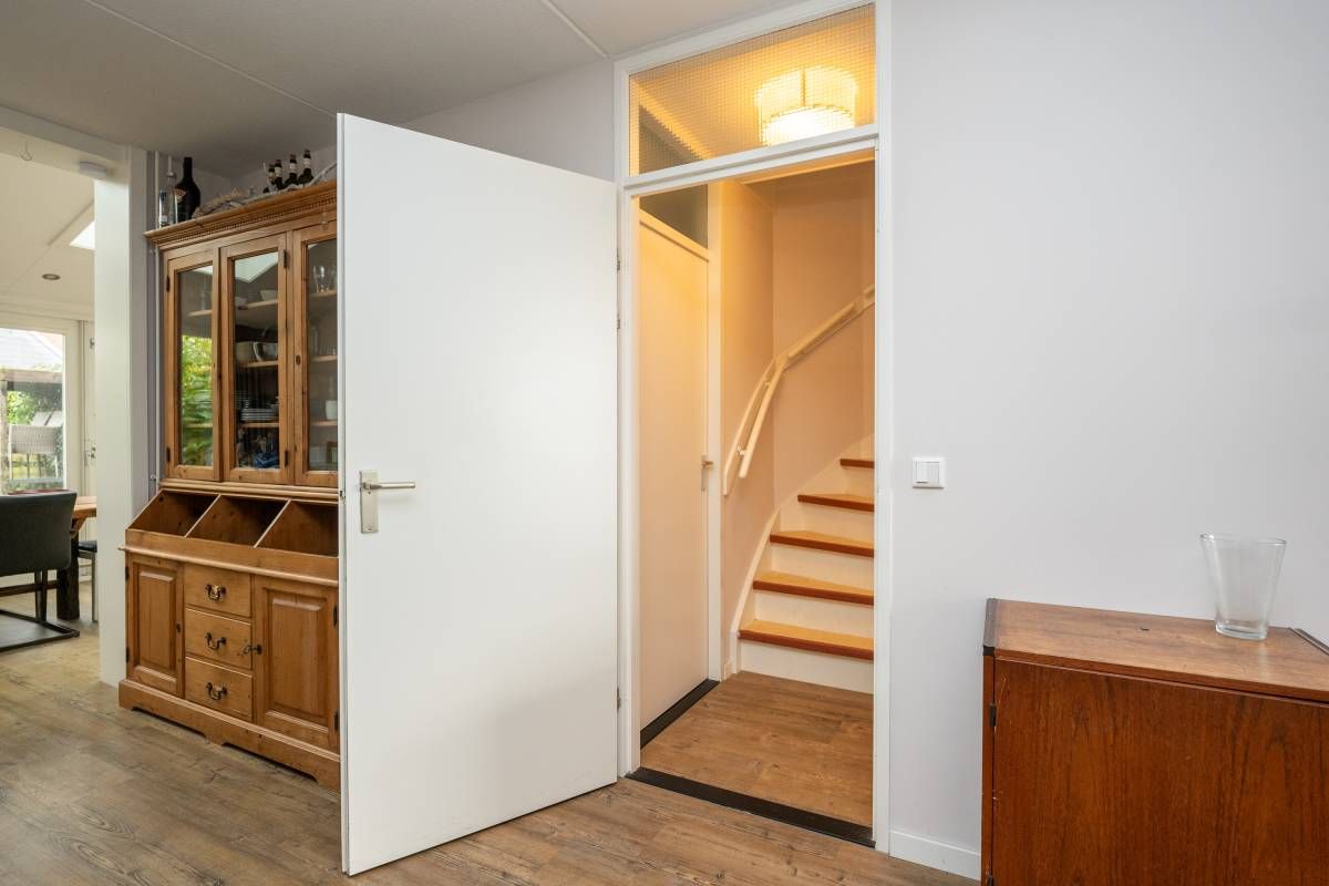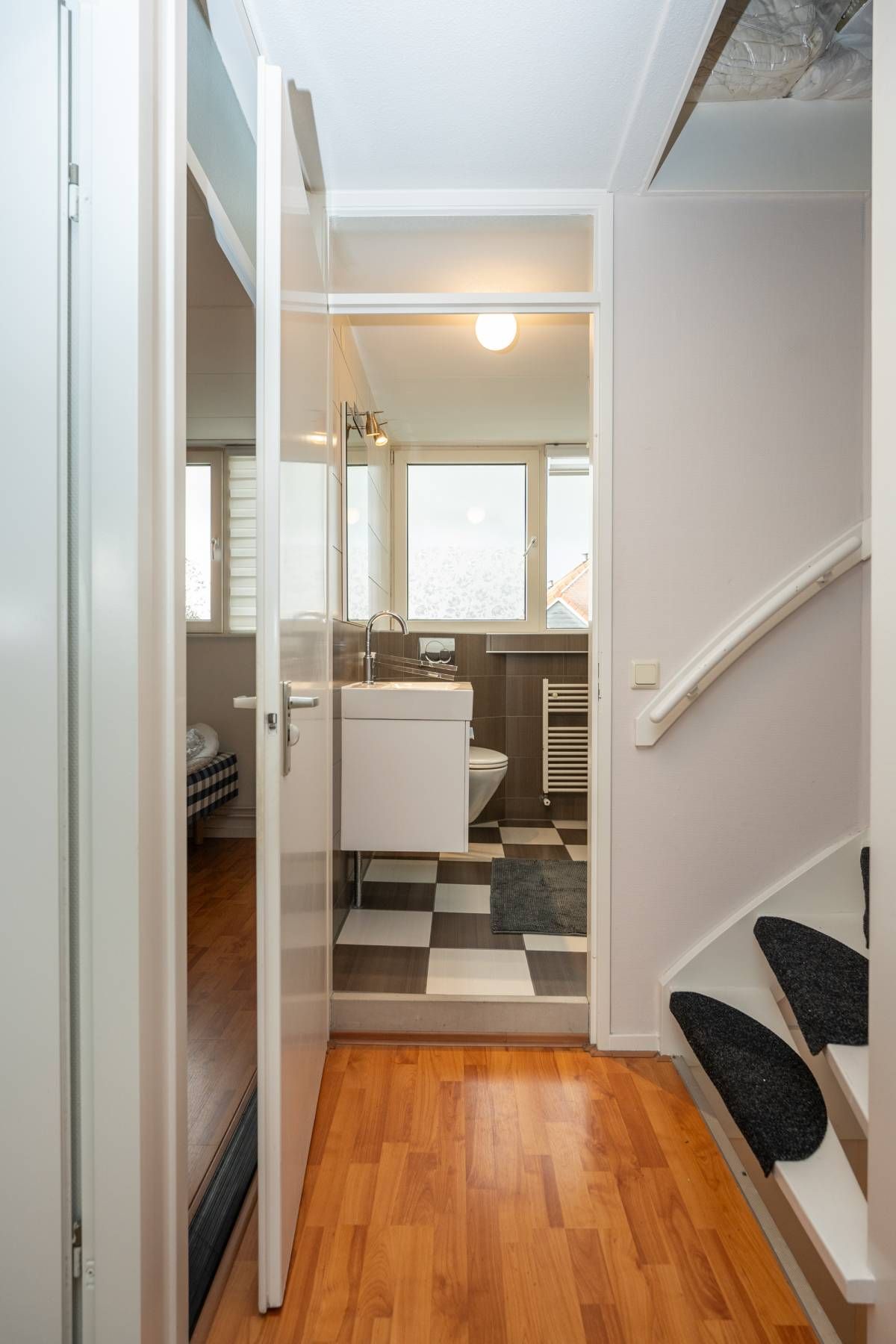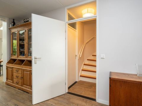 De tussenhal in het midden van de woning is voorzien van een trapopgang naar de verdieping, toilet met wastafel en doorloop naar de serre.