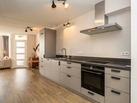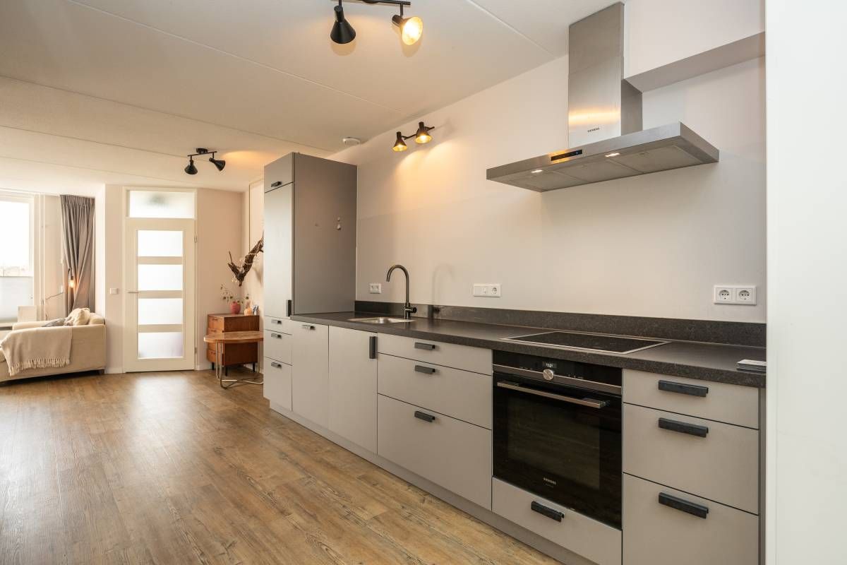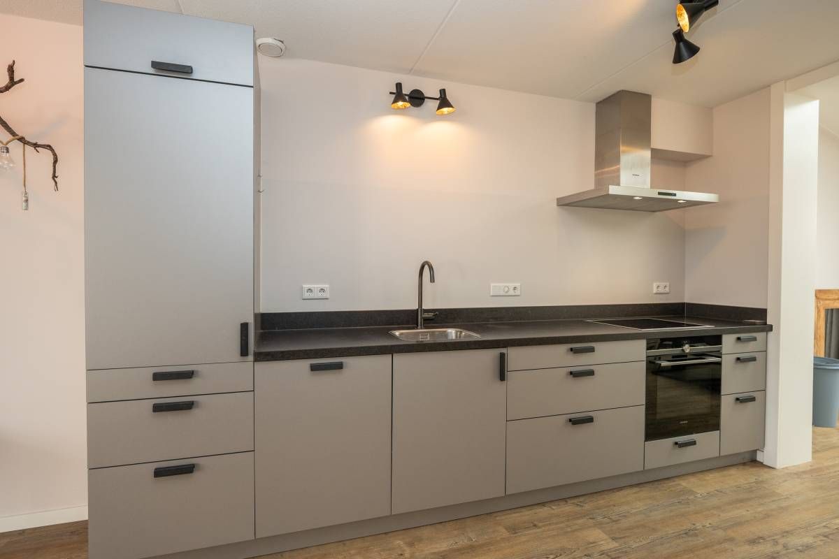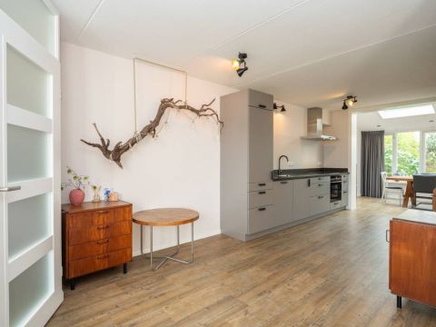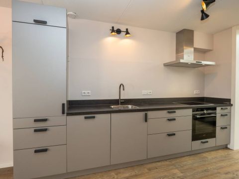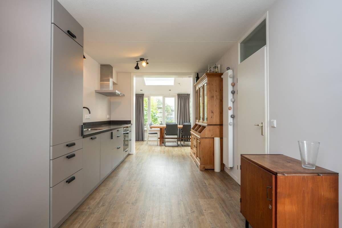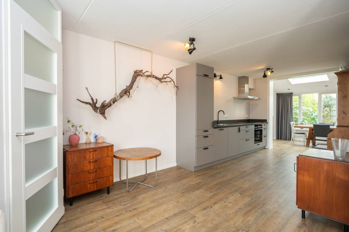 De stijlvolle keuken ligt prominent in het midden van de woning en is voorzien van diverse inbouw apparatuur.