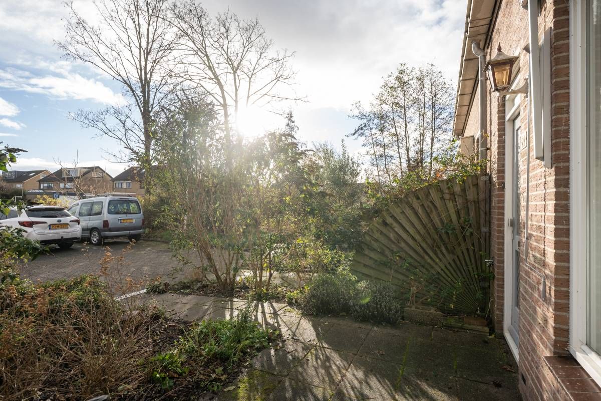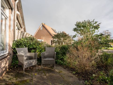 De voortuin heeft een fijn terrasje, afgeschermd door mooie beplanting.