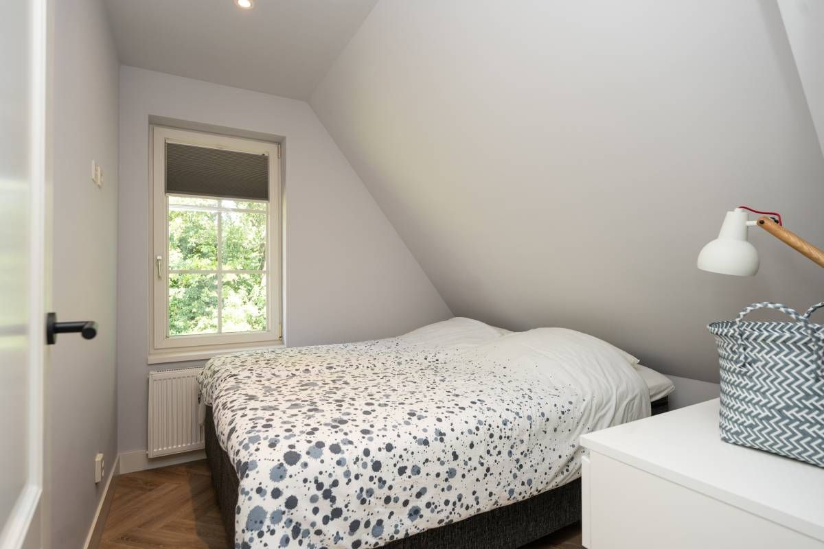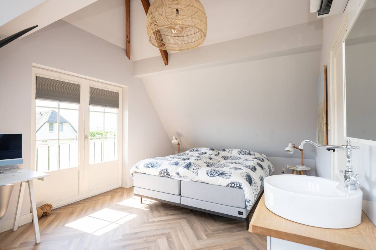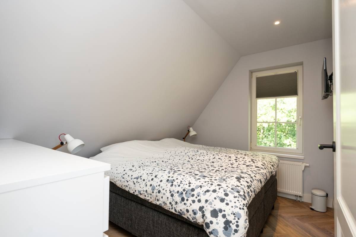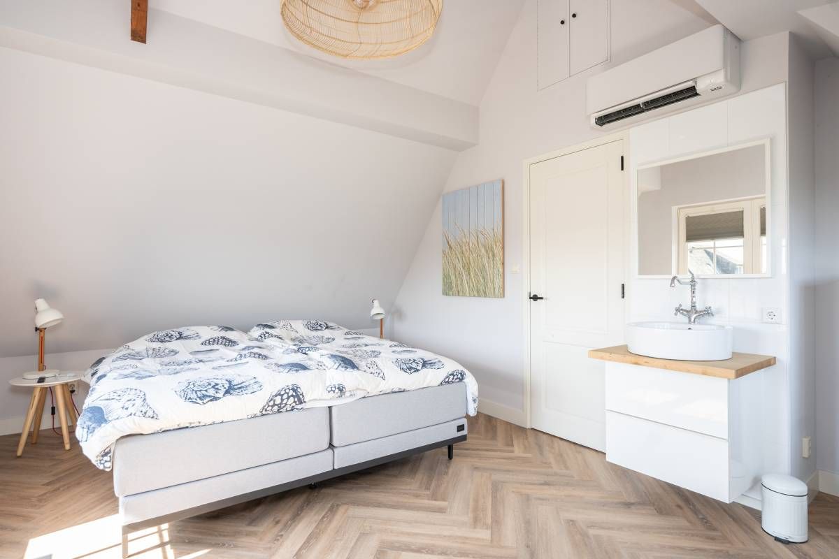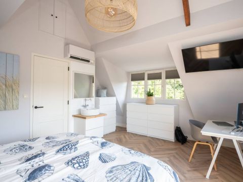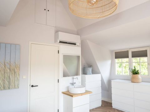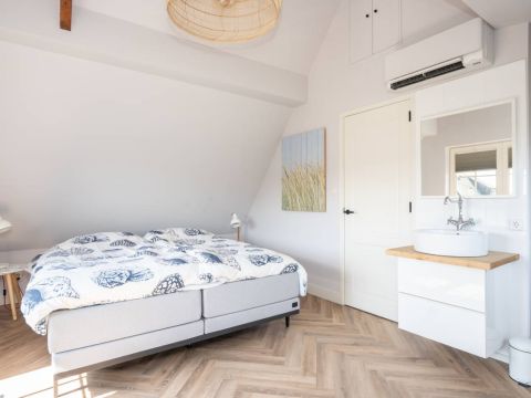 Aan de buitenzijde van de openslaande deuren en de dakkapel zijn elektrische screens geplaatst, waarmee u eenvoudig de zon buiten houdt én de temperatuur binnen aangenaam reguleert. Daarnaast is de slaapkamer uitgerust met een airco-installatie.