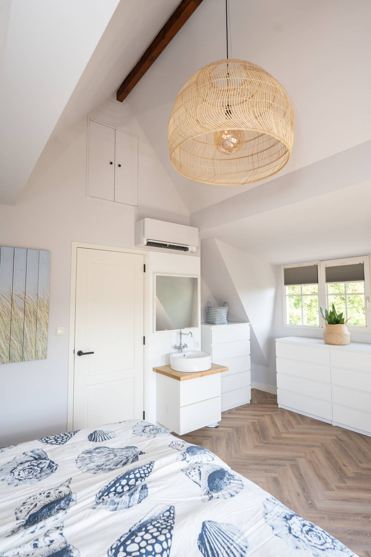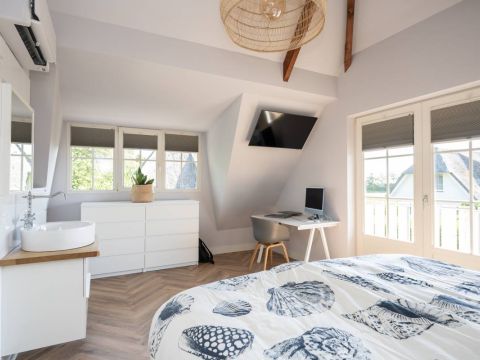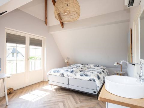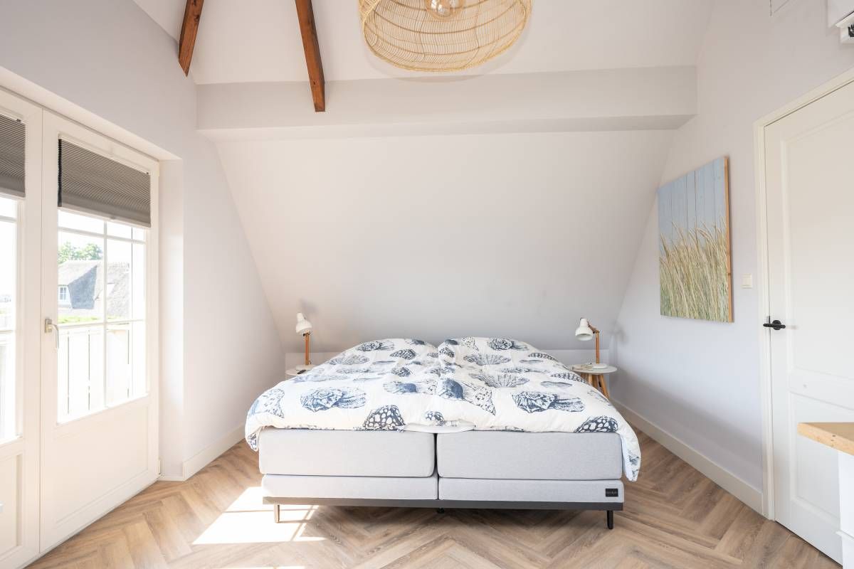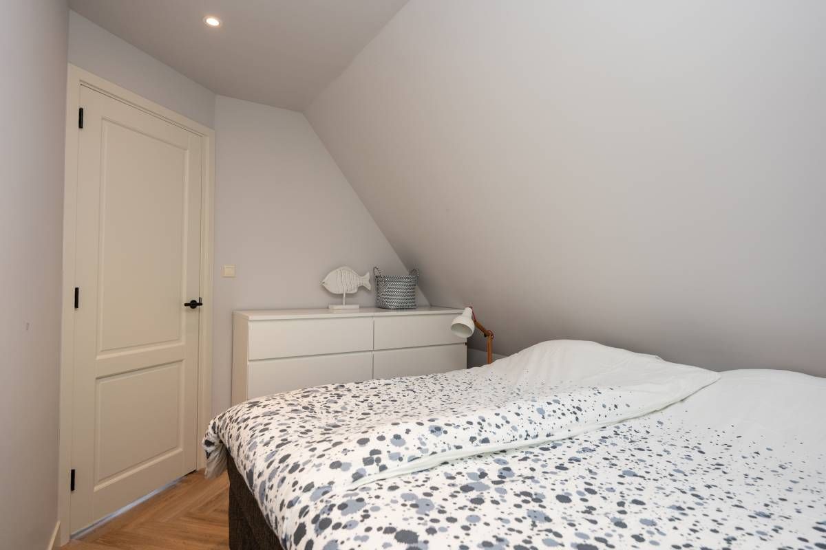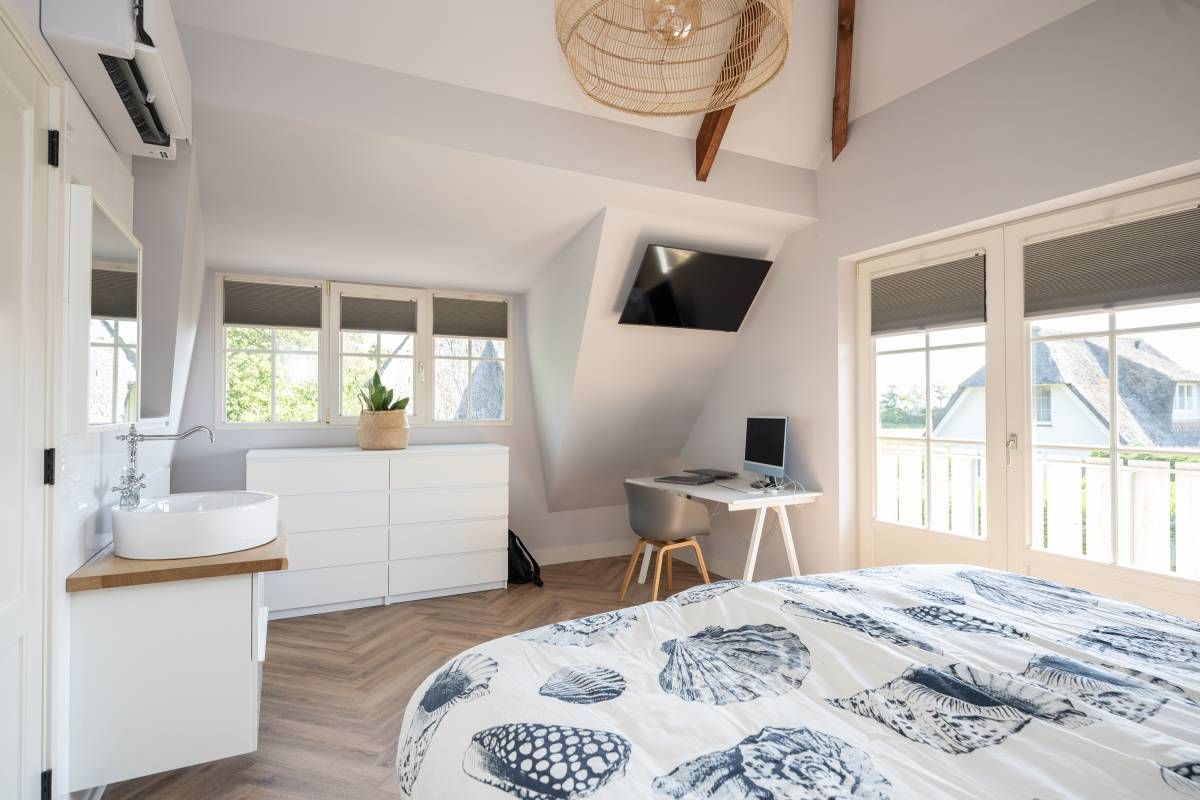 Aan de buitenzijde van de openslaande deuren en de dakkapel zijn elektrische screens geplaatst, waarmee u eenvoudig de zon buiten houdt én de temperatuur binnen aangenaam reguleert. Daarnaast is de slaapkamer uitgerust met een airco-installatie.