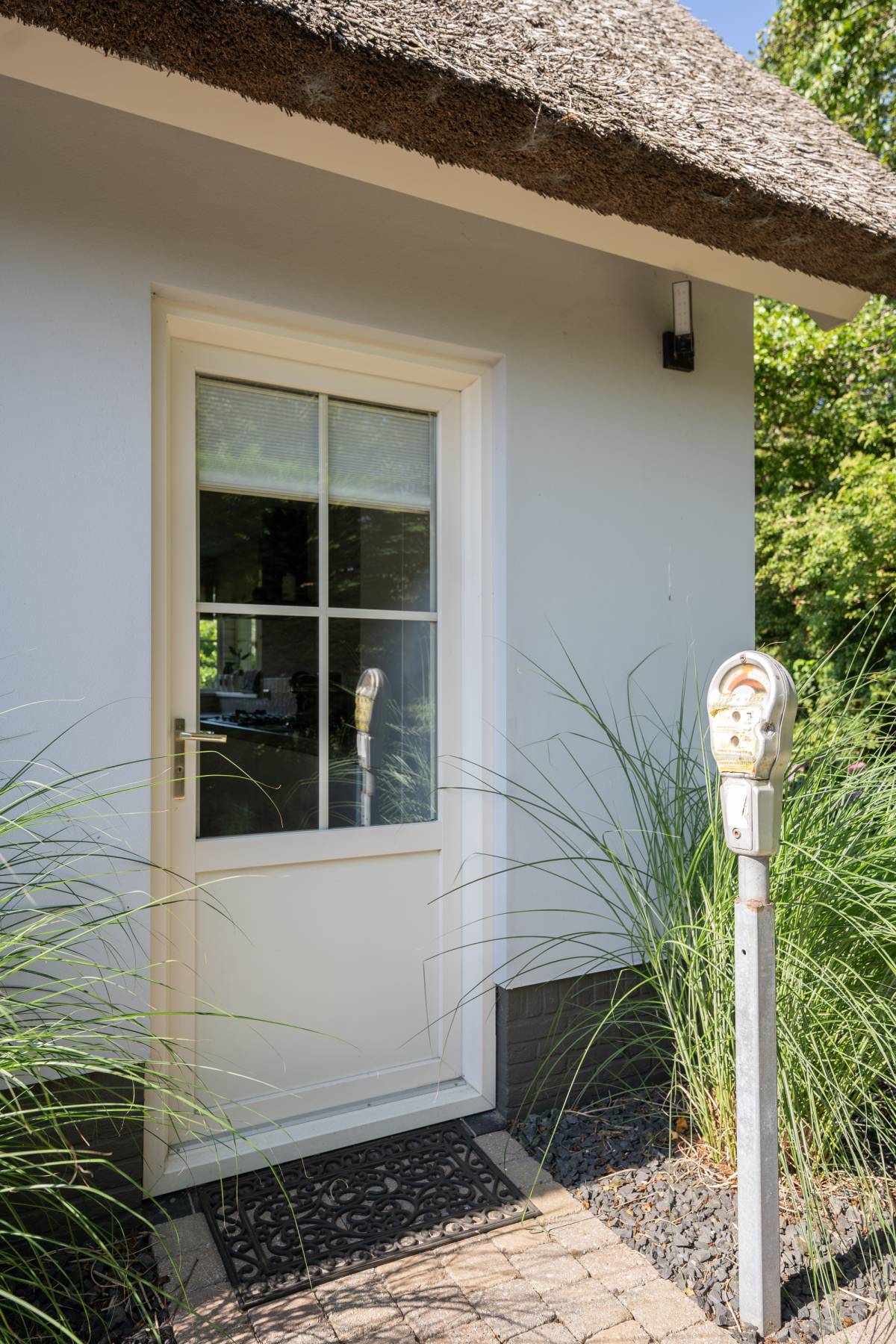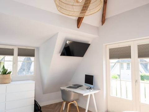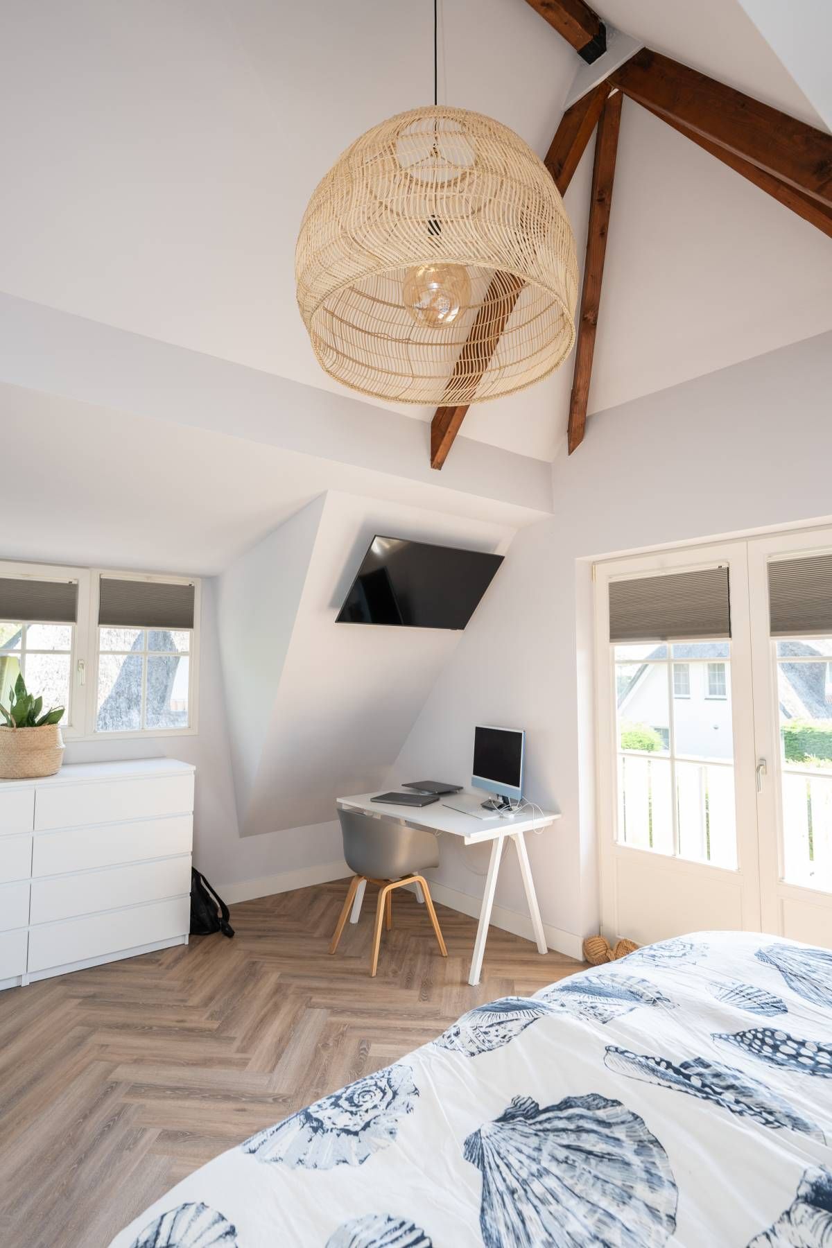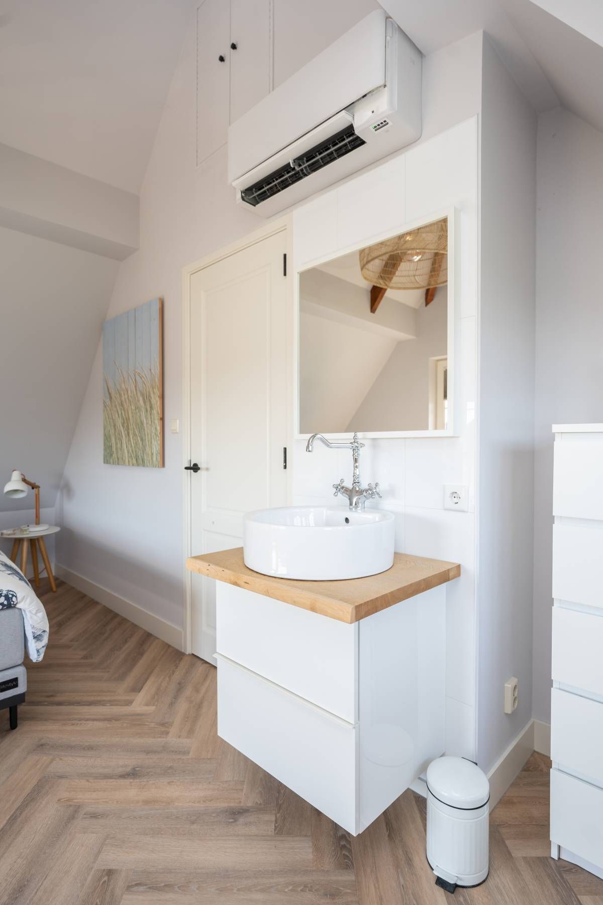 Aan de buitenzijde van de openslaande deuren en de dakkapel zijn elektrische screens geplaatst, waarmee u eenvoudig de zon buiten houdt én de temperatuur binnen aangenaam reguleert. Daarnaast is de slaapkamer uitgerust met een airco-installatie.