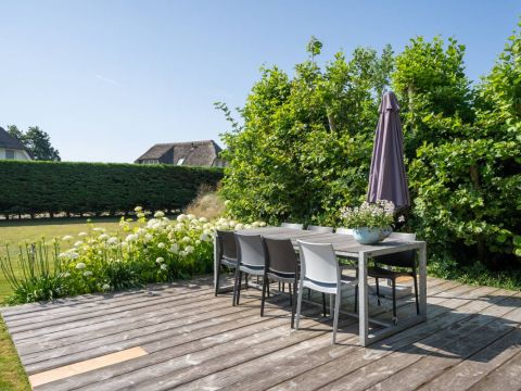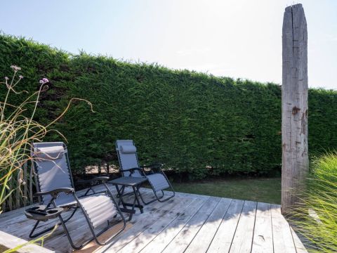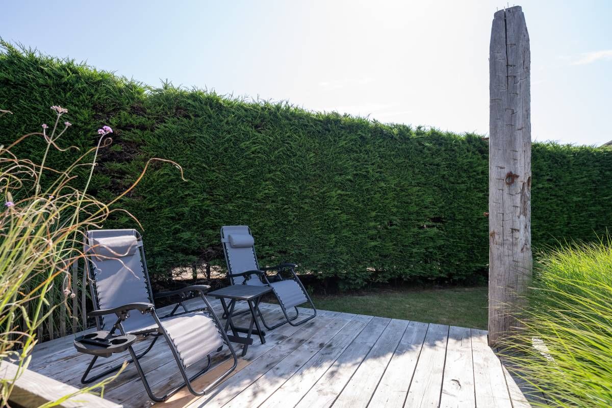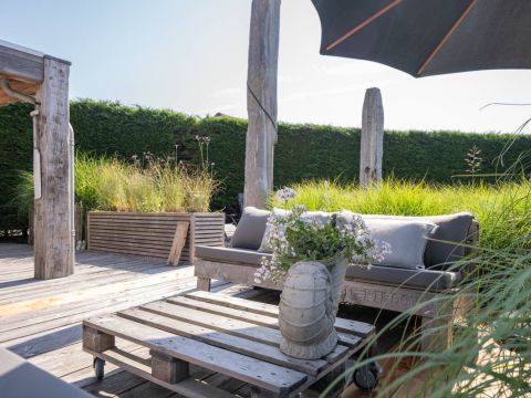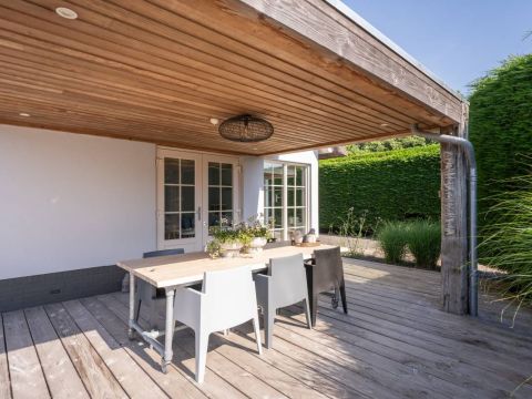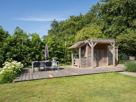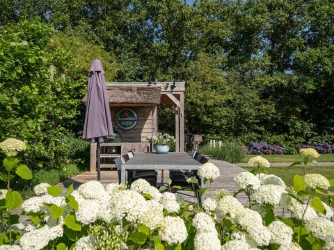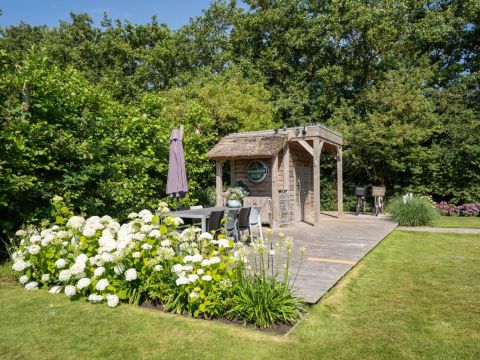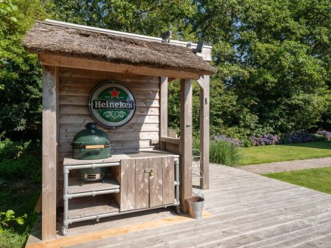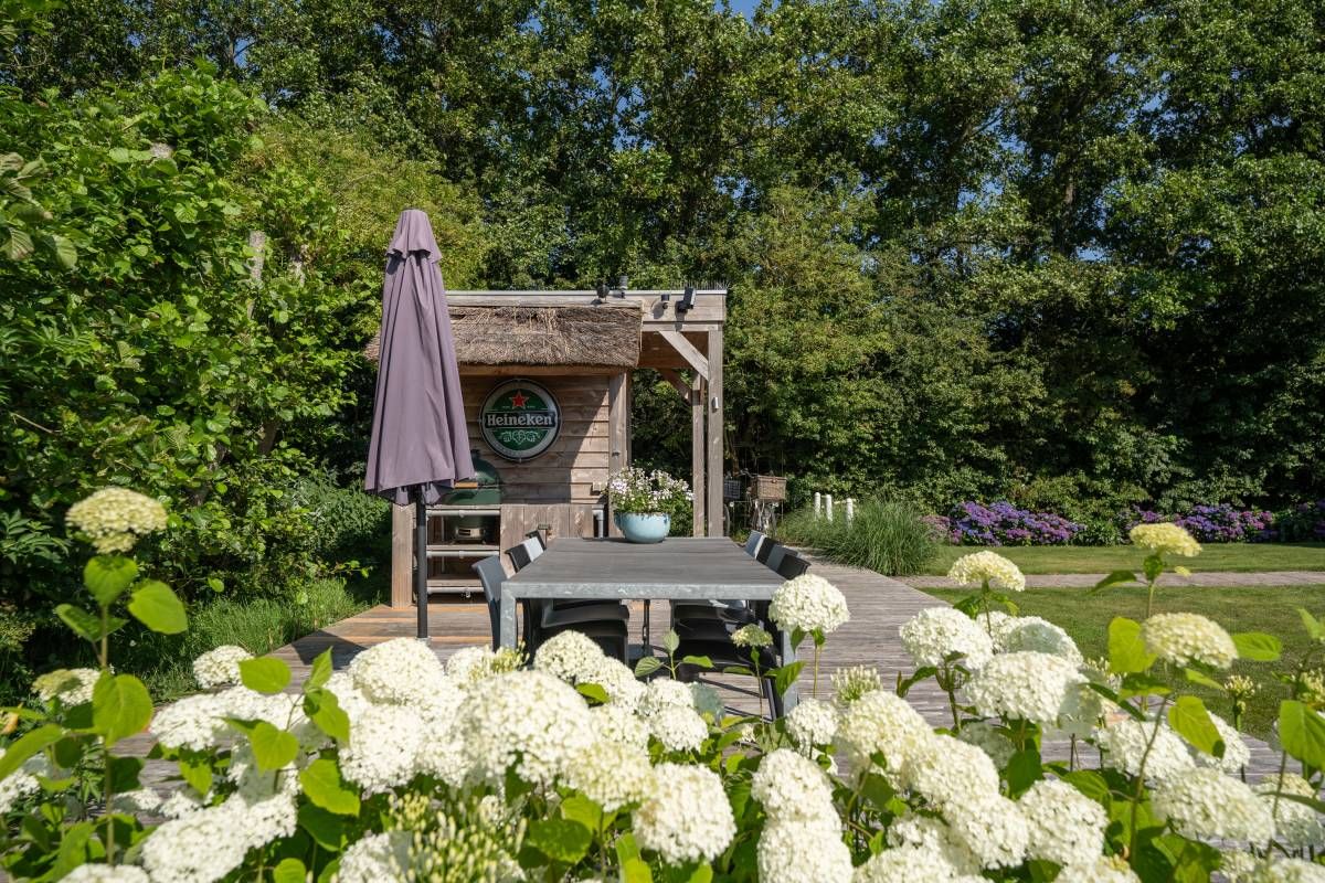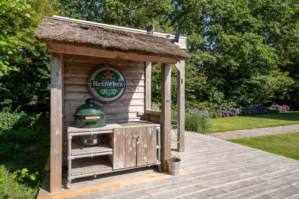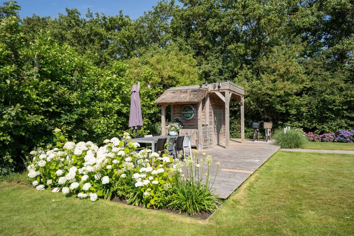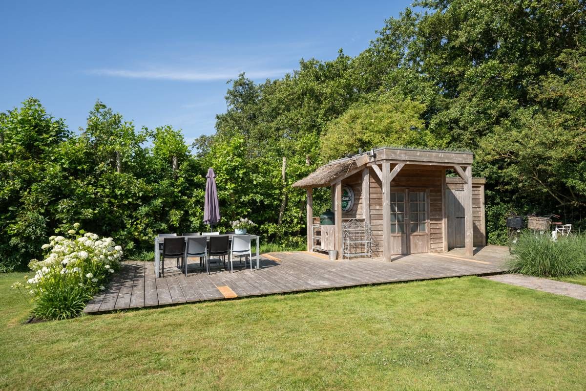 Achter in de tuin staat een houten tuinhuisje, met daarnaast een houten terras. Dé perfecte plek voor uw Green Egg barbecue. Hier viert u de zomer zoals het bedoeld is.