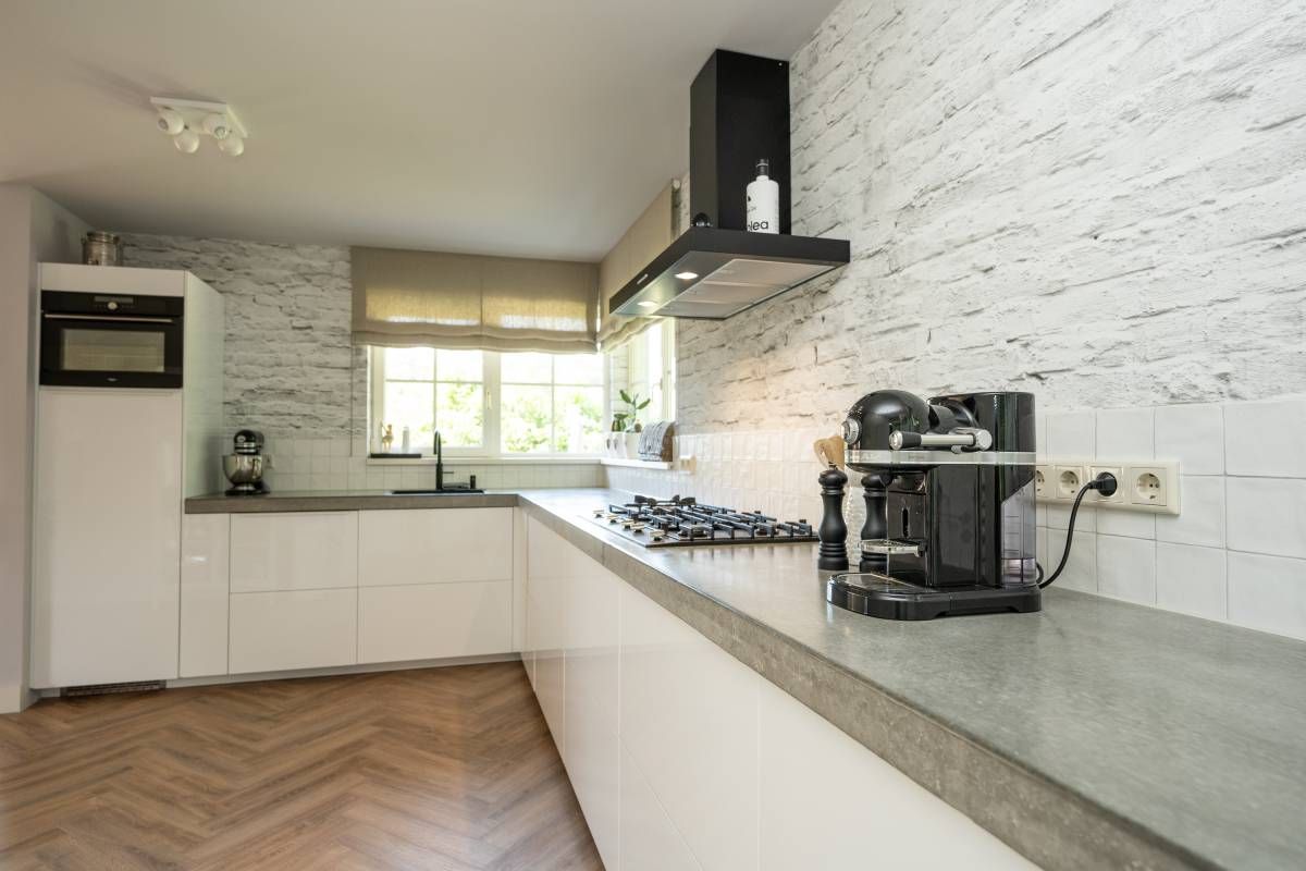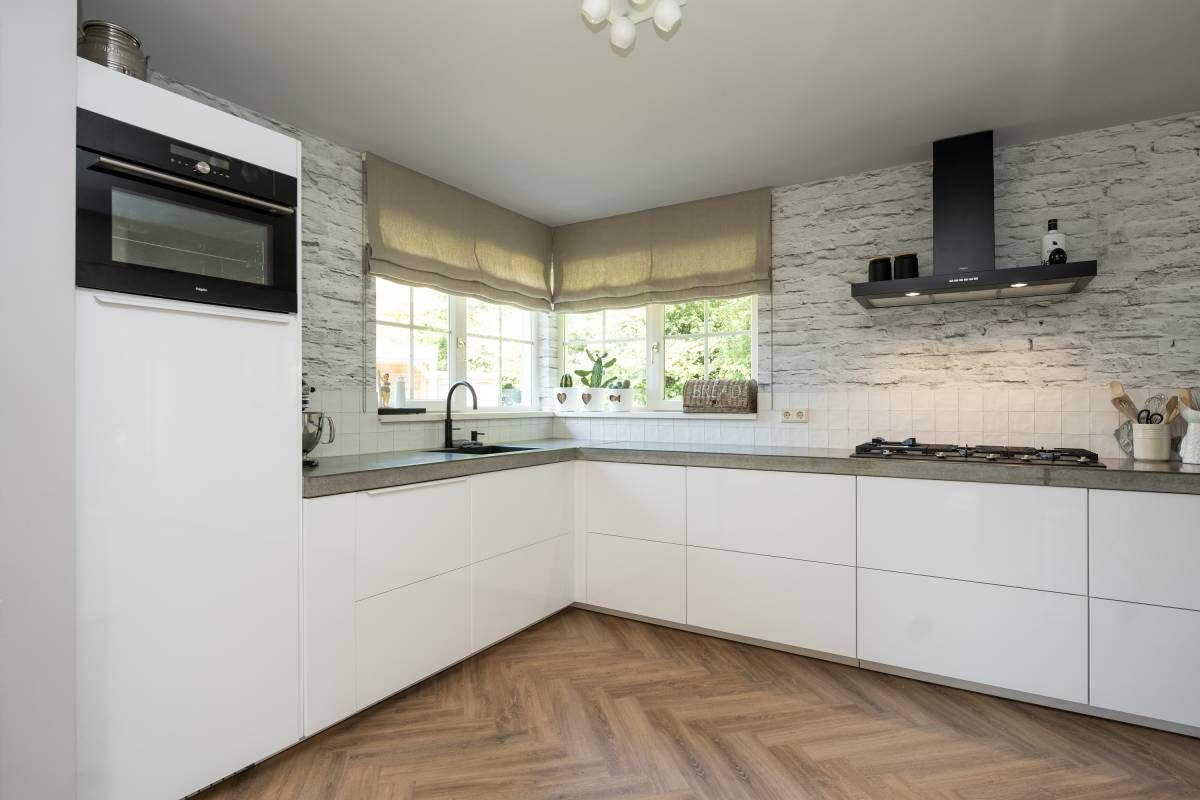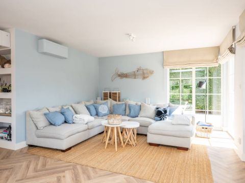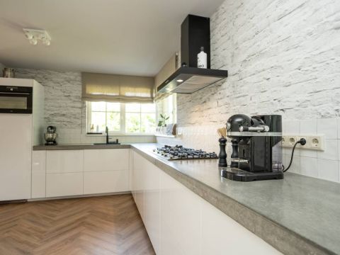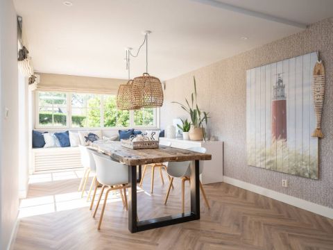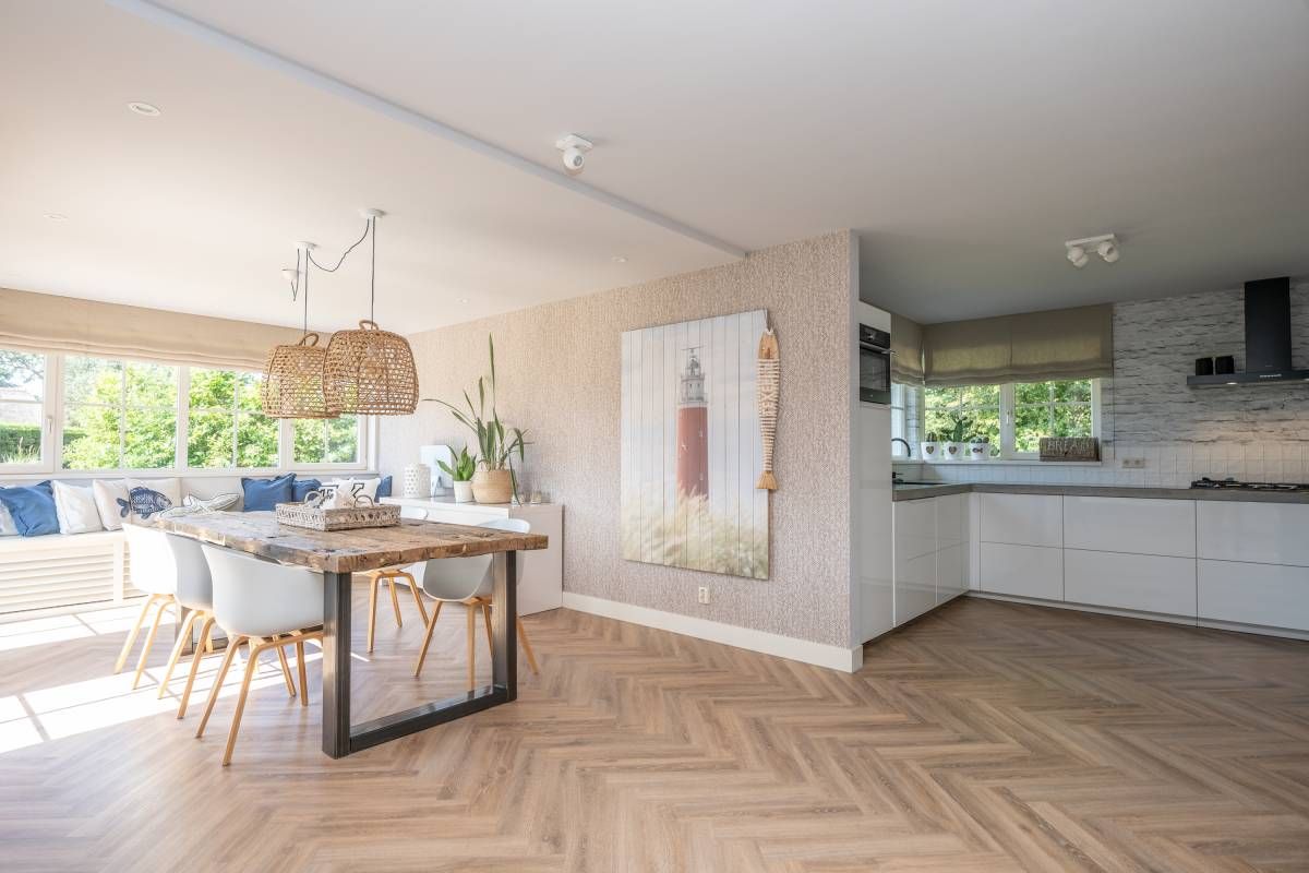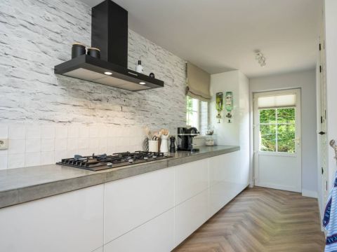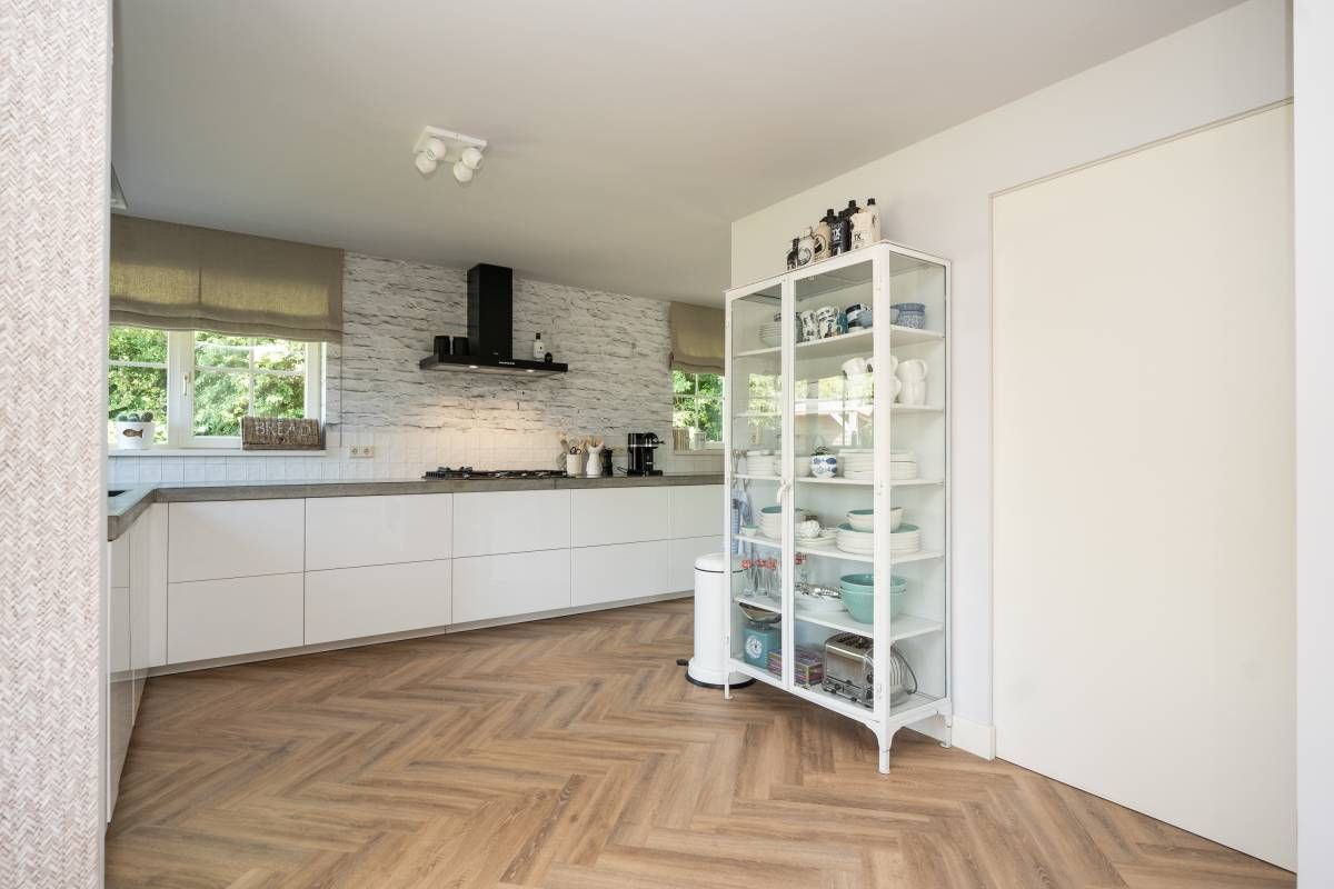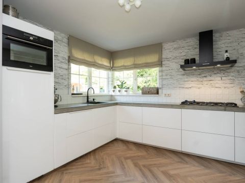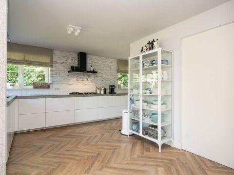 In het zitgedeelte is het heerlijk vertoeven, met een gezellige bank, uitzicht op de tuin en een prettige sfeer. De airconditioning zorgt ook op warme dagen voor aangenaam comfort. De stijlvolle PVC visgraatvloer vormt de warme basis van deze leefruimte. Tevens is de gehele begane grondvloer voorzien van vloerverwarming.