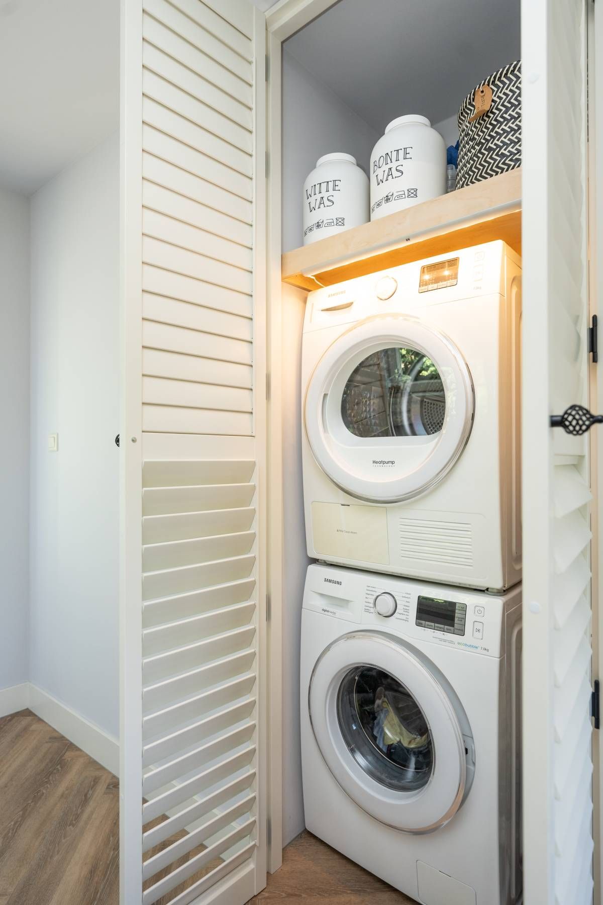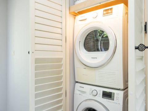 Aan werkelijk alles is gedacht: in een vaste kast in de keuken vindt u de aansluitingen voor de wasmachine en droger, keurig weggewerkt. Ook is hier de HR CV-ketel en de waterontharder gesitueerd en netjes afgewerkt middels kastdeuren.