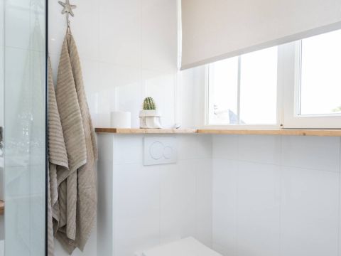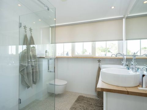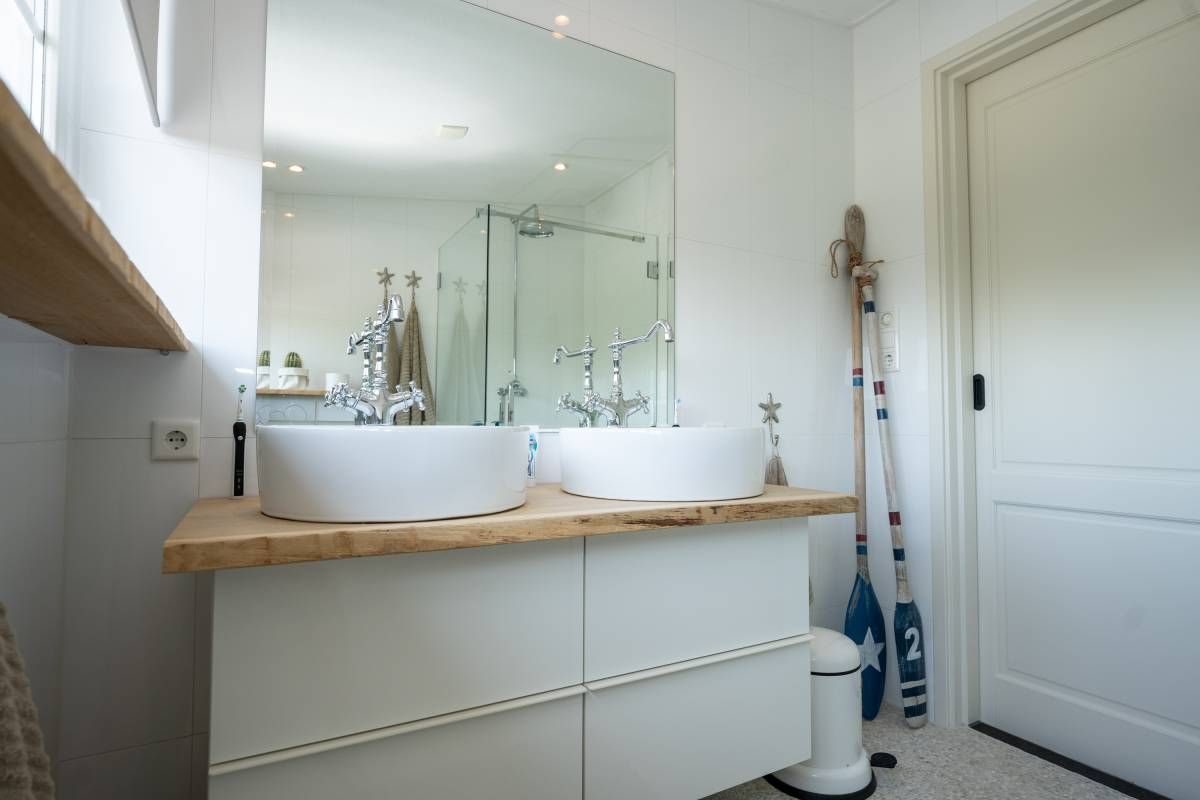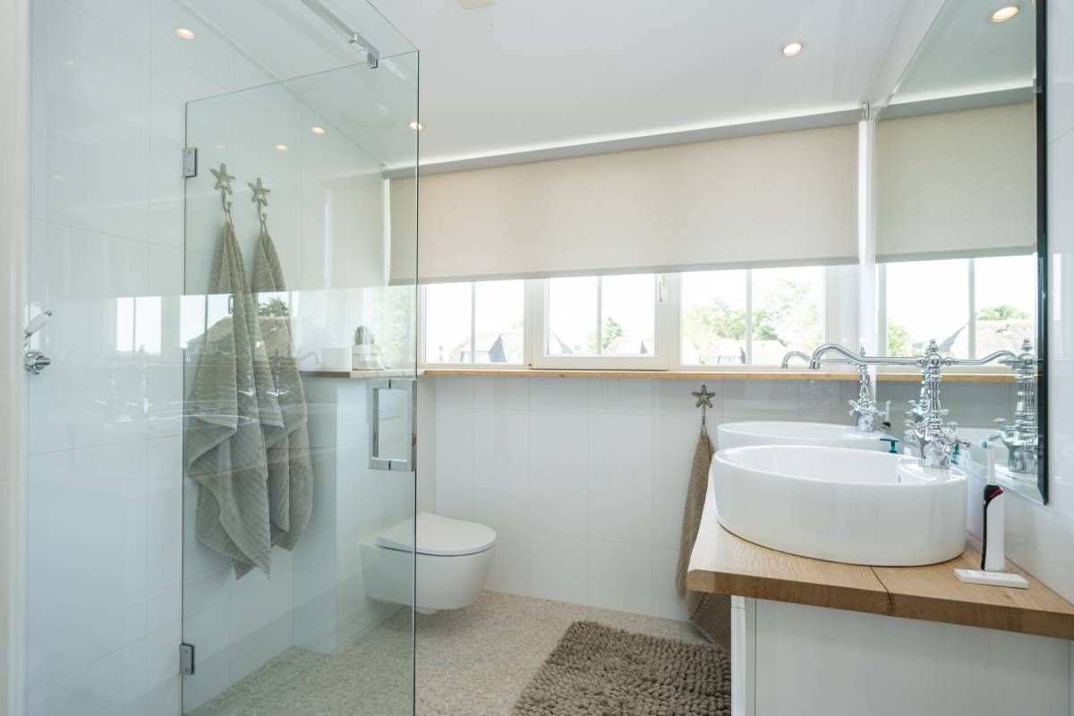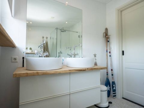 De badkamer is modern, luxe en afgewerkt met smaakvolle materialen. Hier vindt u een prettige inloopdouche, een fraai wastafelmeubel met dubbele waskommen en een toilet. Uiteraard voorzien van vloerverwarming.