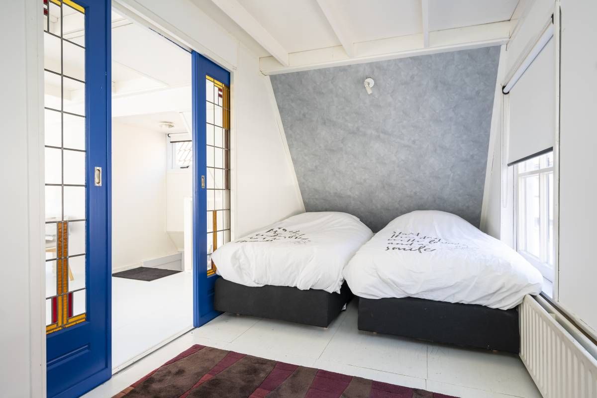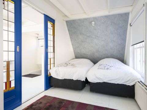 De slaapkamer is bereikbaar middels de glas-in-lood schuifdeuren.