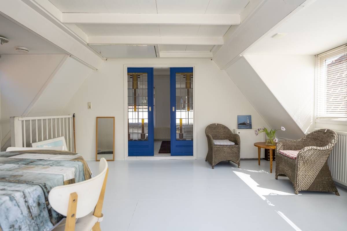 Hoe leuk zijn de schuifdeuren van de lichte bovenwoning met doorloop naar de woonkamer. Deze bovenwoning heeft een kamer met open keuken, badkamer met douche, toilet en wastafel en een fijne slaapkamer aan de voorzijde. De slaapkamer is bereikbaar middels de glas-in-lood schuifdeuren.