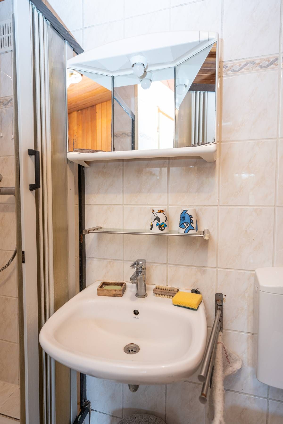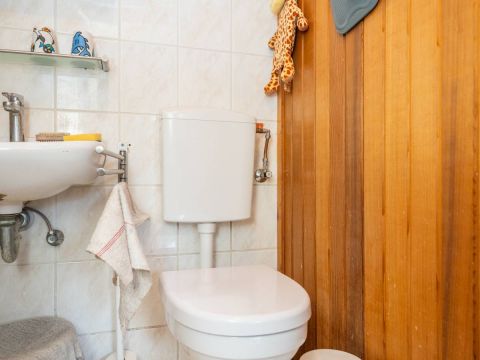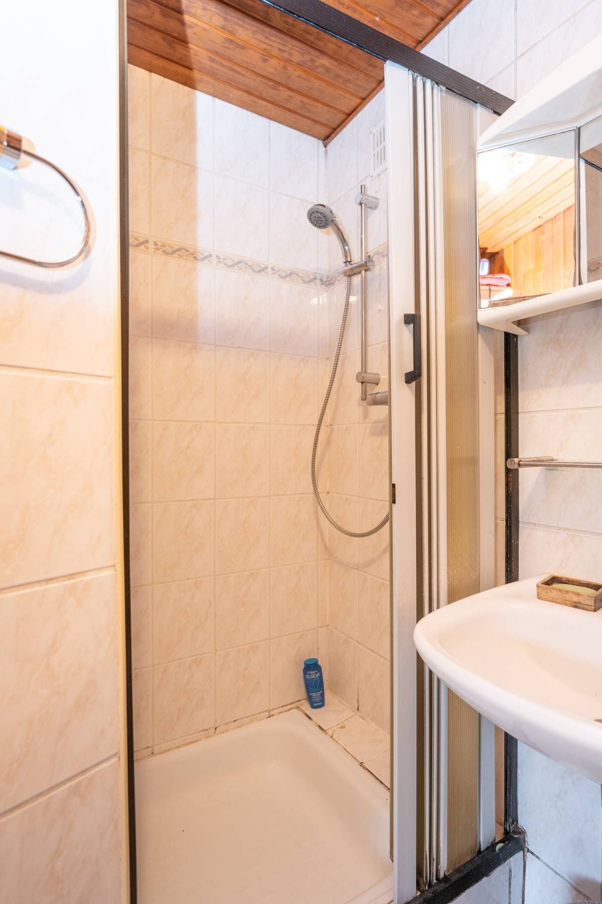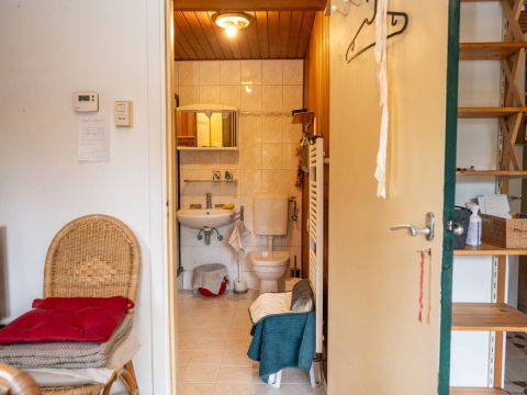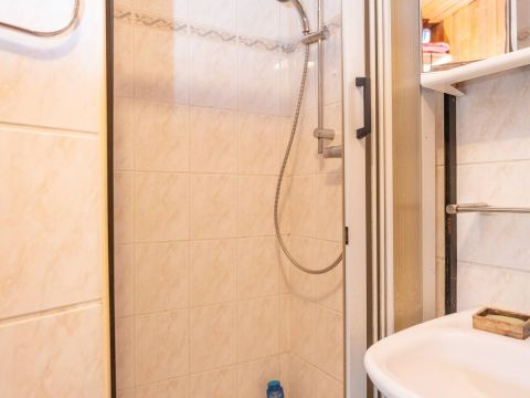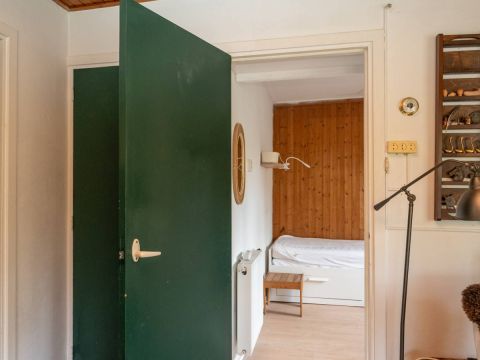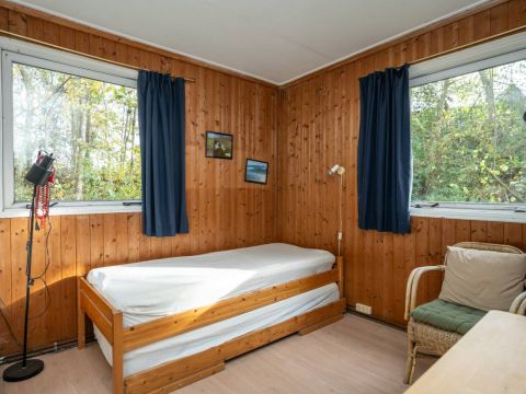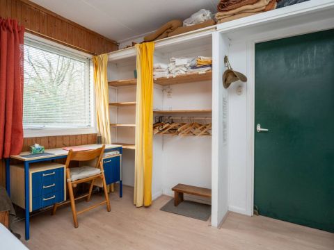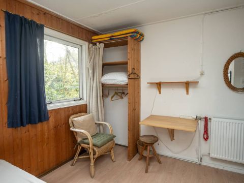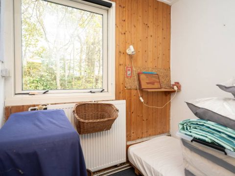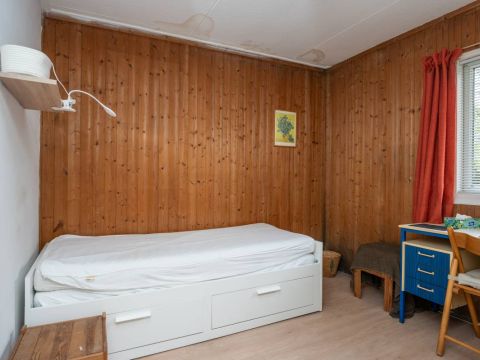 De woonkamer staat in verbinding met de keuken, de badkamer en 3 slaapkamers. De eenvoudige badkamer heeft een doucheruimte met harmonicadeur, wastafel en toilet. In de kleinste slaapkamer staat een eenpersoonsbed. In de 2 andere slaapkamers staan eenpersoonsbedden met een extra onderbed voor een 2de persoon.