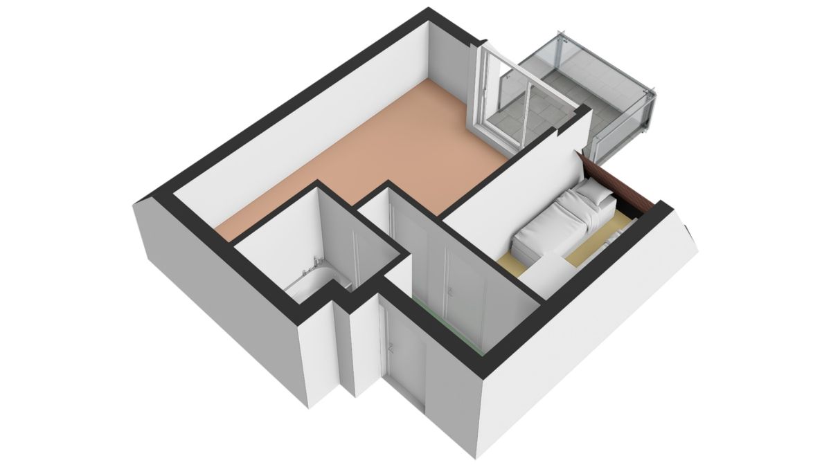 Indeling | Via de centrale entree bereikt u het appartement op de eerste verdieping. Binnenkomst vindt plaats in de hal, die toegang biedt tot alle vertrekken: de woonkamer, slaapkamer en badkamer.