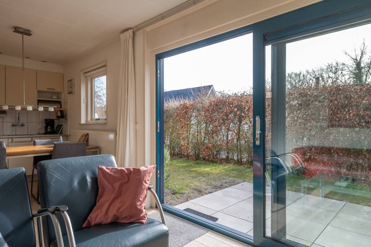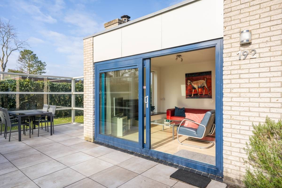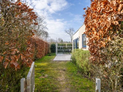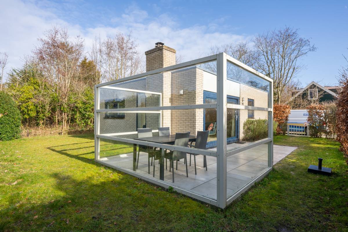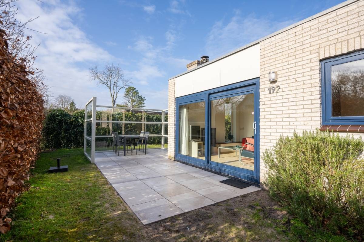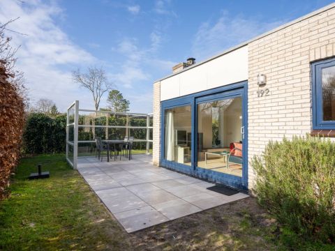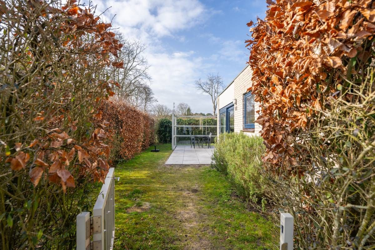 Rondom de bungalow ligt een royale tuin met veel groen en privacy. Het terras is grotendeels voorzien van een wind-glasscherm, waardoor u hier beschut kunt genieten van de zon.