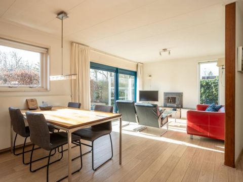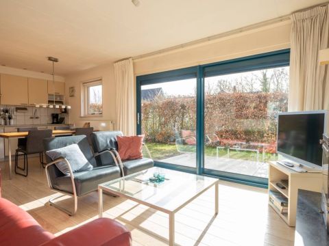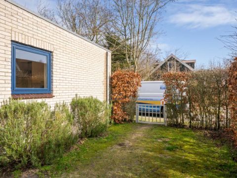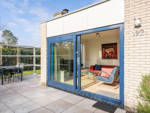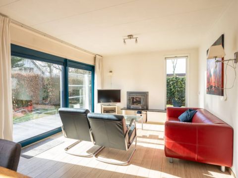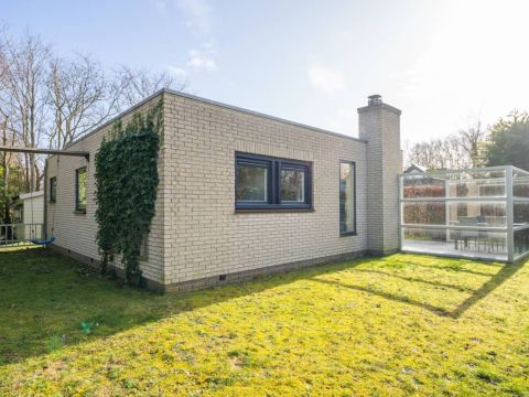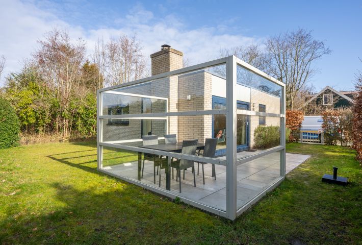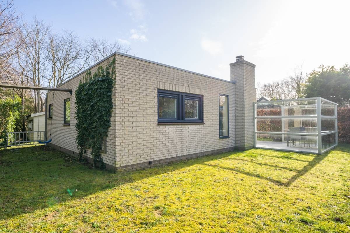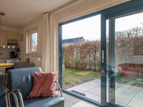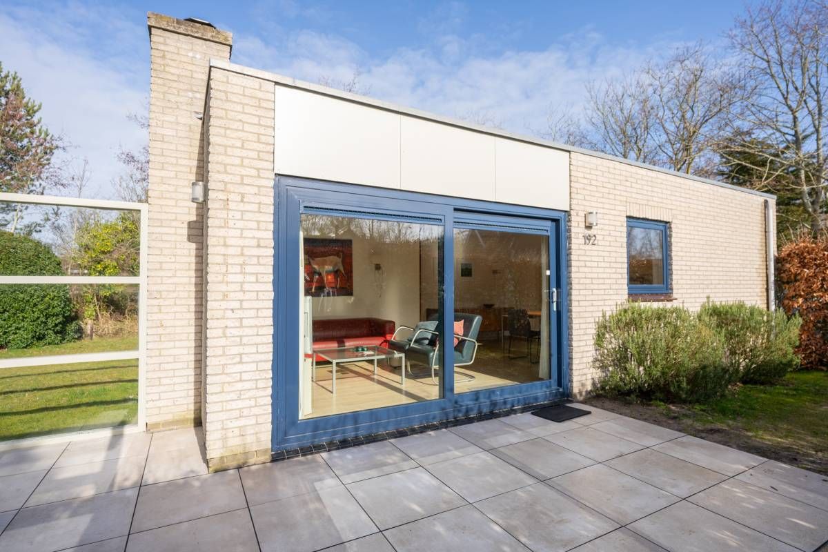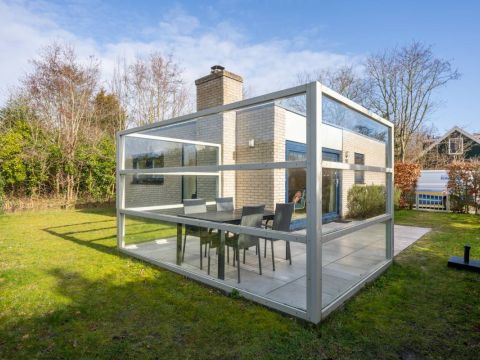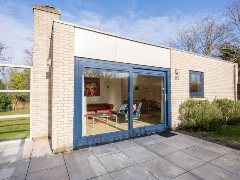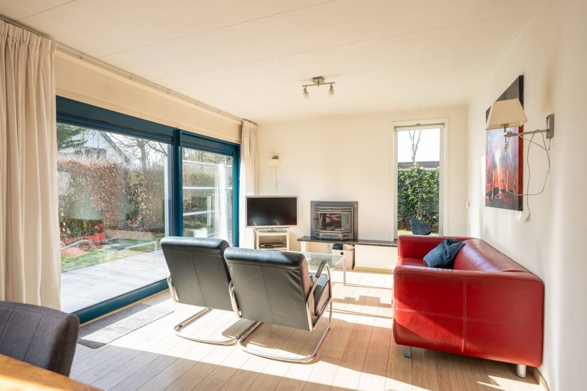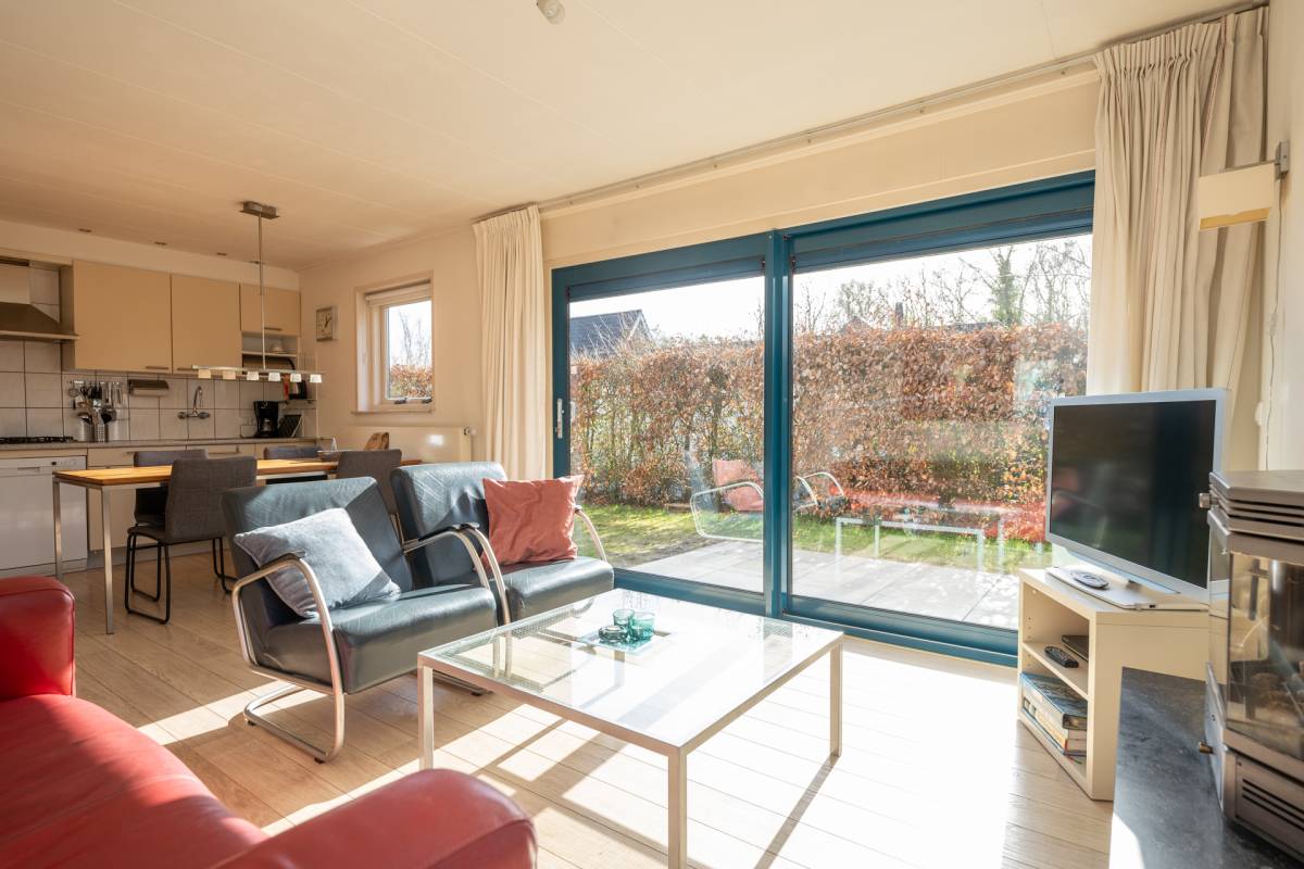 Rondom de bungalow ligt een royale tuin met veel groen en privacy. Het terras is grotendeels voorzien van een wind-glasscherm, waardoor u hier beschut kunt genieten van de zon.