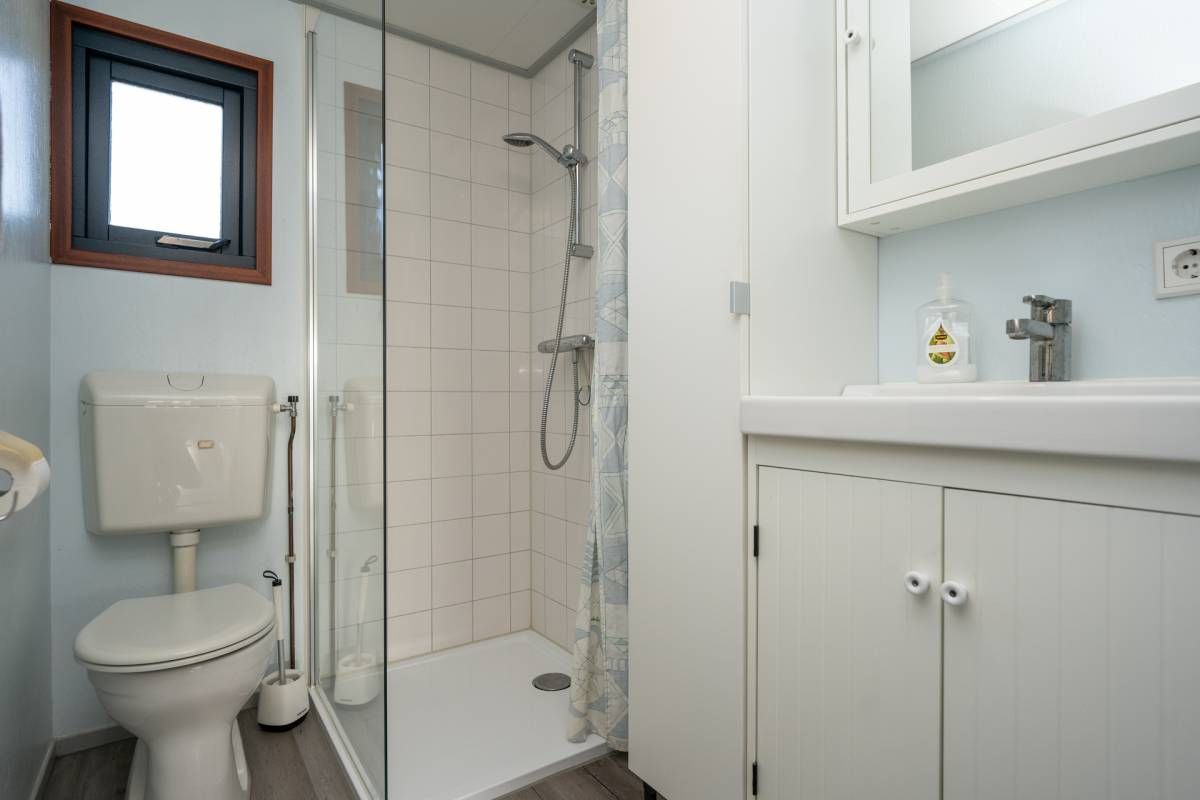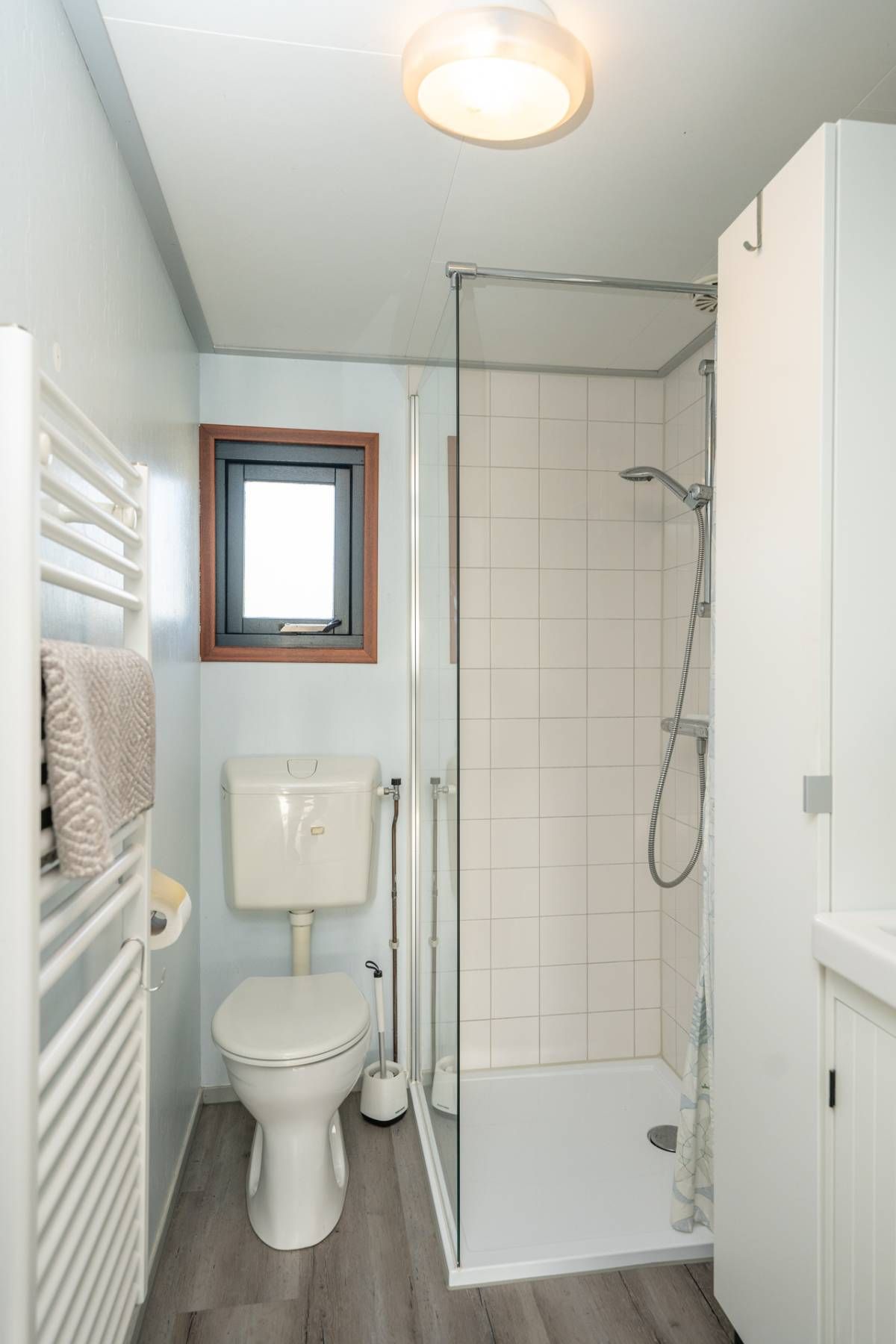 De badkamer is voorzien van een douche, toilet en een wastafelmeubel.