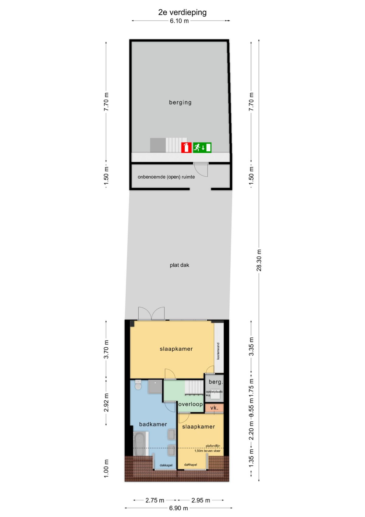 Overig 2e verdieping/zolder | 2 slaapkamers, badkamer, berging, voorraadkast, plat dak en bergruimte |