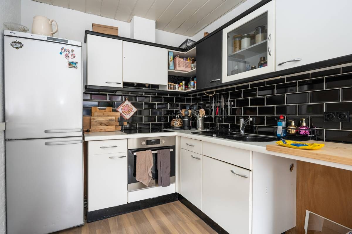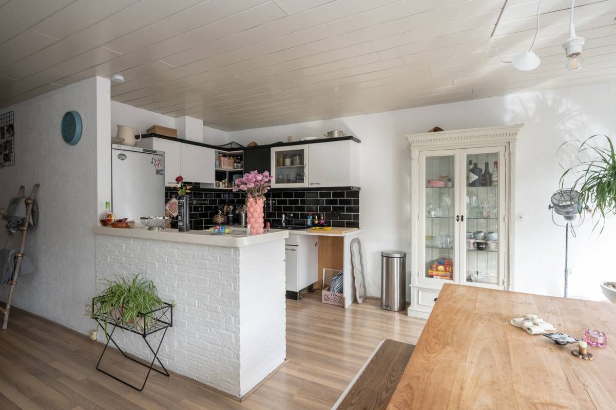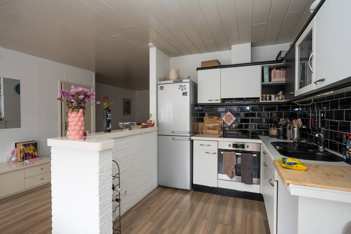 De nette open hoekkeuken is uitgerust met diverse inbouwapparatuur, waaronder een inductiekookplaat, oven en afzuigkap. De keuken wordt subtiel gescheiden van de woonkamer door een laag muurtje, wat zorgt voor een speelse indeling.