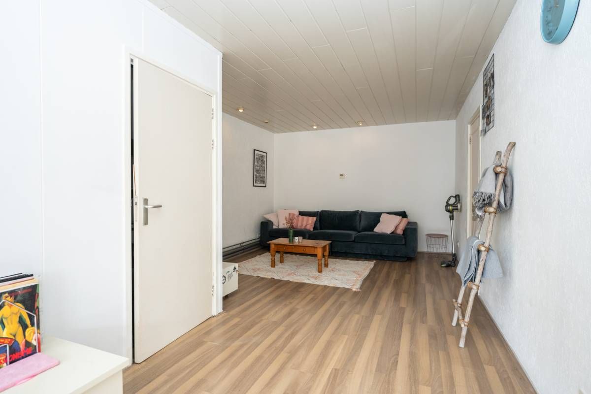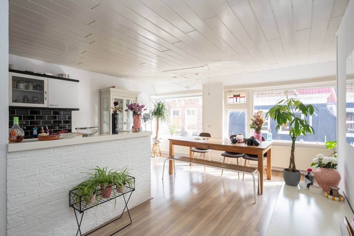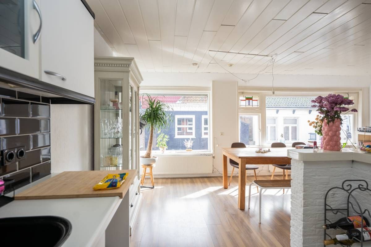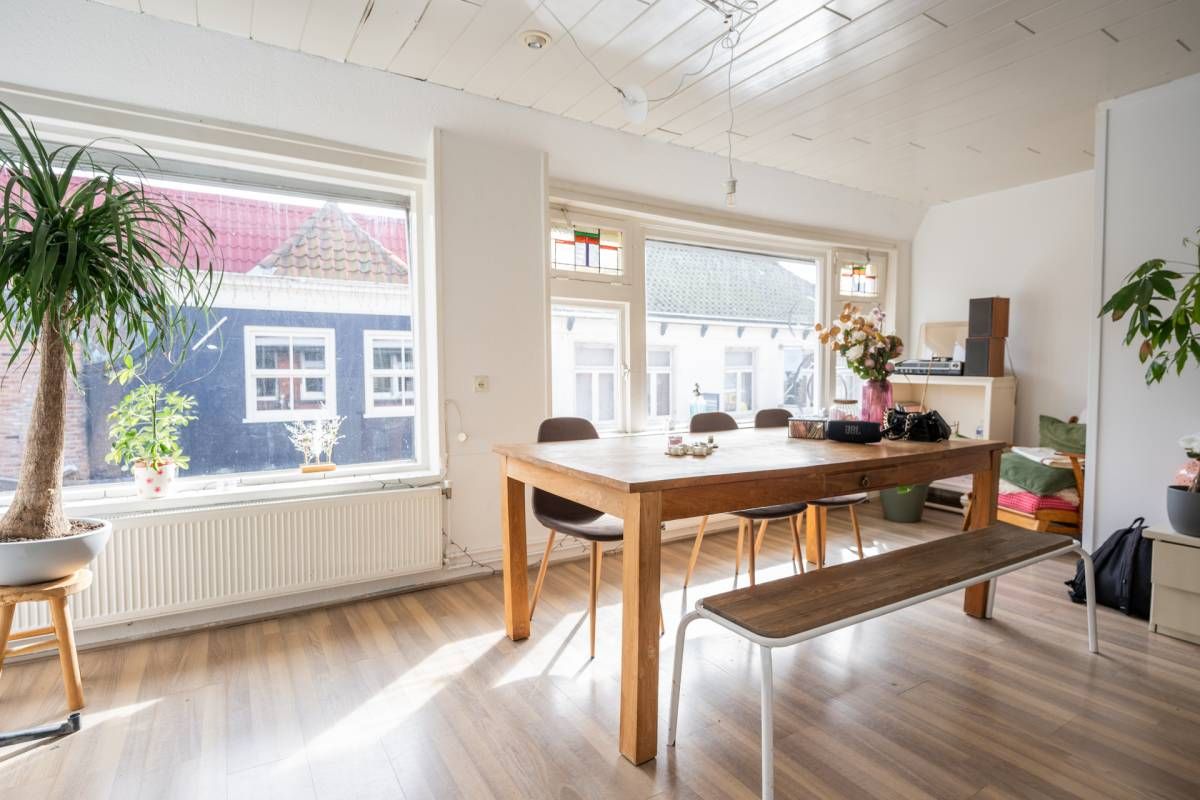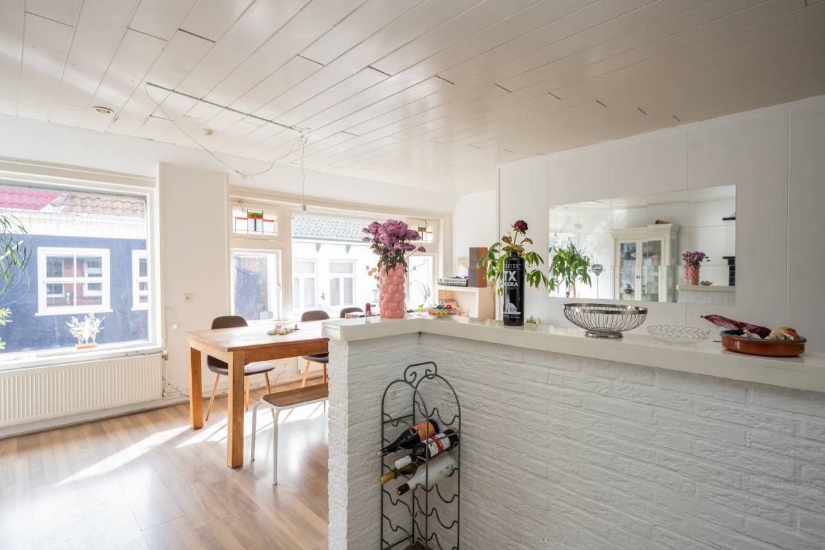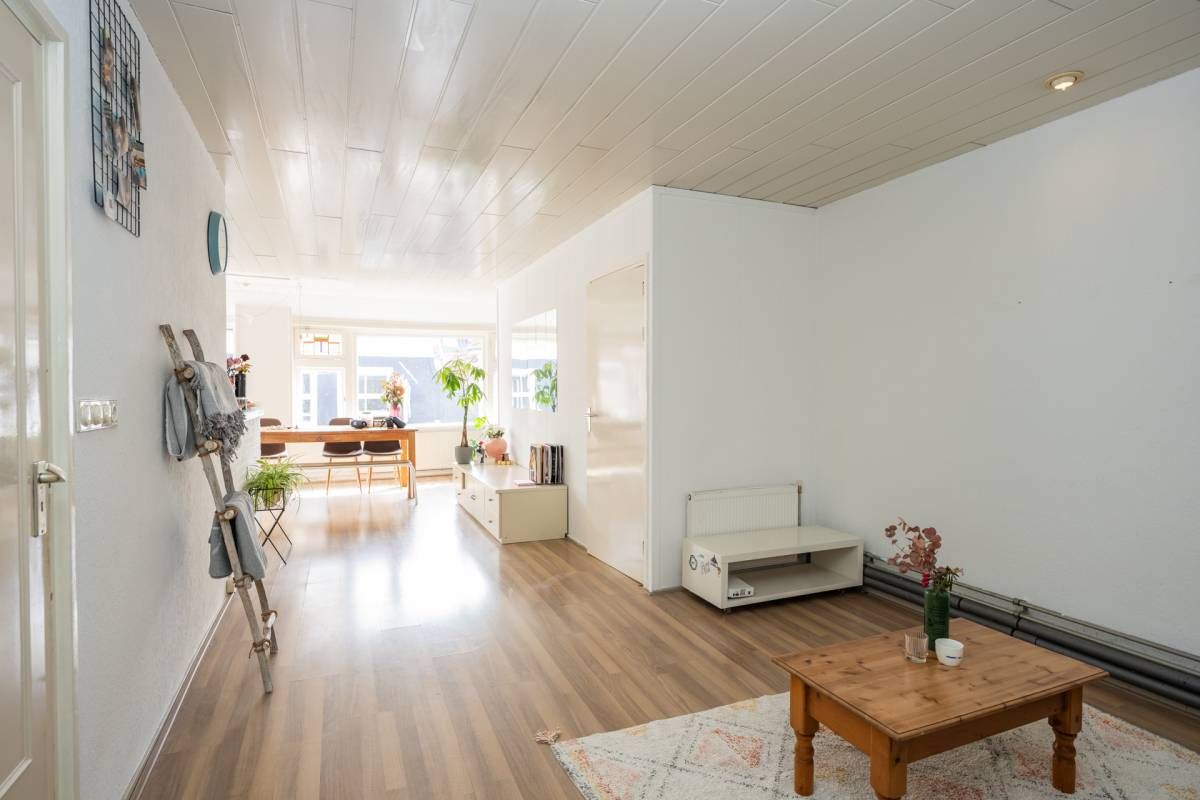 De bovenwoning beschikt over een eigen, zelfstandige opgang. Op de eerste verdieping bevindt zich een lichte woonkamer met open keuken. Grote raampartijen zorgen voor een prettige lichtinval en een ruimtelijk gevoel, met zicht op de straat.