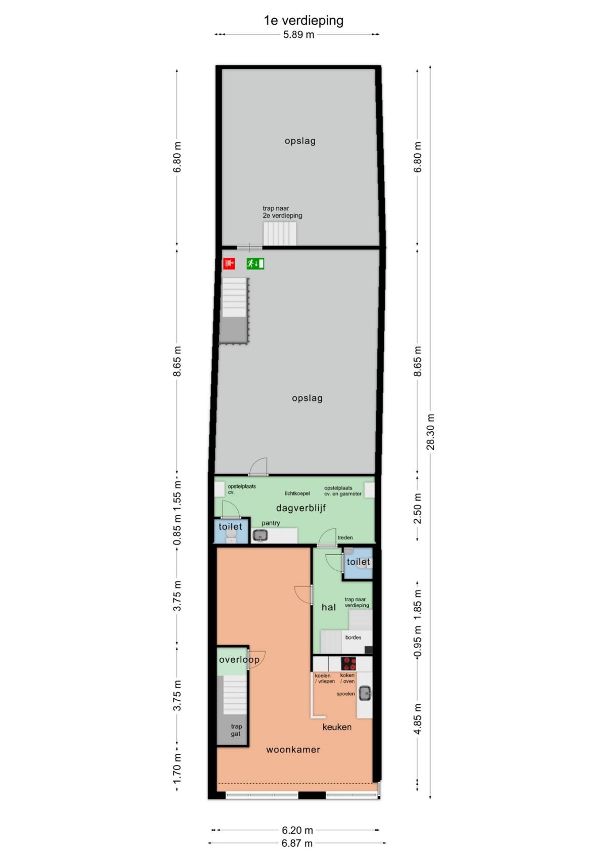 Overig 1e verdieping | Woonkamer, open keuken, toilet, 2 x opslagruimte |
