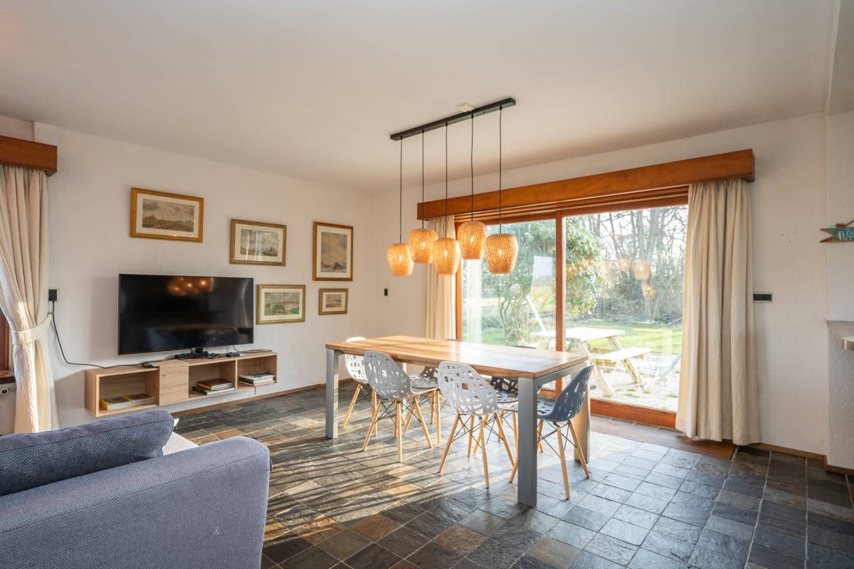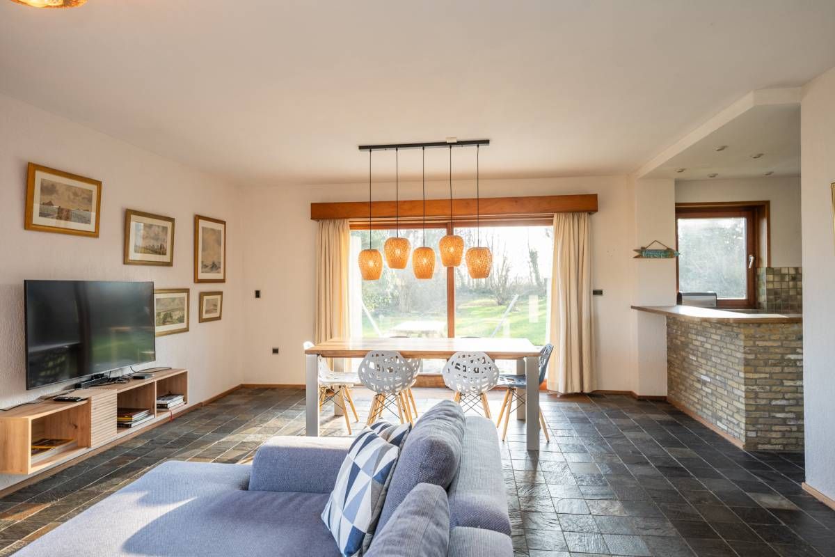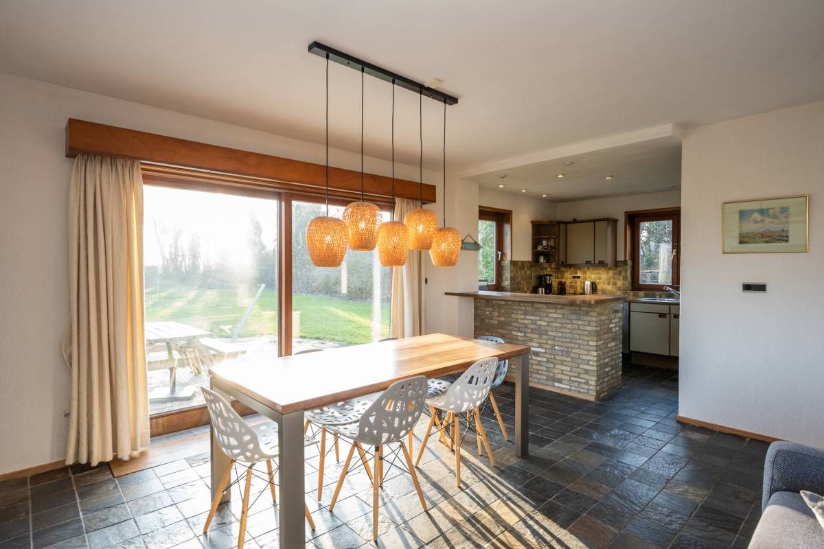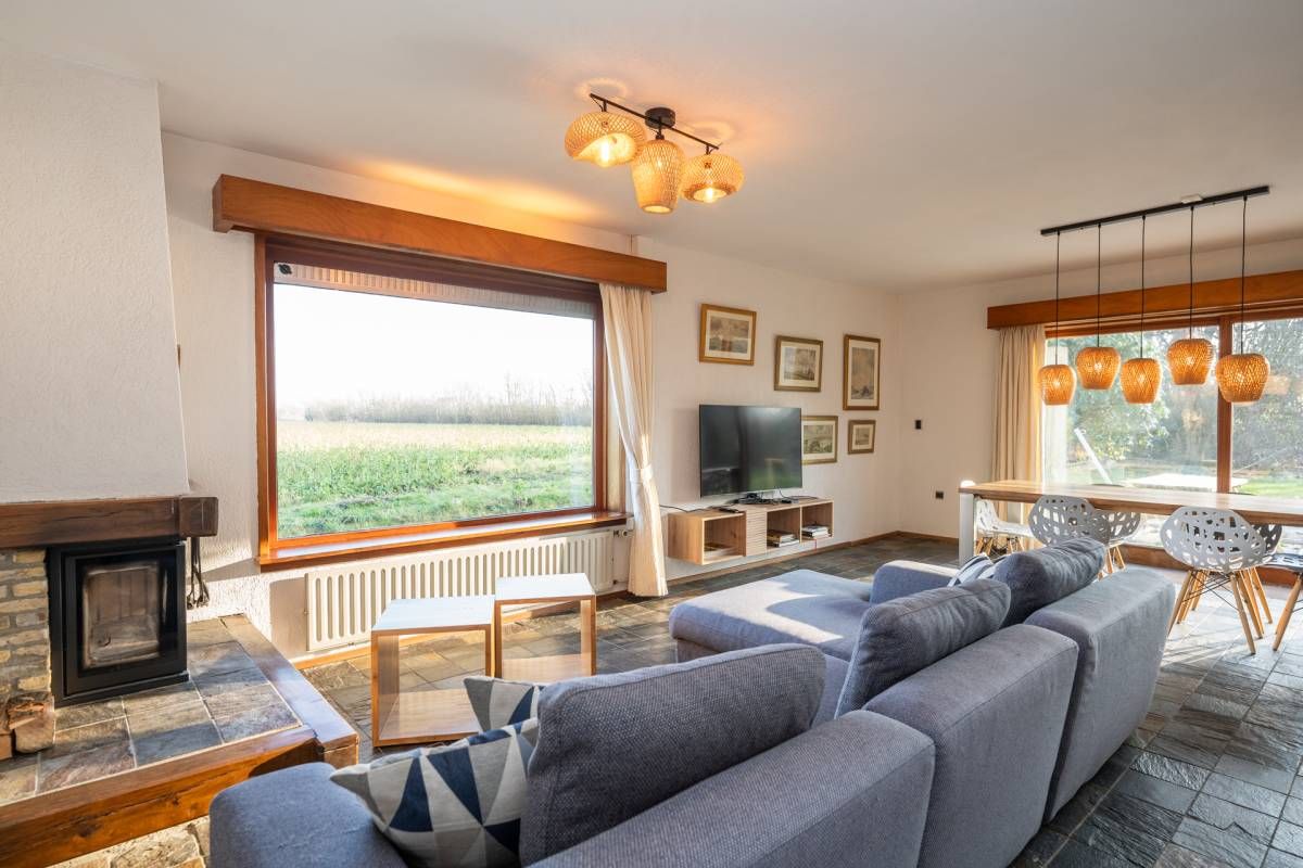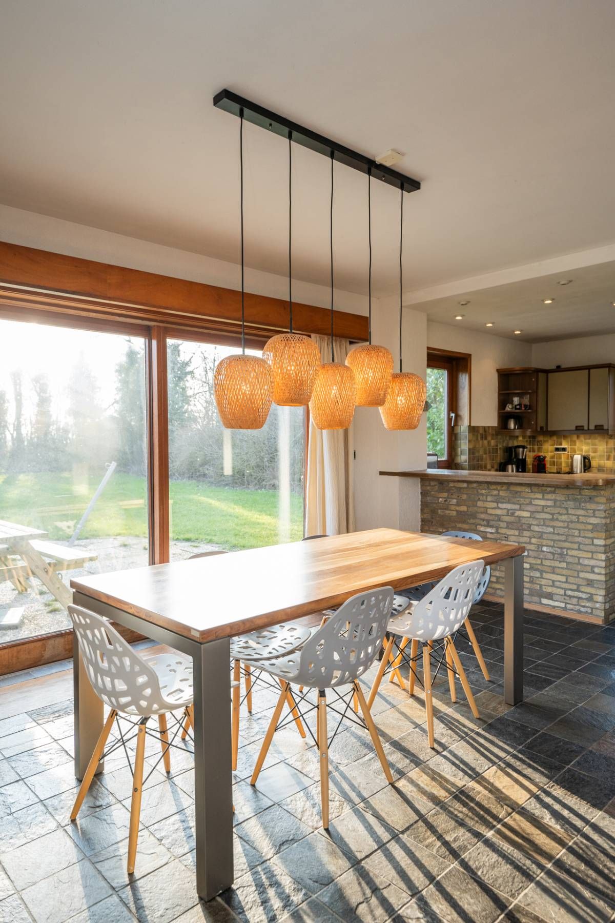 De open woonkamer vormt het warme hart van de woning. Dankzij de grote raampartijen geniet u hier van een prachtige, zonnige lichtinval en een vrij uitzicht over de omliggende natuur. De ruimte voelt open en tegelijk knus aan. De zithoek beschikt over een heerlijke open haard.