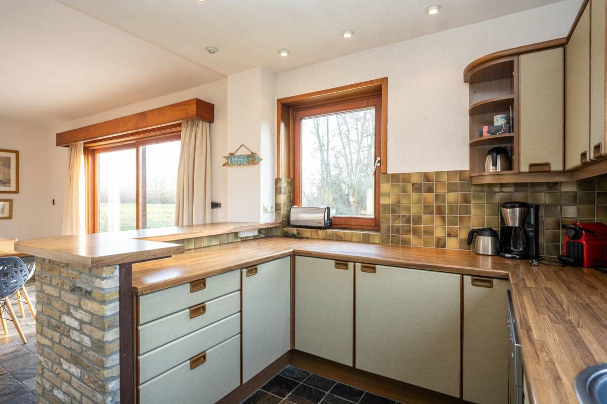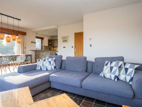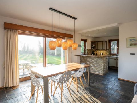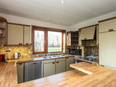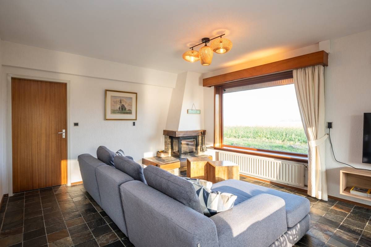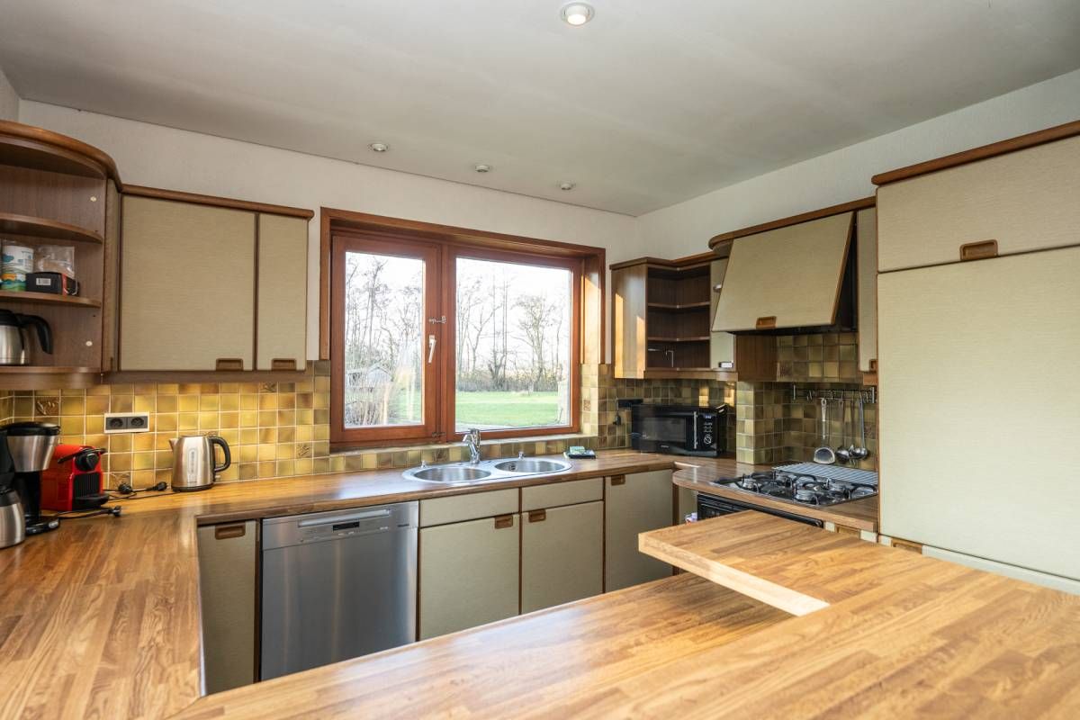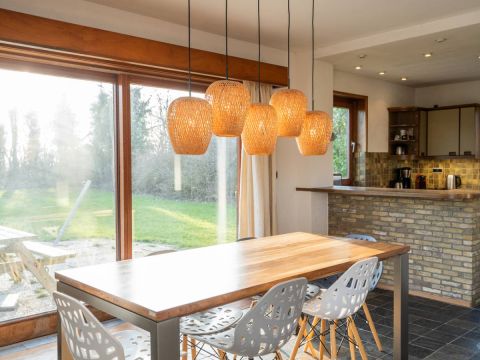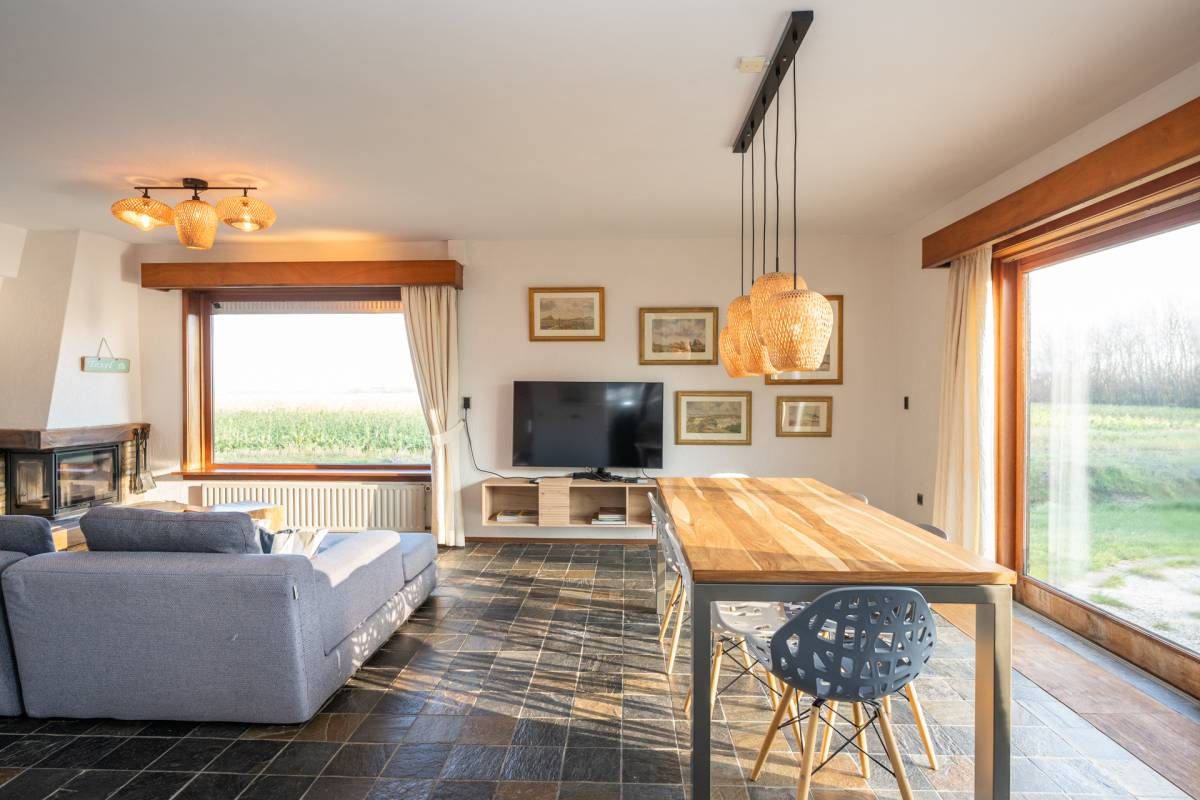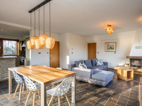 De open woonkamer vormt het warme hart van de woning. Dankzij de grote raampartijen geniet u hier van een prachtige, zonnige lichtinval en een vrij uitzicht over de omliggende natuur. De ruimte voelt open en tegelijk knus aan. De zithoek beschikt over een heerlijke open haard.