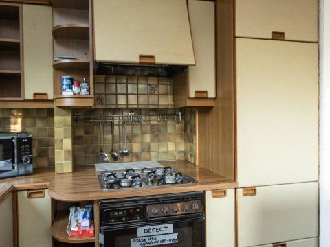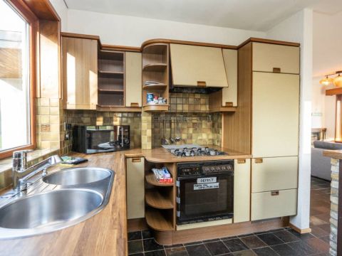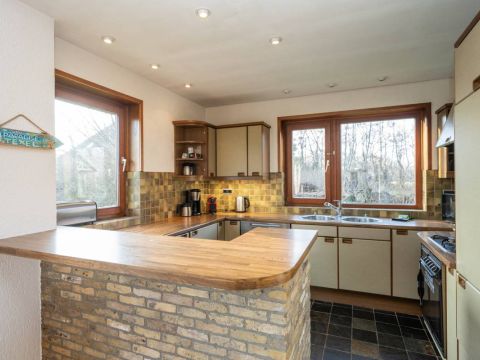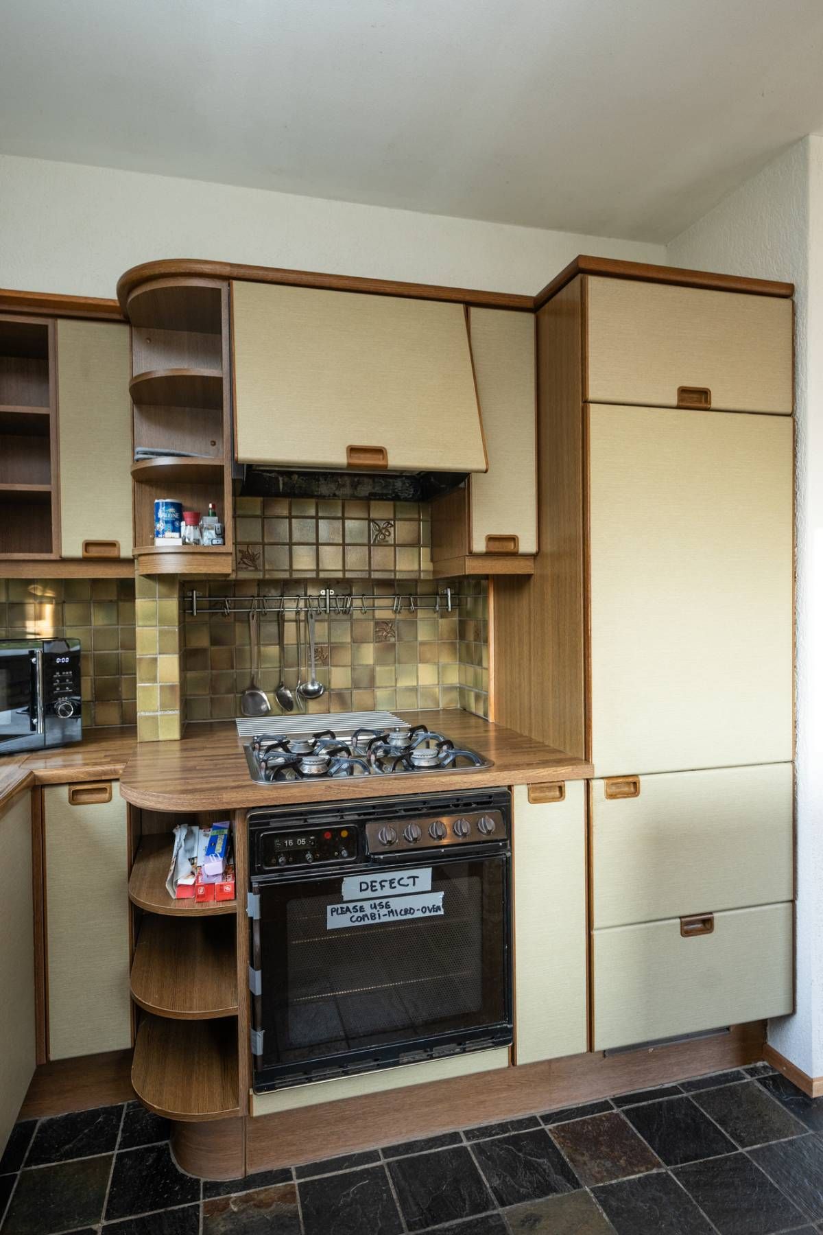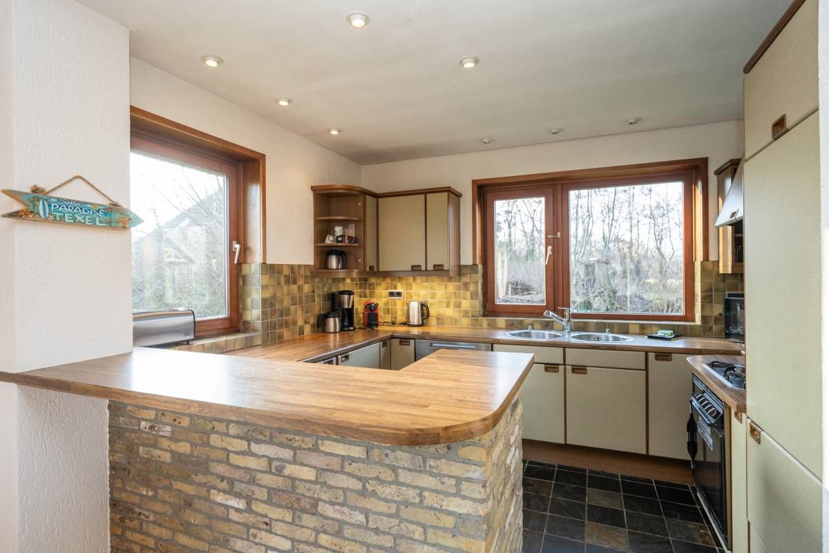 De hoekkeuken is eenvoudig maar netjes onderhouden en praktisch ingedeeld. Een charmant barretje maakt de keuken tot een gezellige plek voor een ontbijt, een kop koffie of een goed gesprek tijdens het koken. De keuken is voorzien van diverse gemakken, waaronder een vaatwasser, gaskookplaat, koel– vriescombinatie, oven en biedt voldoende werk- en bergruimte.