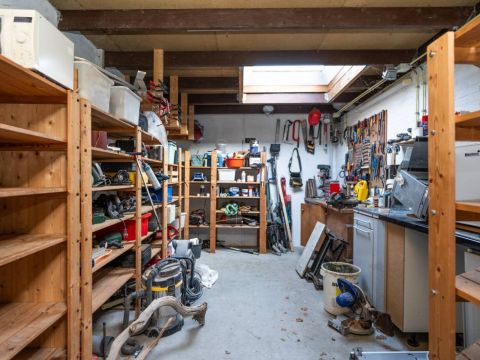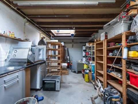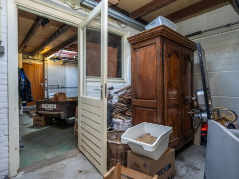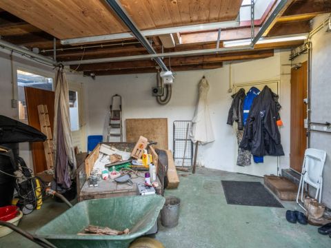 Aansluitend aan de woning bevindt zich een riante garage, ideaal voor opslag, hobby’s of kluswerkzaamheden. De garage is voorzien van een lichtkoepel voor natuurlijk daglicht en een overheaddeur.
