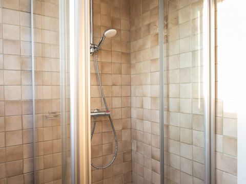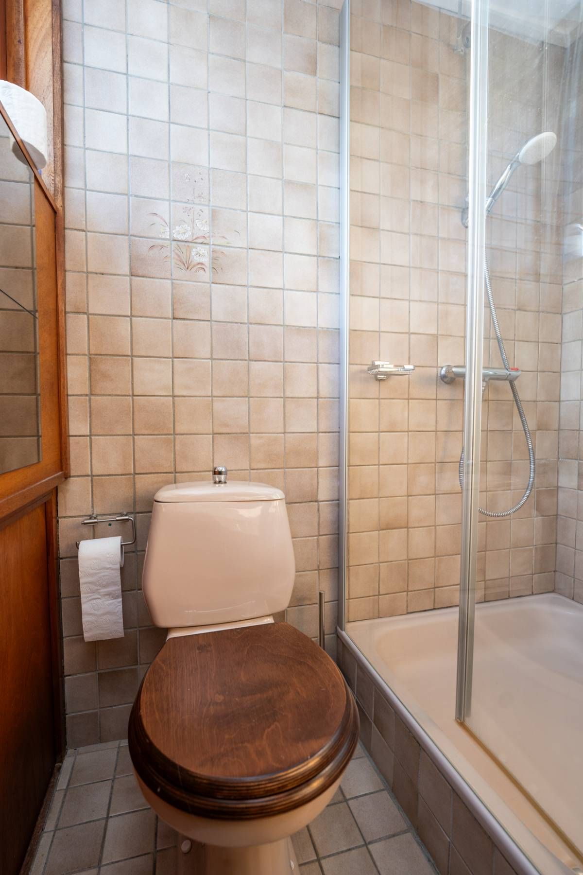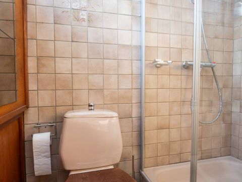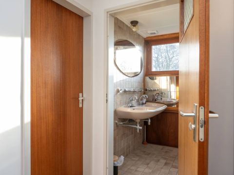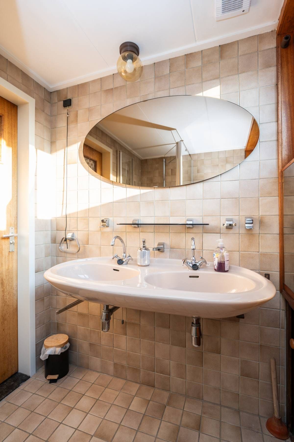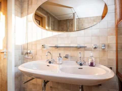 De badkamer is eenvoudig maar functioneel en beschikt over een douche, dubbele wastafel en een toilet.