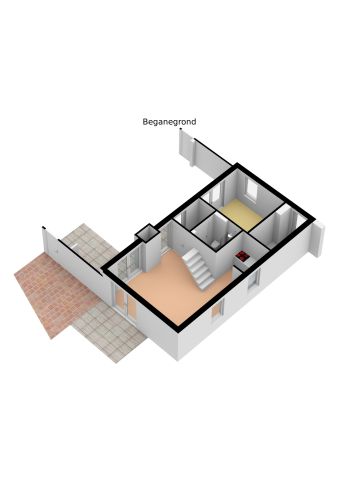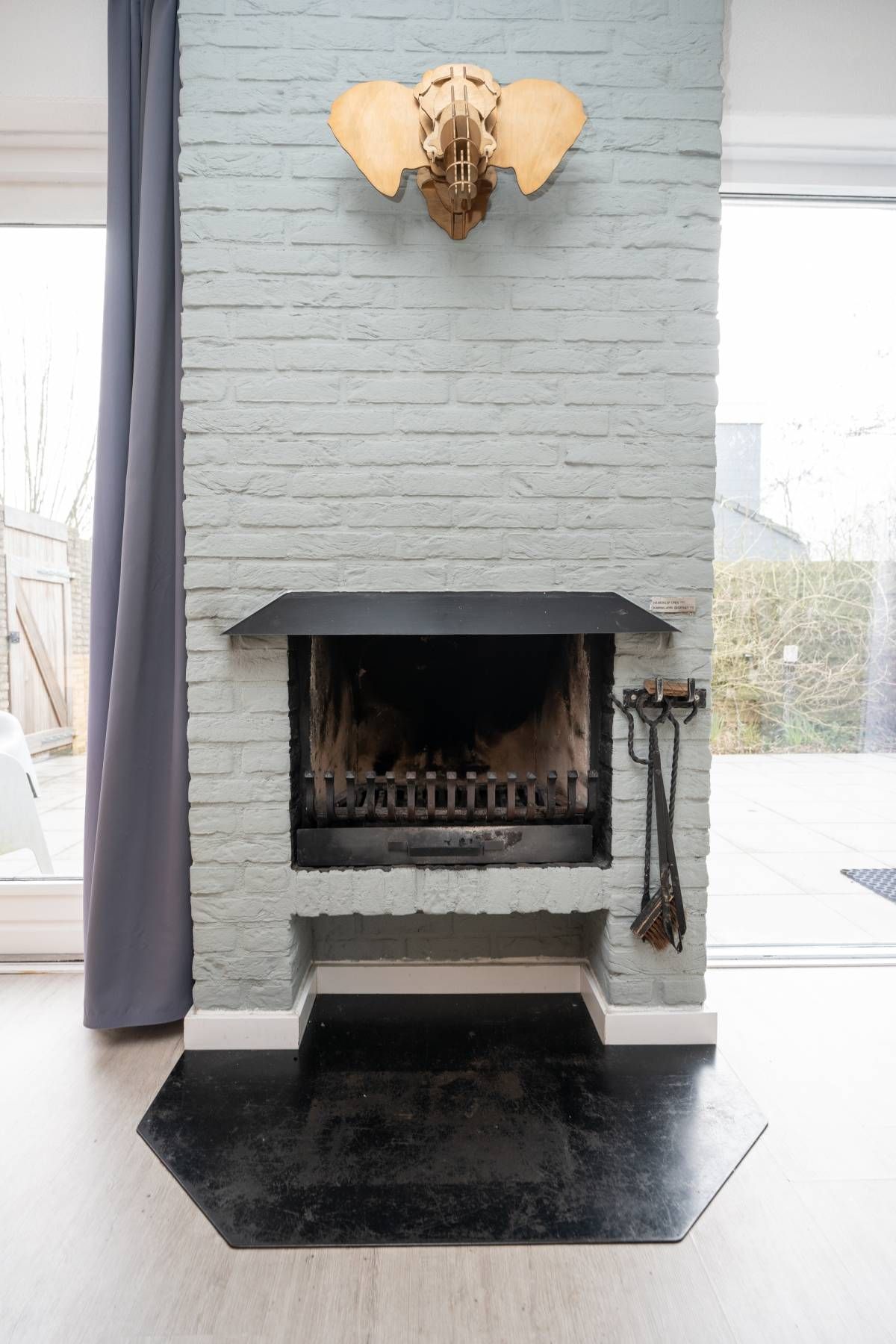 Hal/entree, slaapkamer, moderne badkamer met douchecabine, toilet en wastafel. Doorloop naar de woonkamer met open haard en openslaande deuren naar terras.