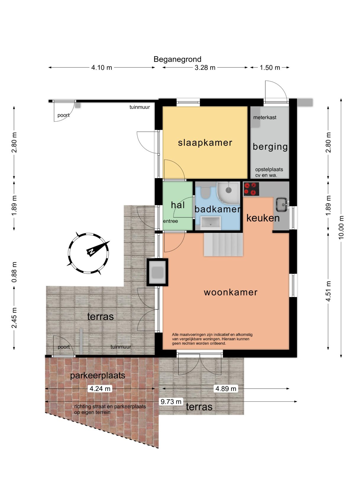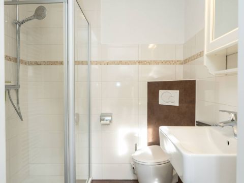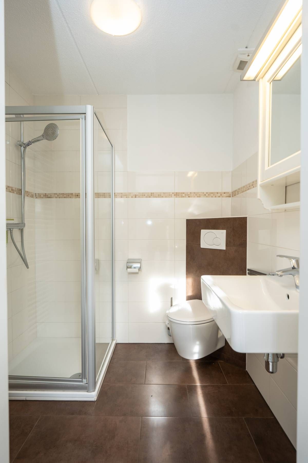 Op de begane grond is een fijne slaapkamer met ruime kledingkast en een nette badkamer voorzien van wastafel, douchecabine en toilet.