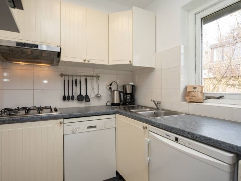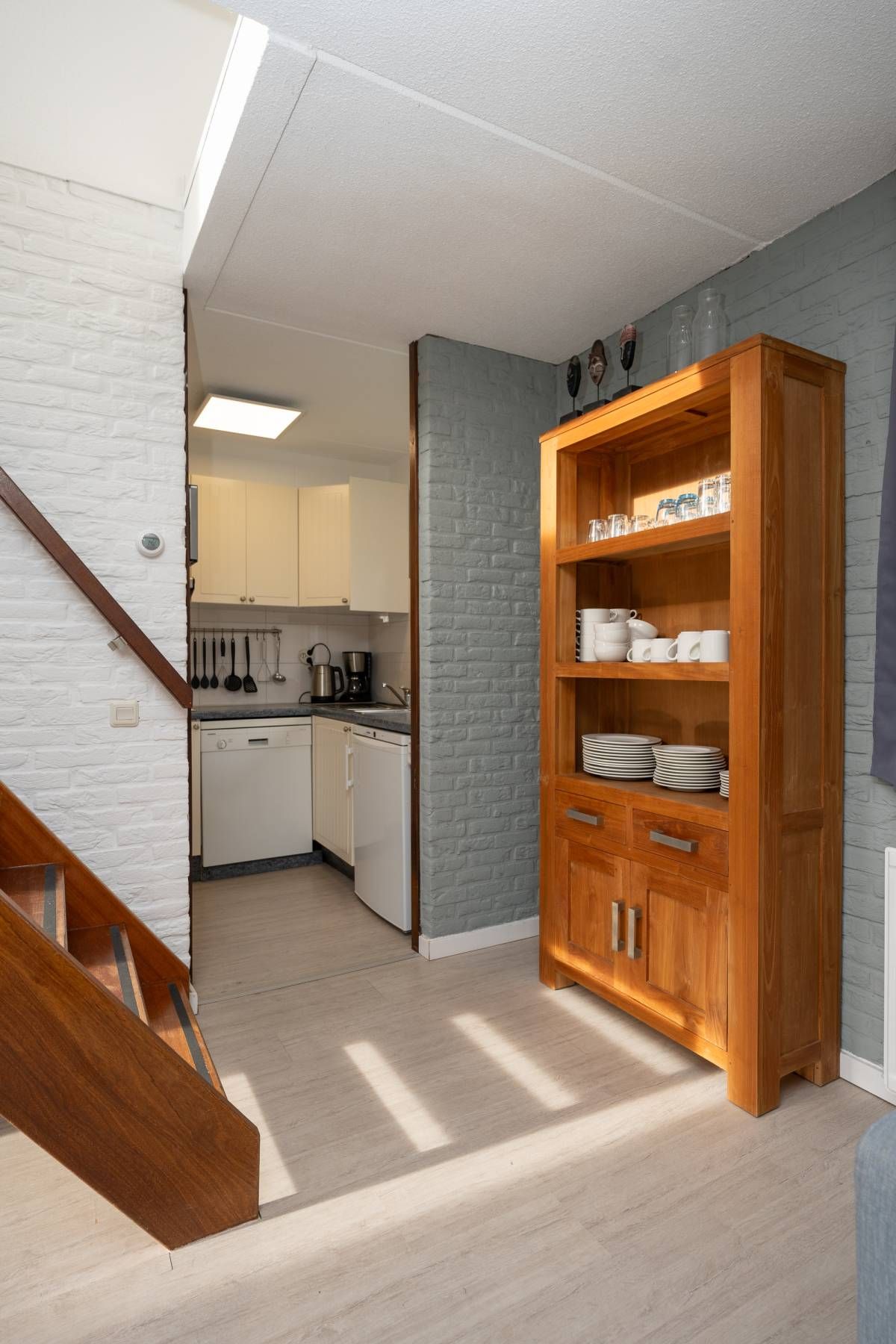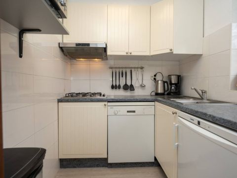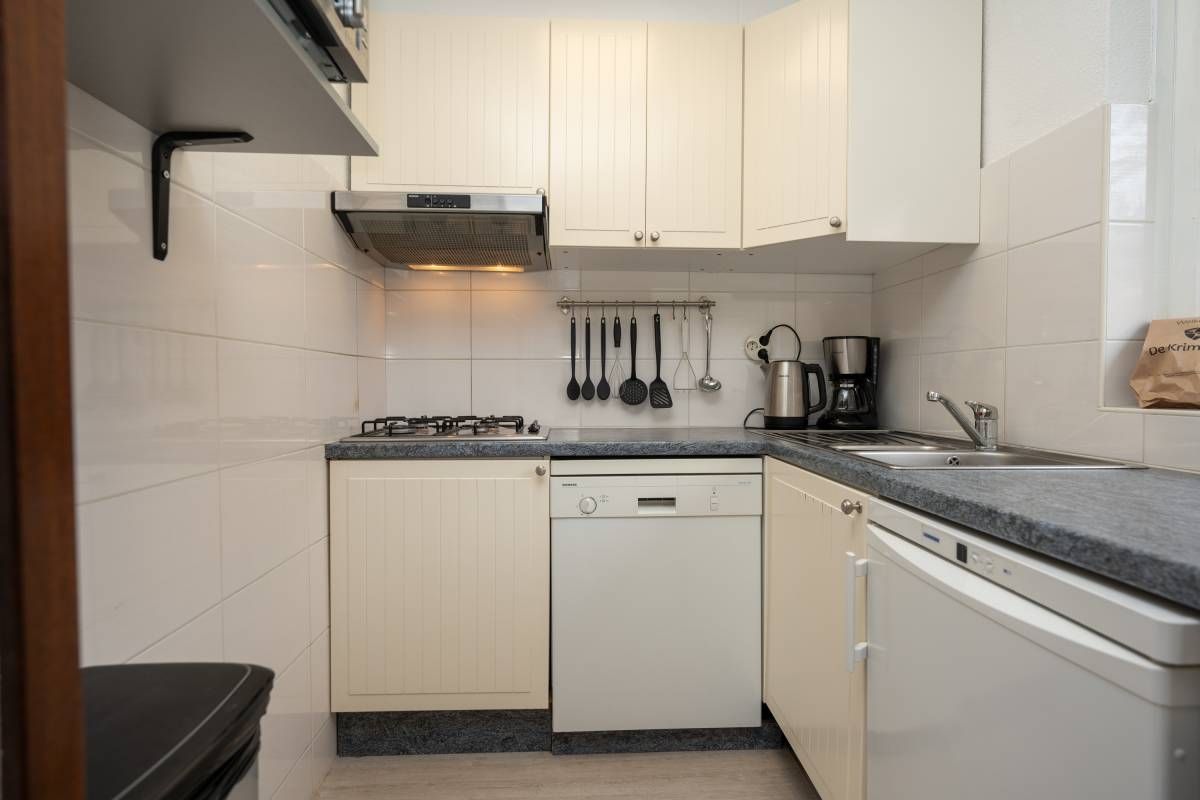 De half openkeuken is uitgerust met een 4-pits gaskookplaat, afwas machine en koelkast.