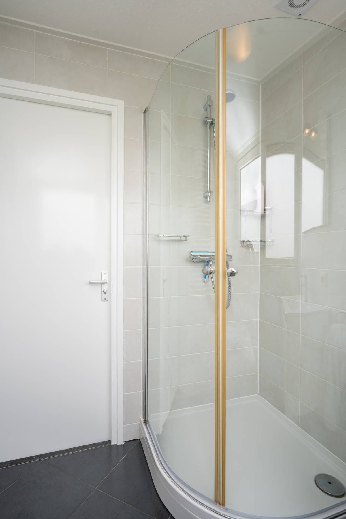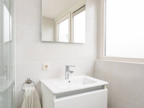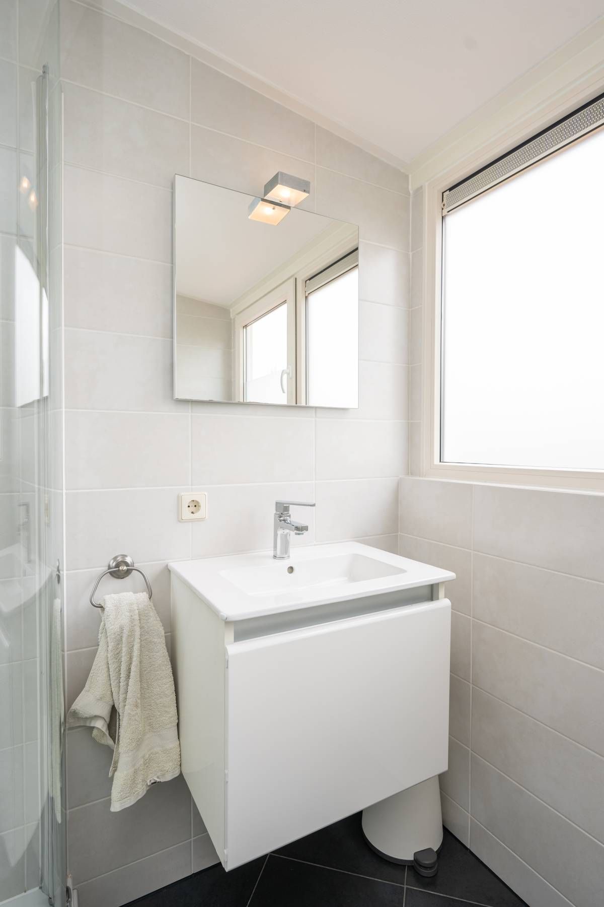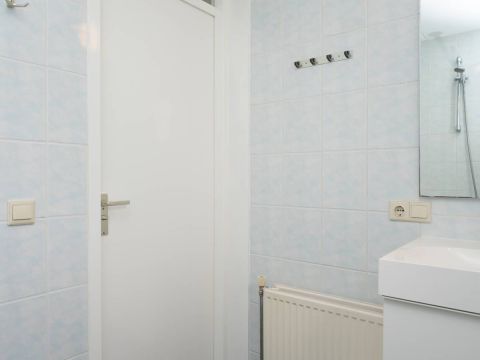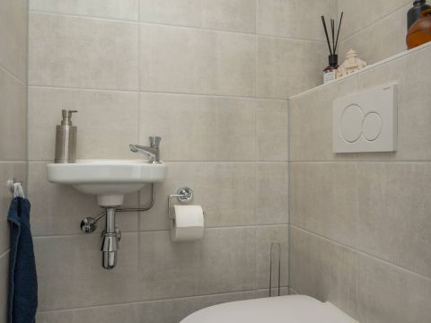 De heerlijke badkamer op de verdieping is uitgerust met een wastafelmeubel, een toilet en een douchecabine.