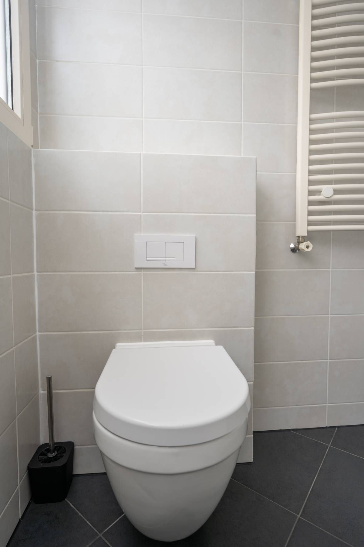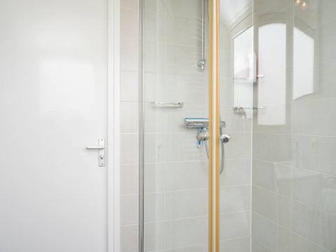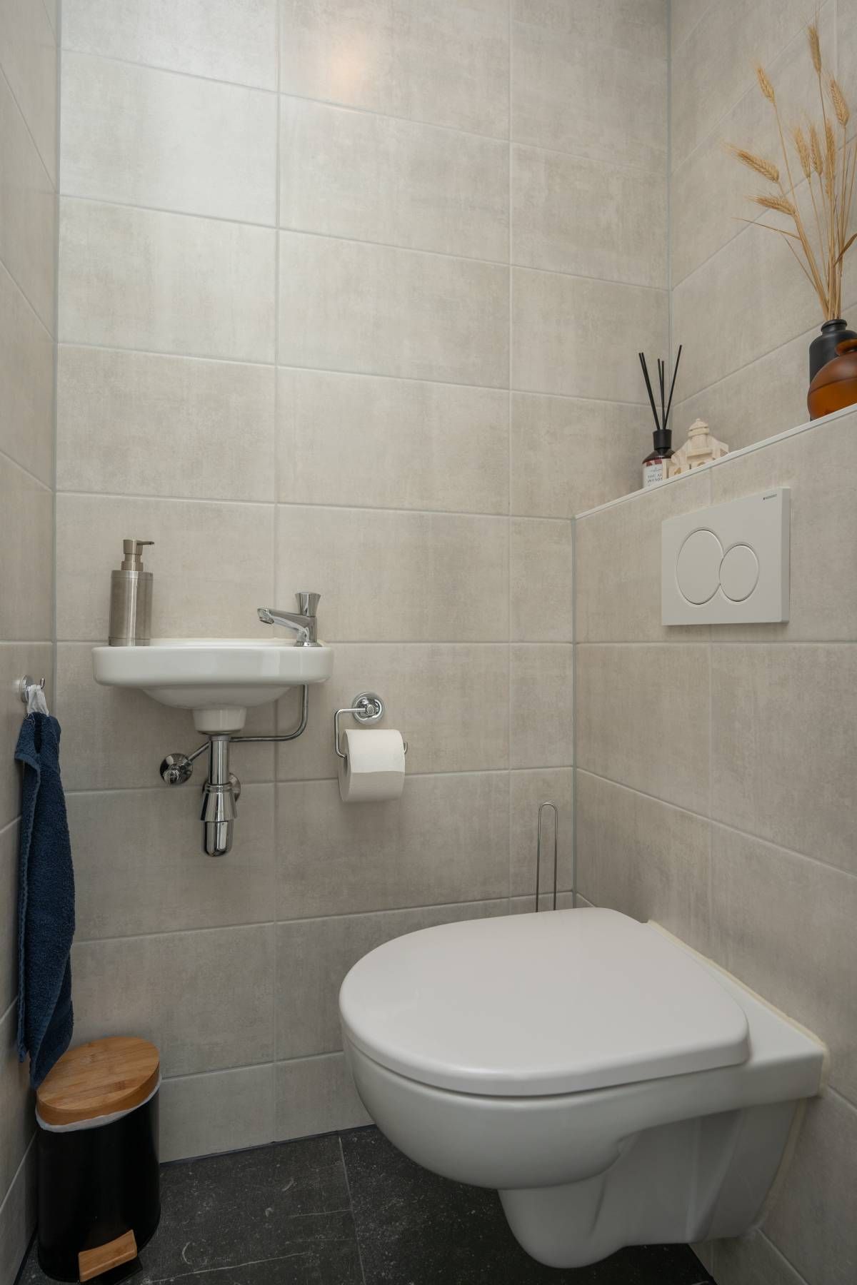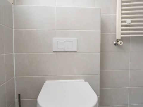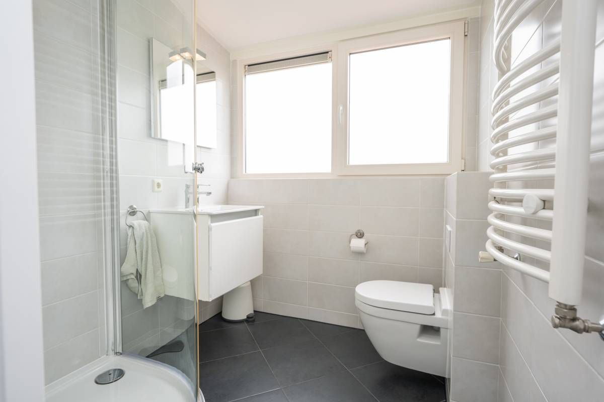 De heerlijke badkamer op de verdieping is uitgerust met een wastafelmeubel, een toilet en een douchecabine.