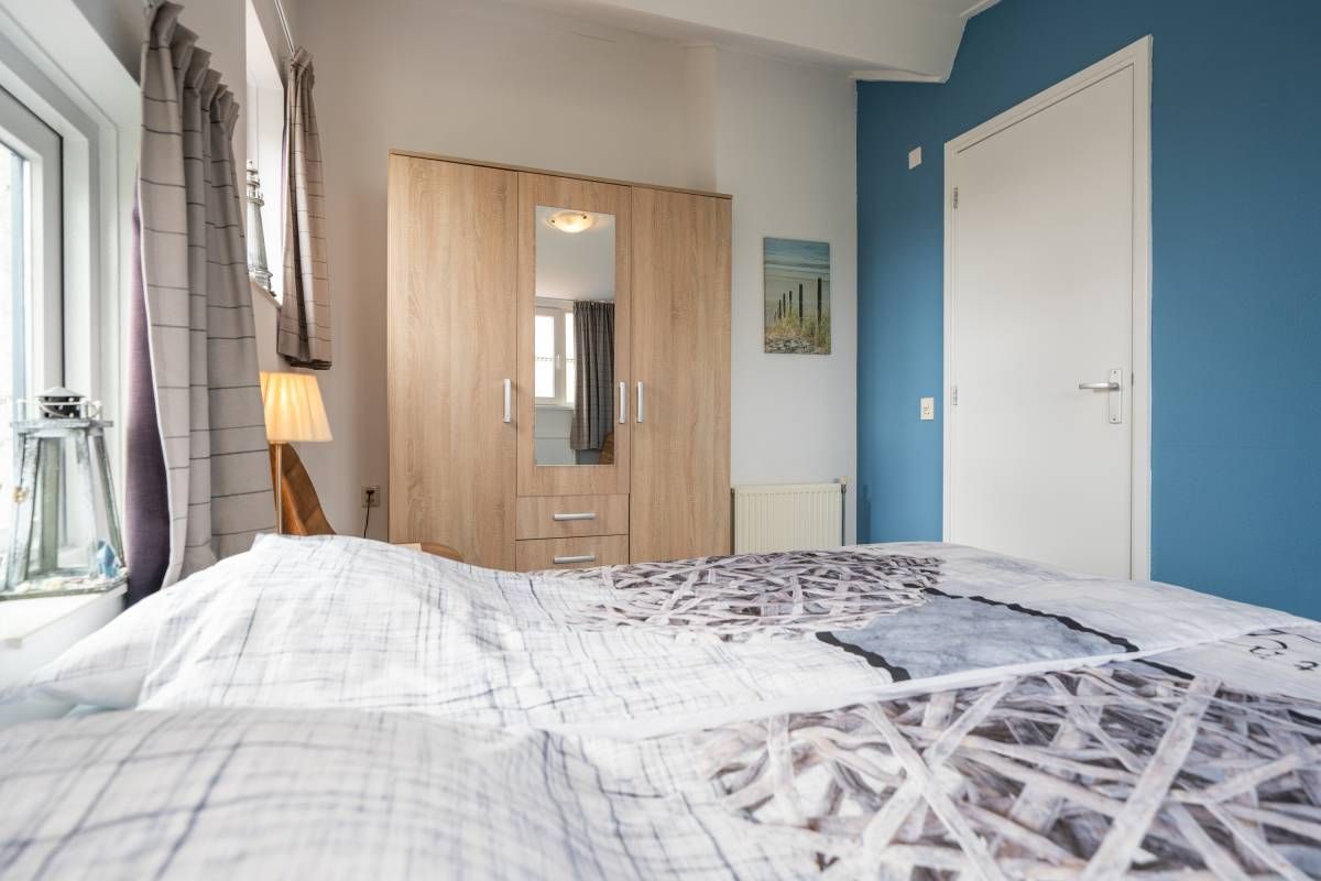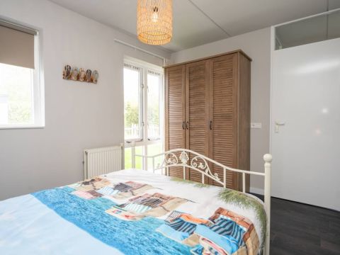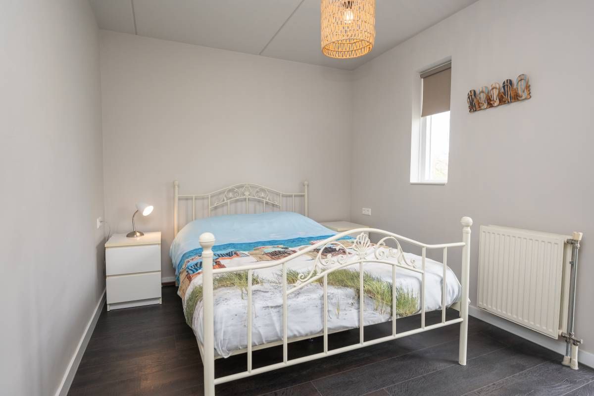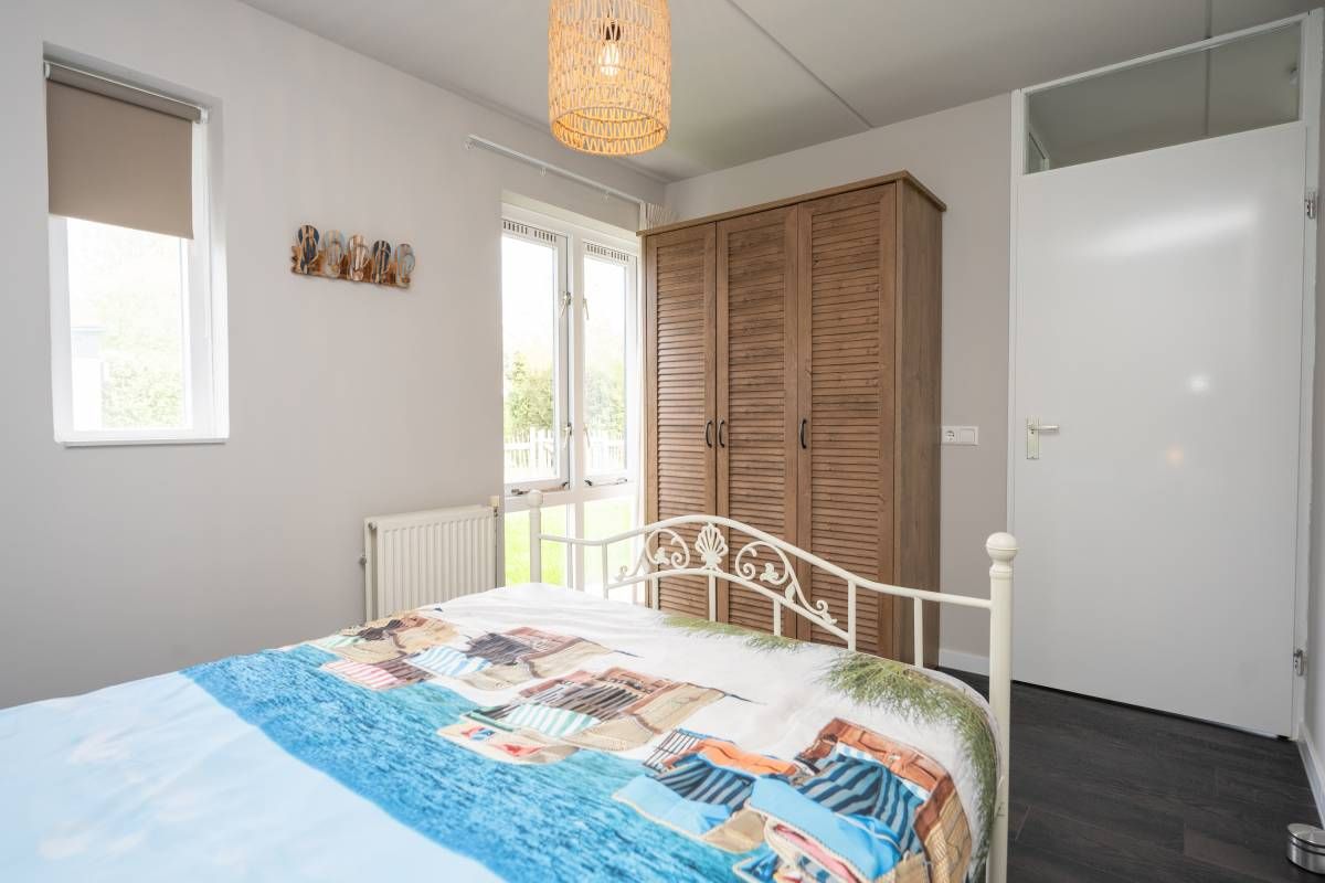 De slaapkamer op de begane grond is uitgerust met een tweepersoonsbed en biedt uitzicht op de tuin.